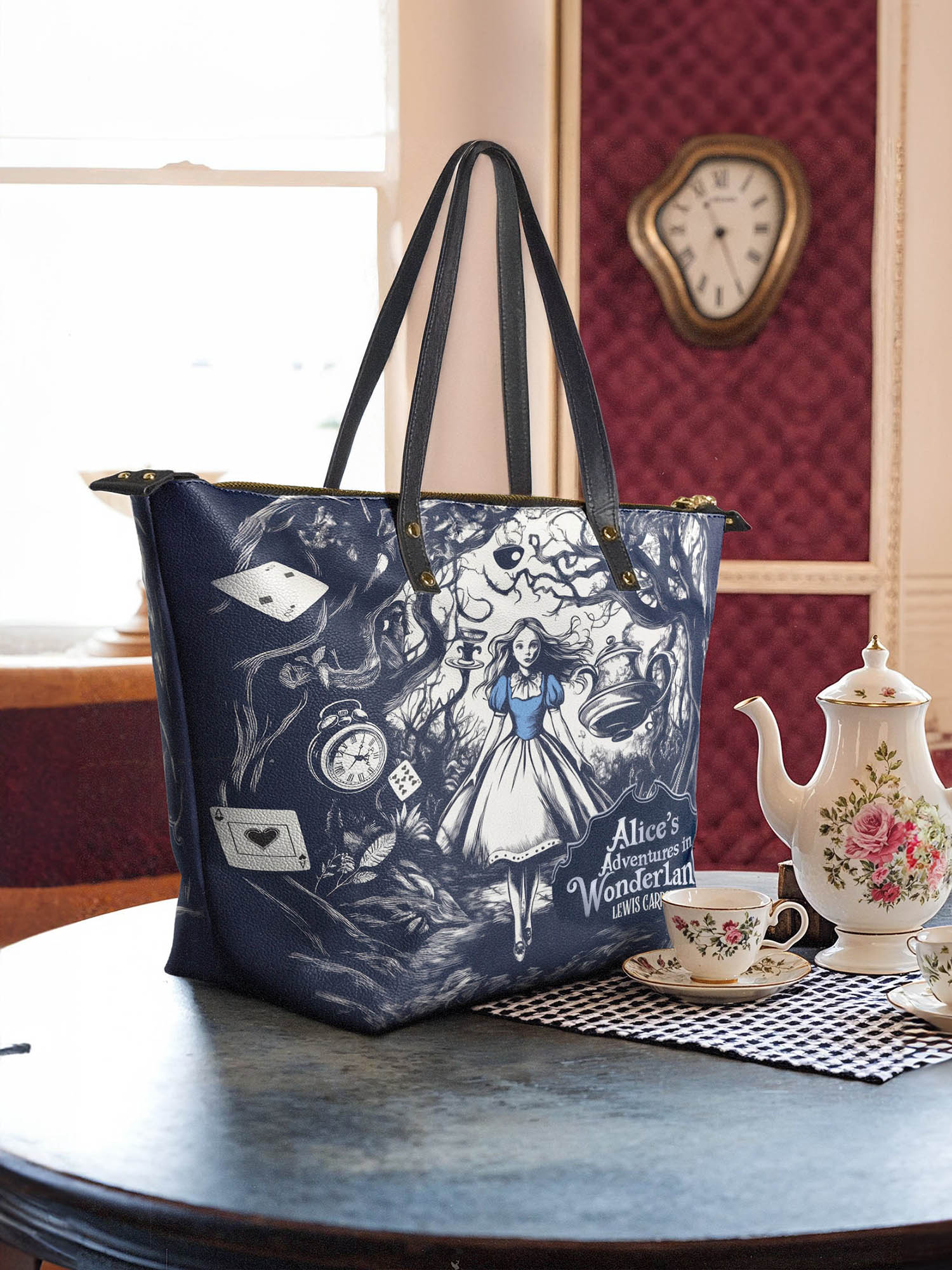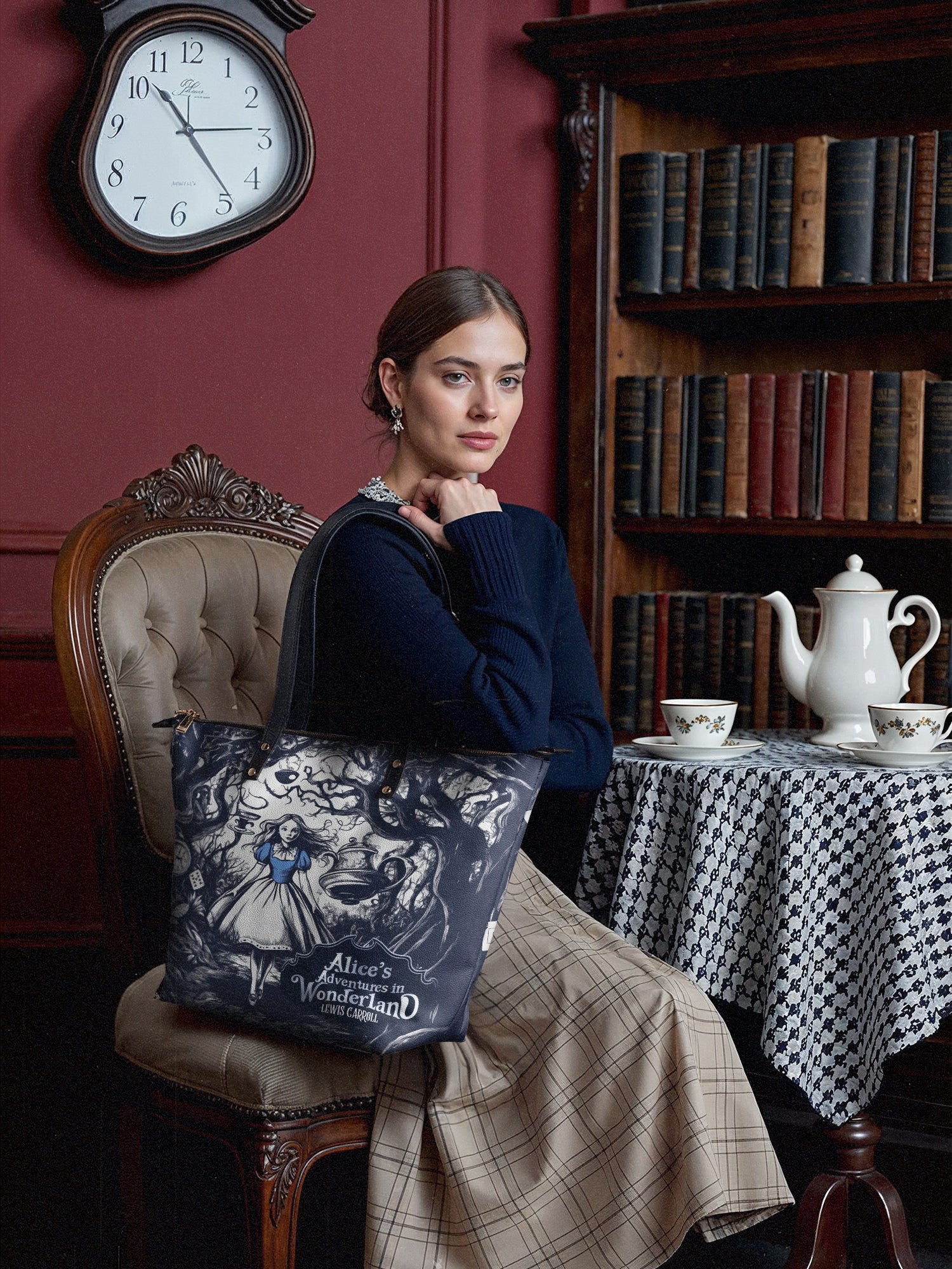 This Alice’s Adventures in Wonderland Leather Tote is made for dreamers, book lovers, and anyone who loves a little magic. The eerie, storybook design pulls you right into Wonderland—Alice lost in the woods, cards floating, time ticking away. It’s roomy, durable, and made from high-quality leather, with sleek black handles and gold hardware for a touch of elegance. Perfect for carrying books, daily essentials, or a bit of Wonderland wherever you go.