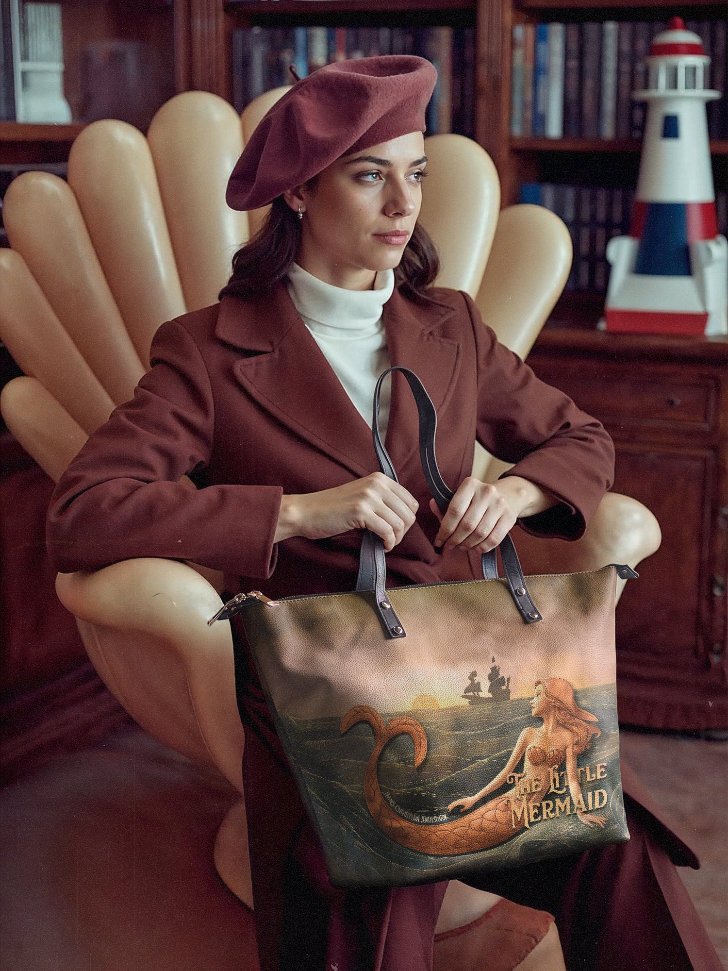This Little Mermaid Leather Tote is a fairytale come to life. The vintage-style design captures a golden-haired mermaid gazing at a distant ship, lost in dreams of adventure. With deep ocean waves, a glowing sunset, and a soft storybook feel, it’s timeless and enchanting. Made from high-quality leather with sleek black handles and gold details, this tote is perfect for book lovers, ocean dreamers, and anyone who believes in magic beneath the waves.