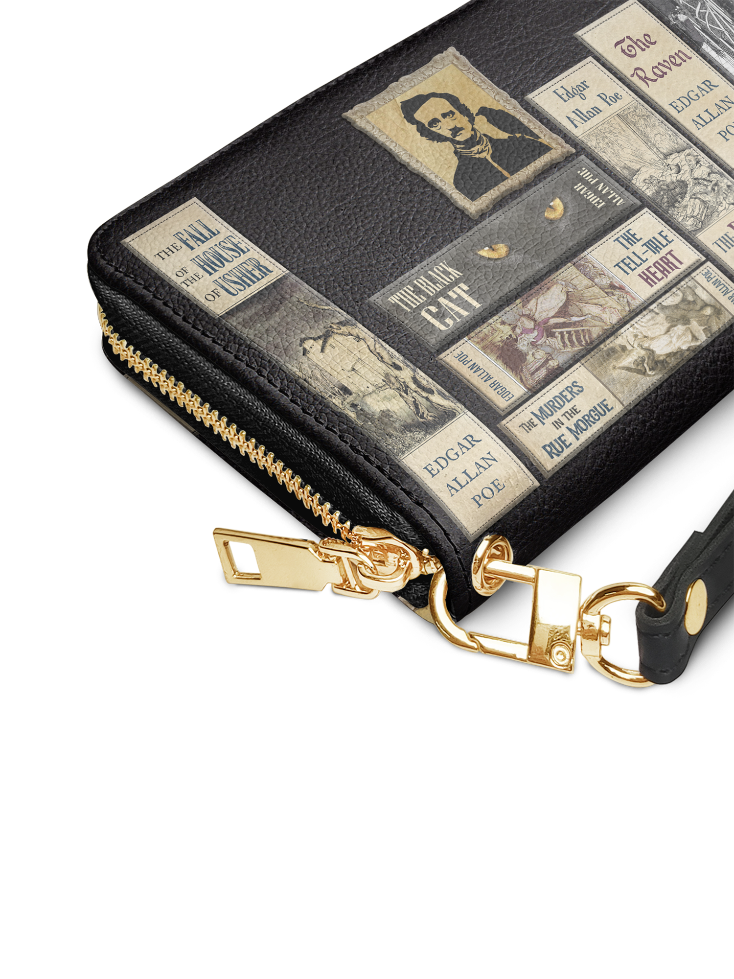So I ordered a wallet. The " Poe Library" in ashen black. I already had a purse and really didn't think I needed another one but I really needed a new wallet.. But the problem was I really wanted the "Poes Library" in that gorgeous blue. So I did what anybody else would do the next day.I ordered it and the matching wallet. I got them all the same day.I fell in love with my blue purse! All my favorite stories ,the man himself , the blue, the black ....gorgeous. The interior, that soft yellow, Perfect! Enough room for everything that I need.