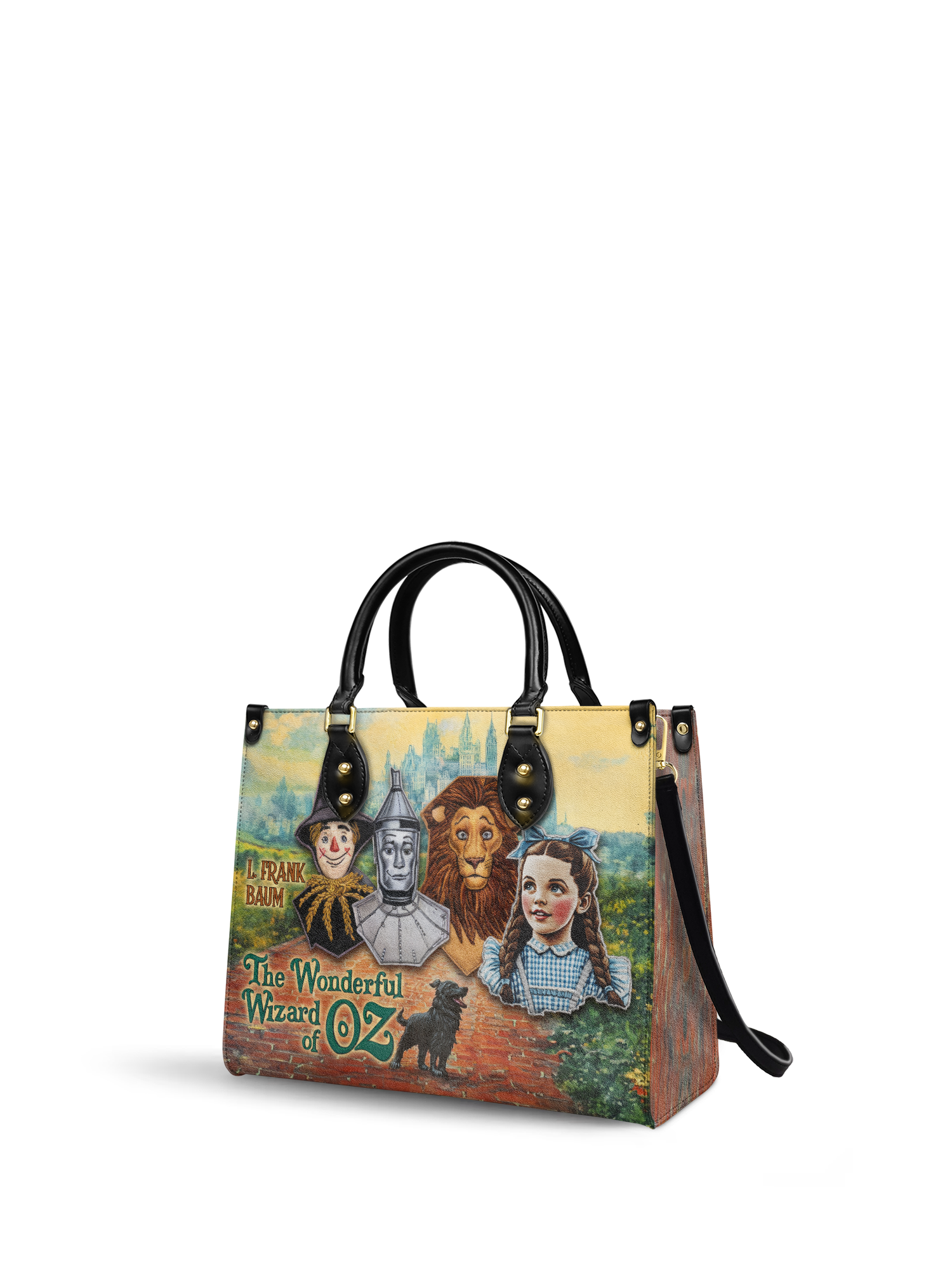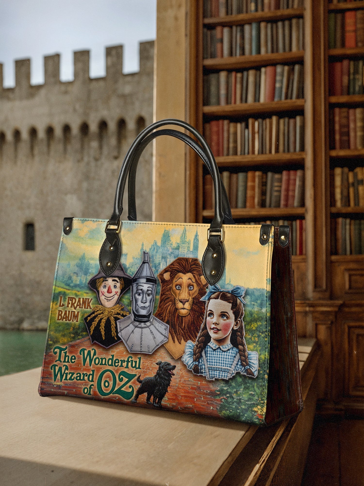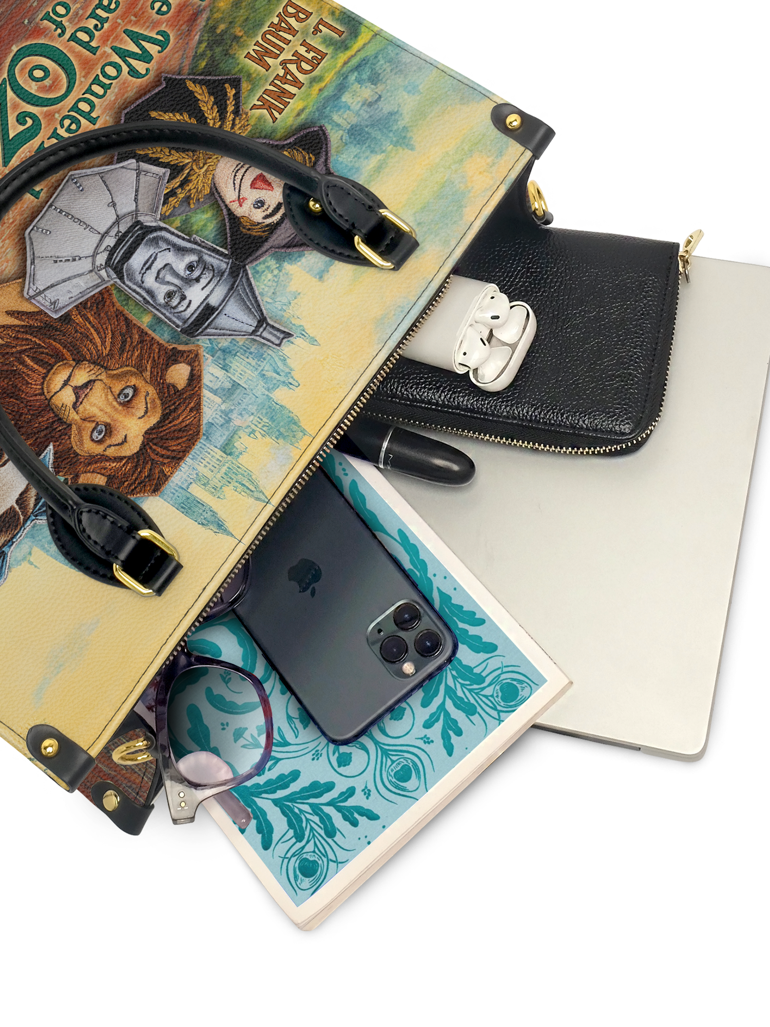 This Wonderful Wizard of Oz Leather Handbag is full of adventure, magic, and heart. The vintage-style design brings Dorothy, Toto, and her friends to life as they follow the yellow brick road to the Emerald City. The colors are rich, the details are classic, and it feels like stepping right into the story. Made from high-quality leather with sturdy black handles and gold accents, this bag is perfect for book lovers, dreamers, and anyone who knows there’s no place like home.