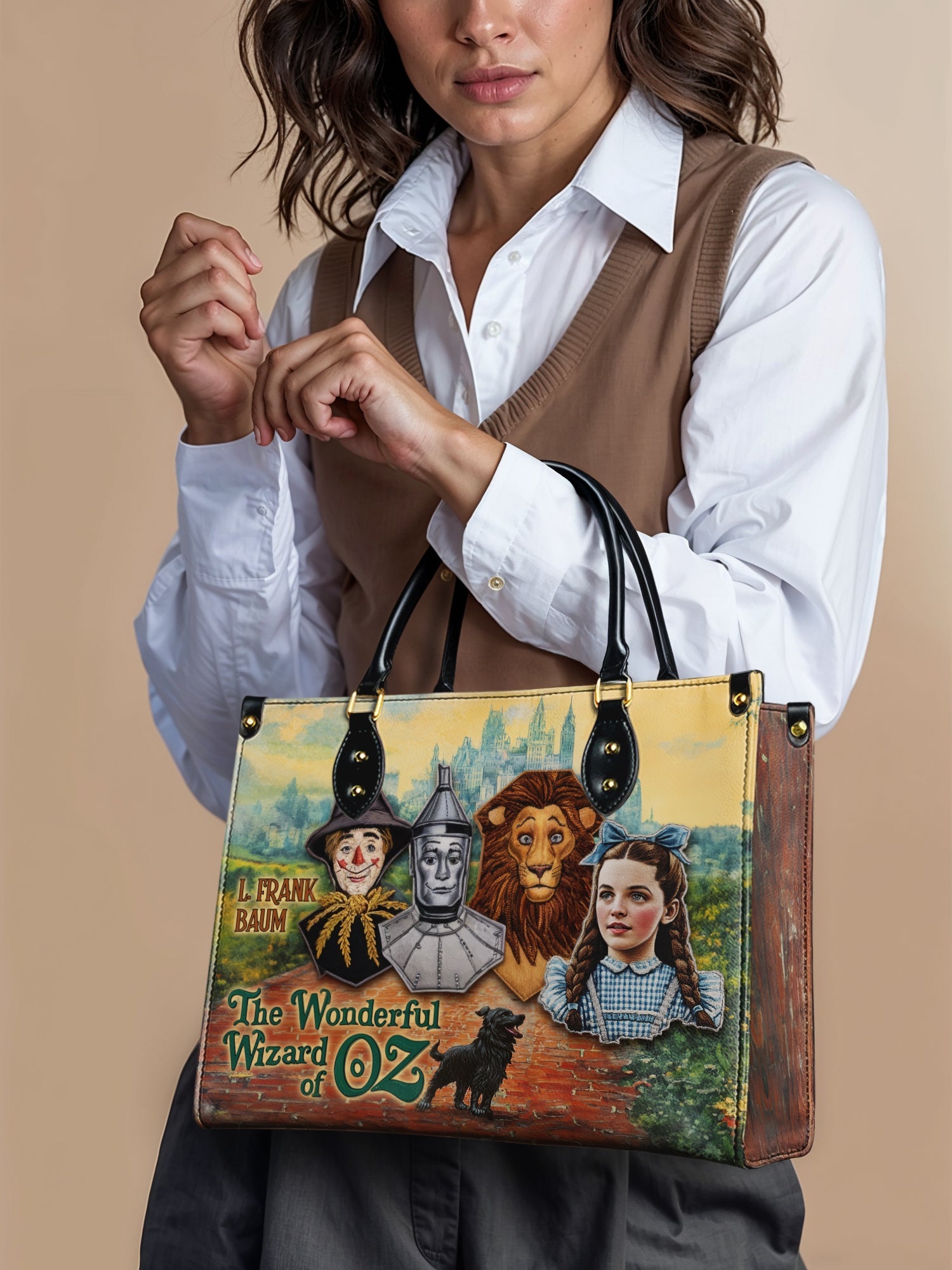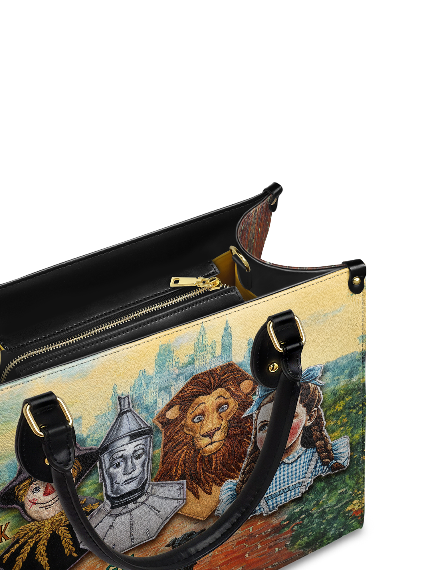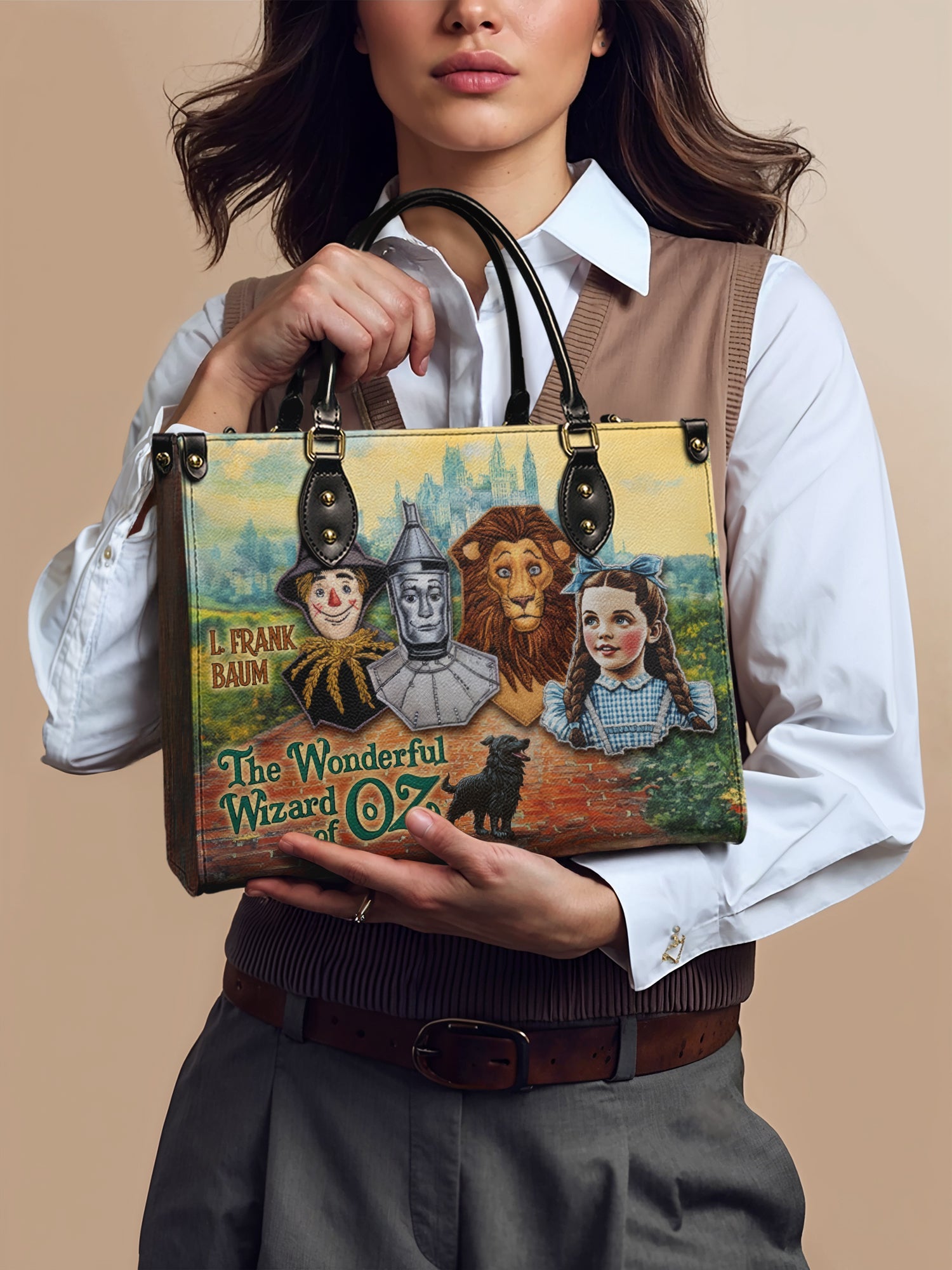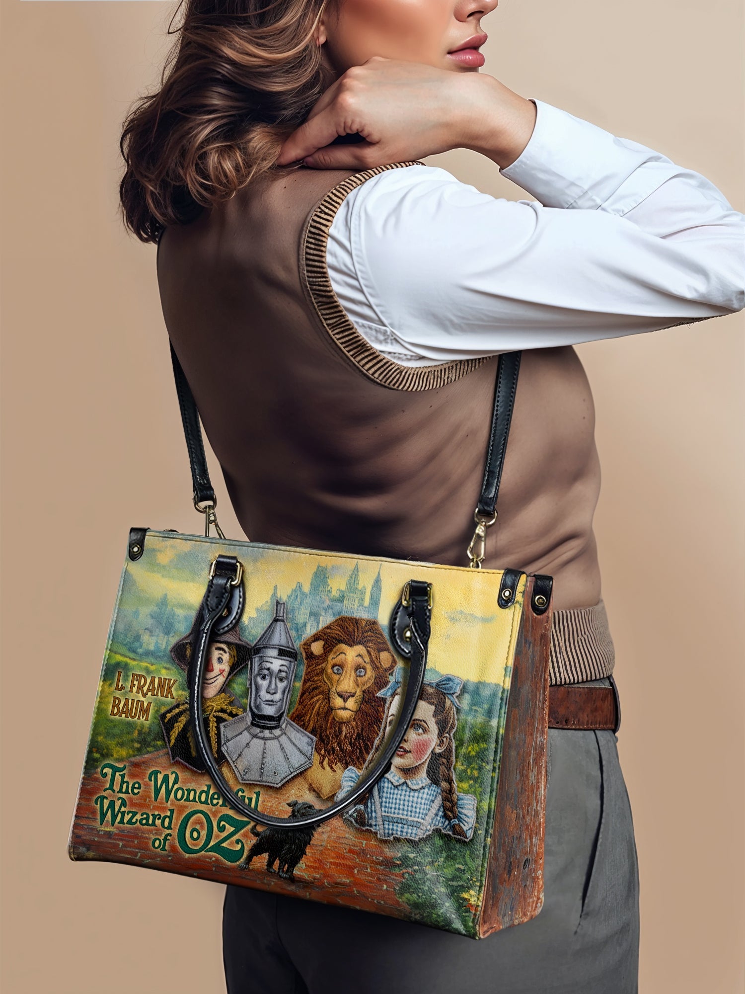 This Wonderful Wizard of Oz Leather Handbag is full of adventure, magic, and heart. The vintage-style design brings Dorothy, Toto, and her friends to life as they follow the yellow brick road to the Emerald City. The colors are rich, the details are classic, and it feels like stepping right into the story. Made from high-quality leather with sturdy black handles and gold accents, this bag is perfect for book lovers, dreamers, and anyone who knows there’s no place like home.