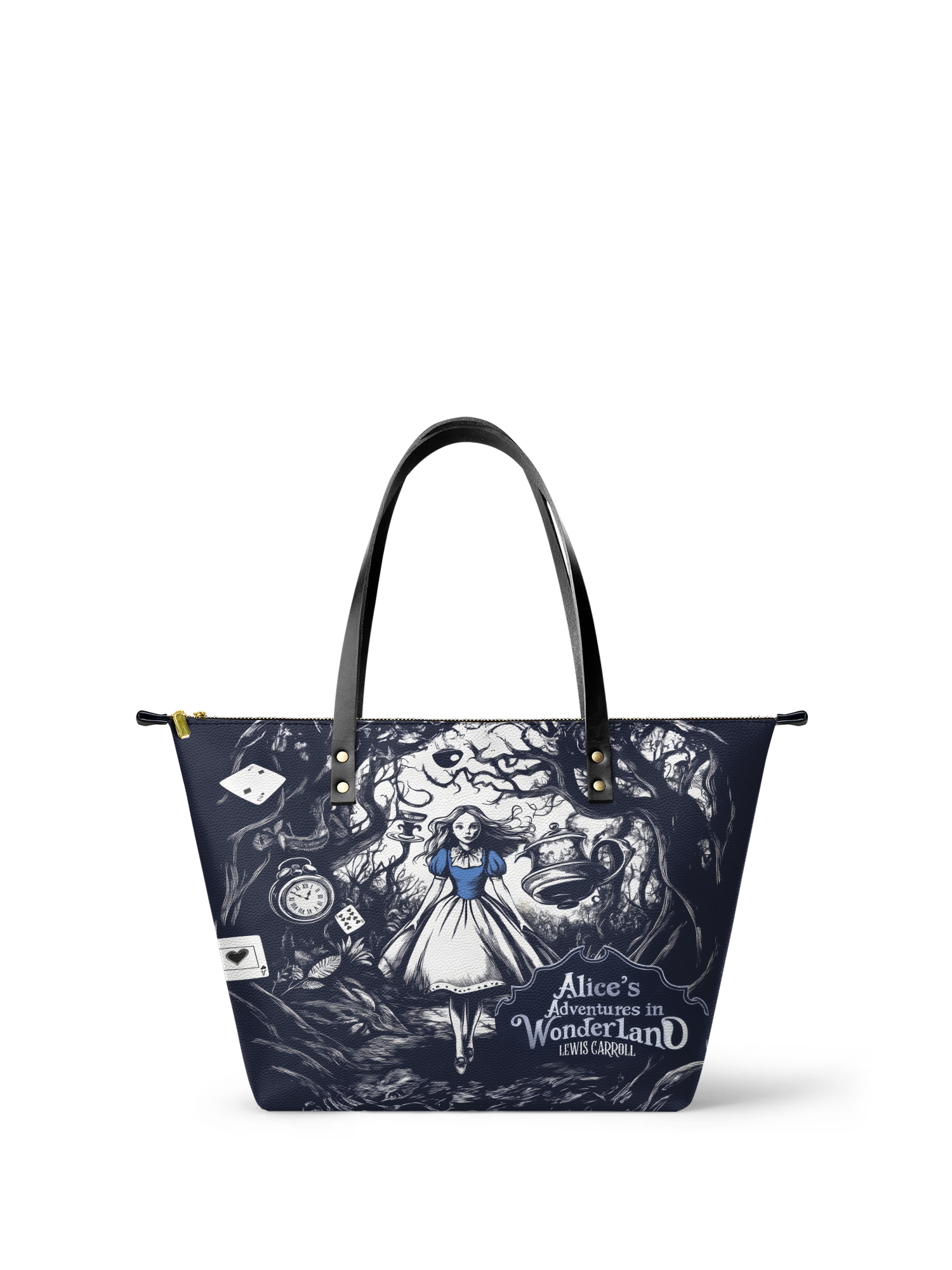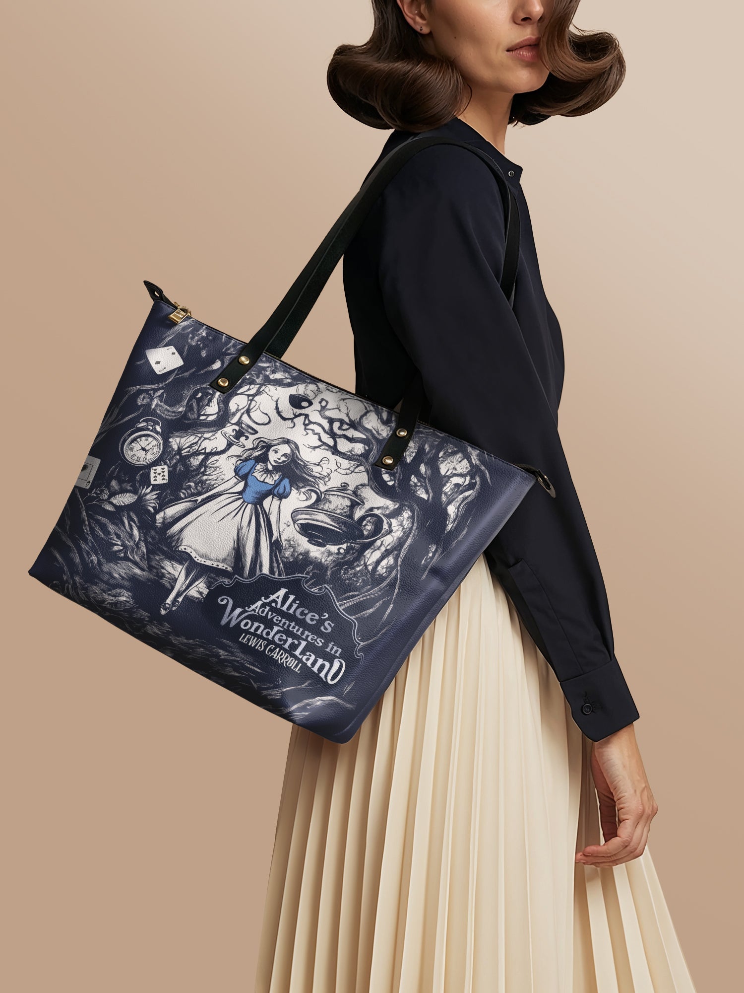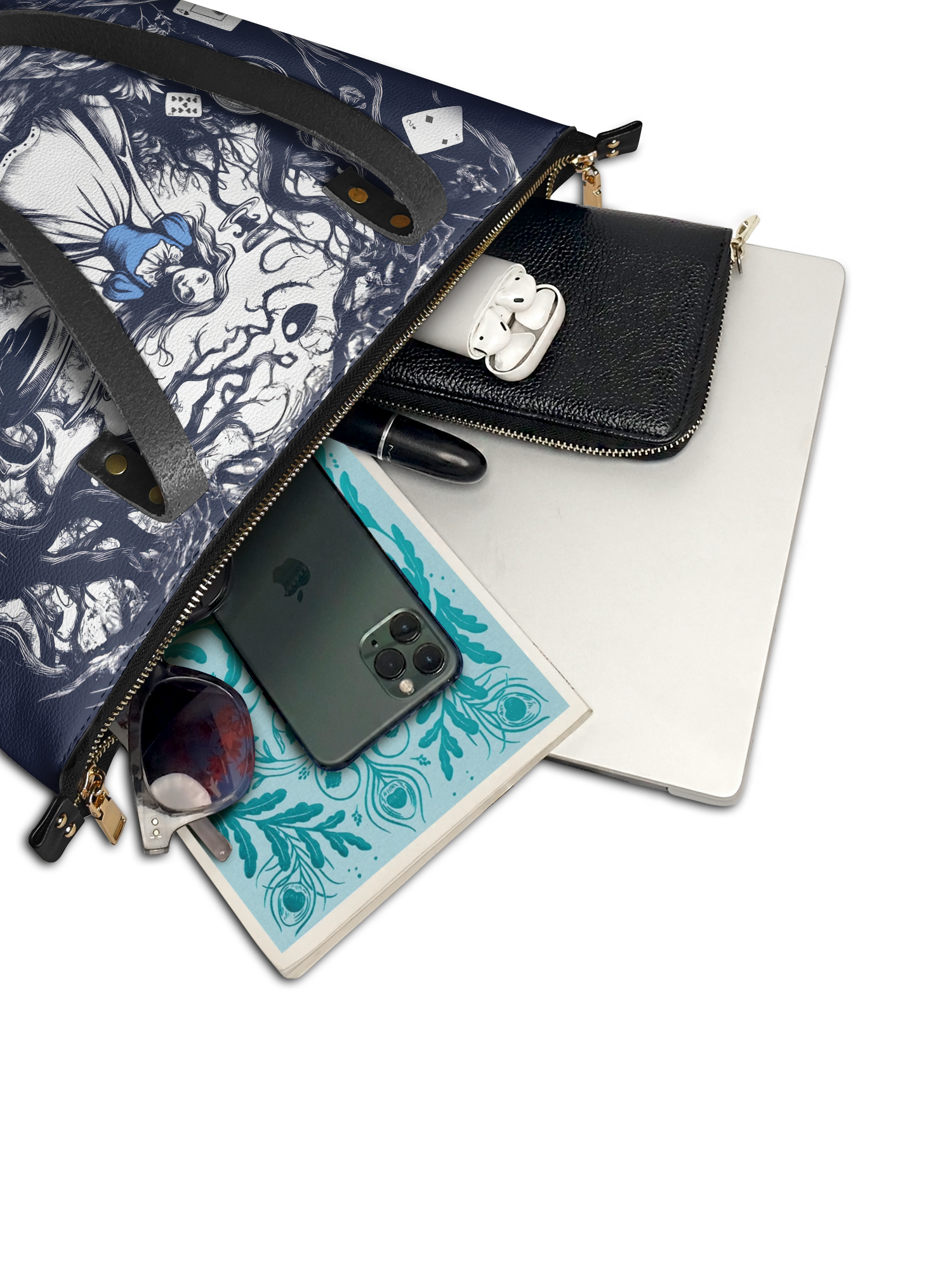 This Alice’s Adventures in Wonderland Leather Tote is made for dreamers, book lovers, and anyone who loves a little magic. The eerie, storybook design pulls you right into Wonderland—Alice lost in the woods, cards floating, time ticking away. It’s roomy, durable, and made from high-quality leather, with sleek black handles and gold hardware for a touch of elegance. Perfect for carrying books, daily essentials, or a bit of Wonderland wherever you go.