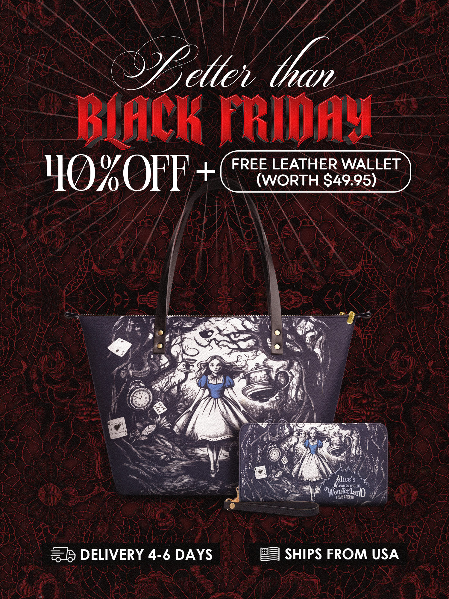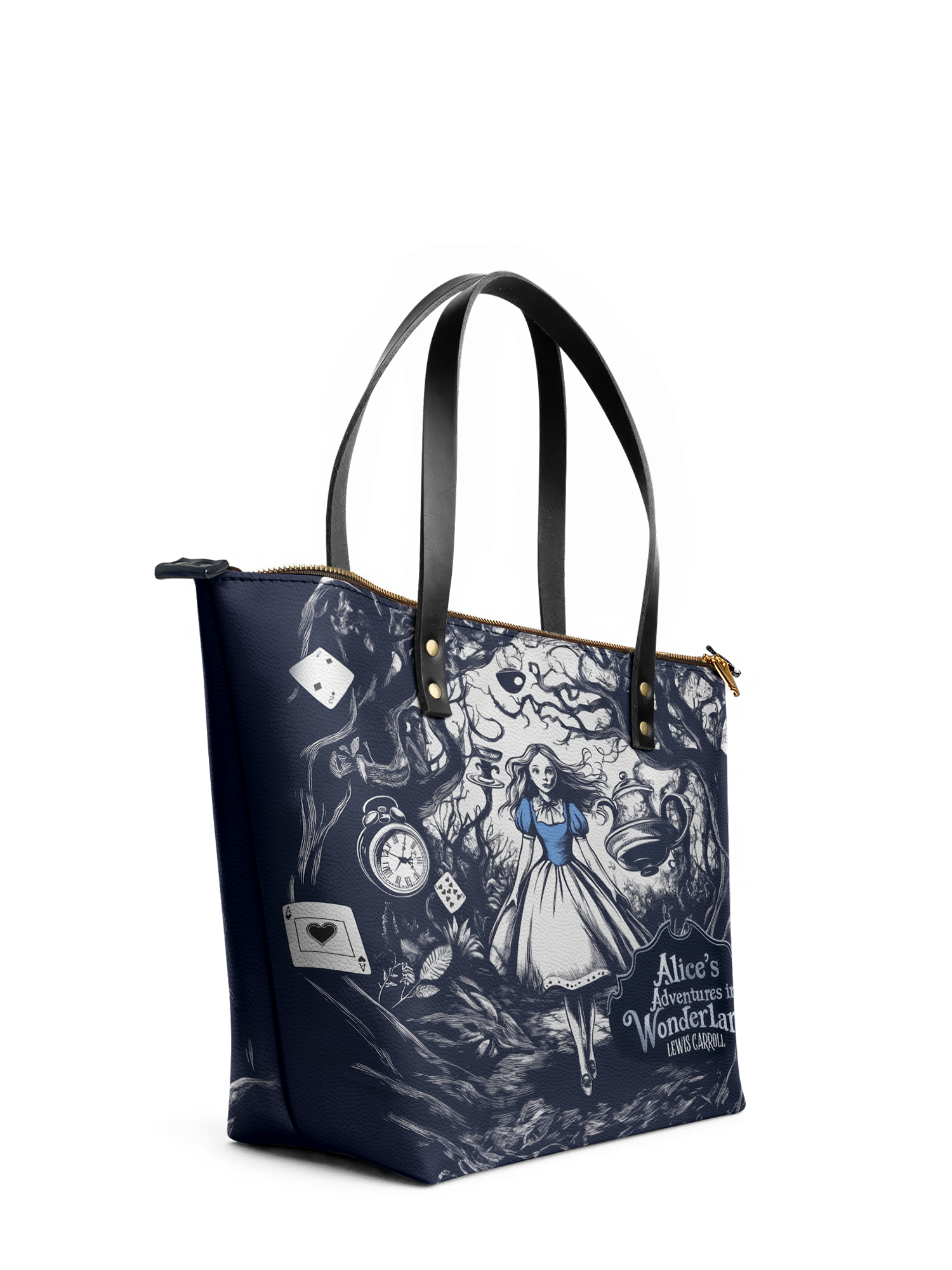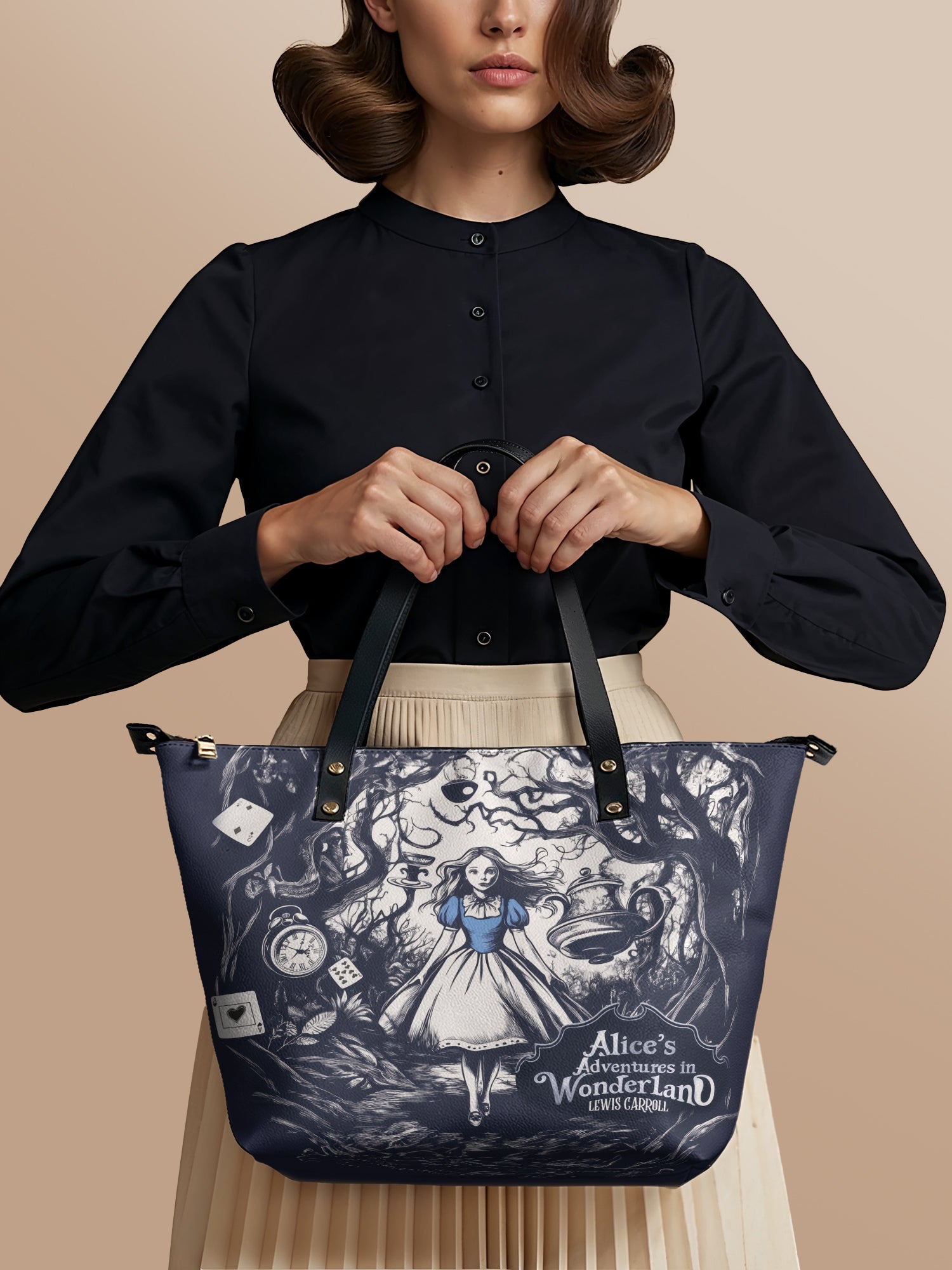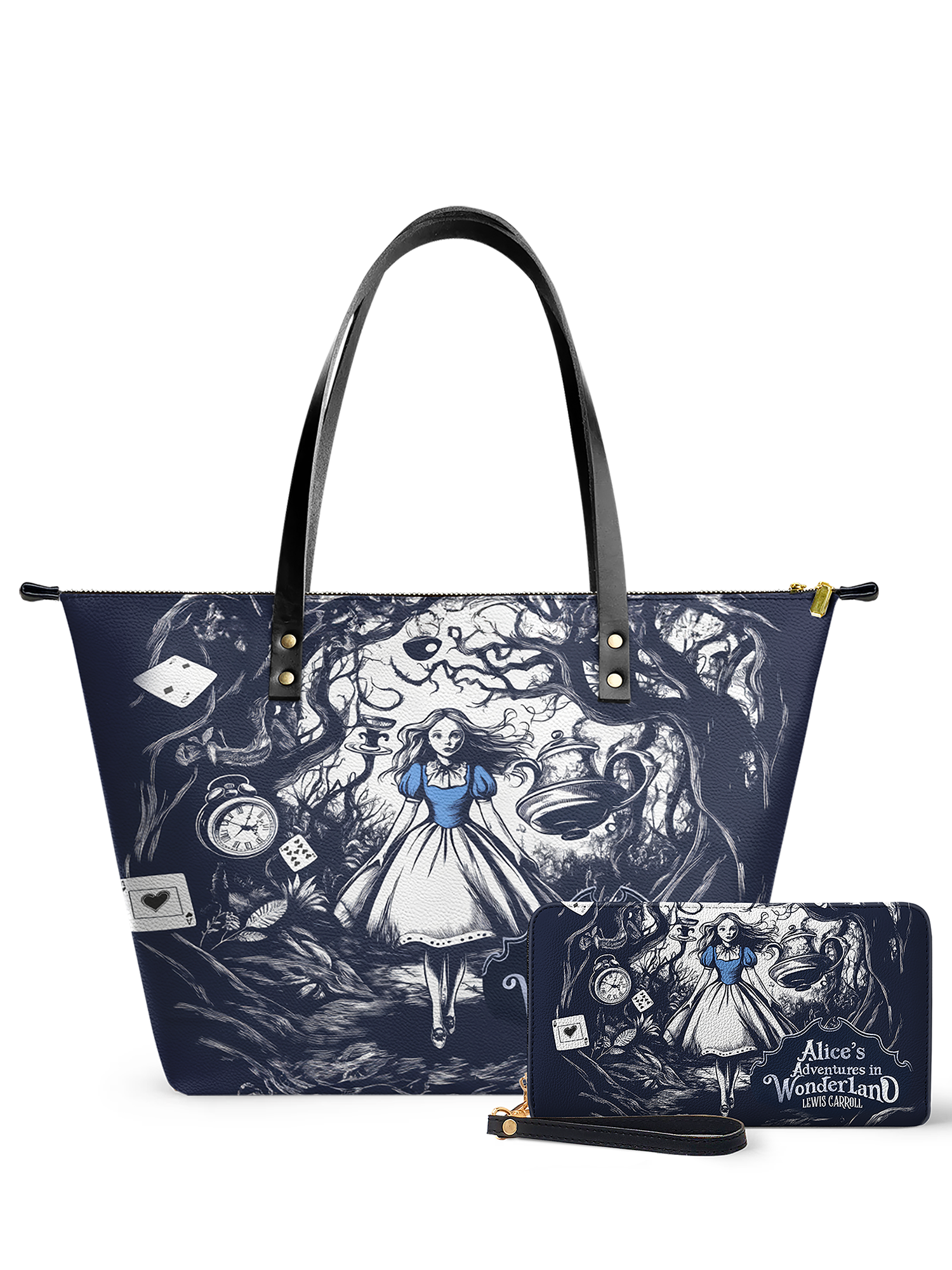 This Alice’s Adventures in Wonderland Leather Tote is made for dreamers, book lovers, and anyone who loves a little magic. The eerie, storybook design pulls you right into Wonderland—Alice lost in the woods, cards floating, time ticking away. It’s roomy, durable, and made from high-quality leather, with sleek black handles and gold hardware for a touch of elegance. Perfect for carrying books, daily essentials, or a bit of Wonderland wherever you go.