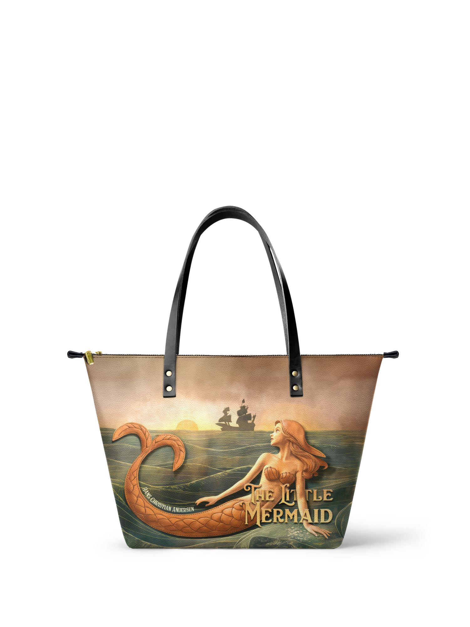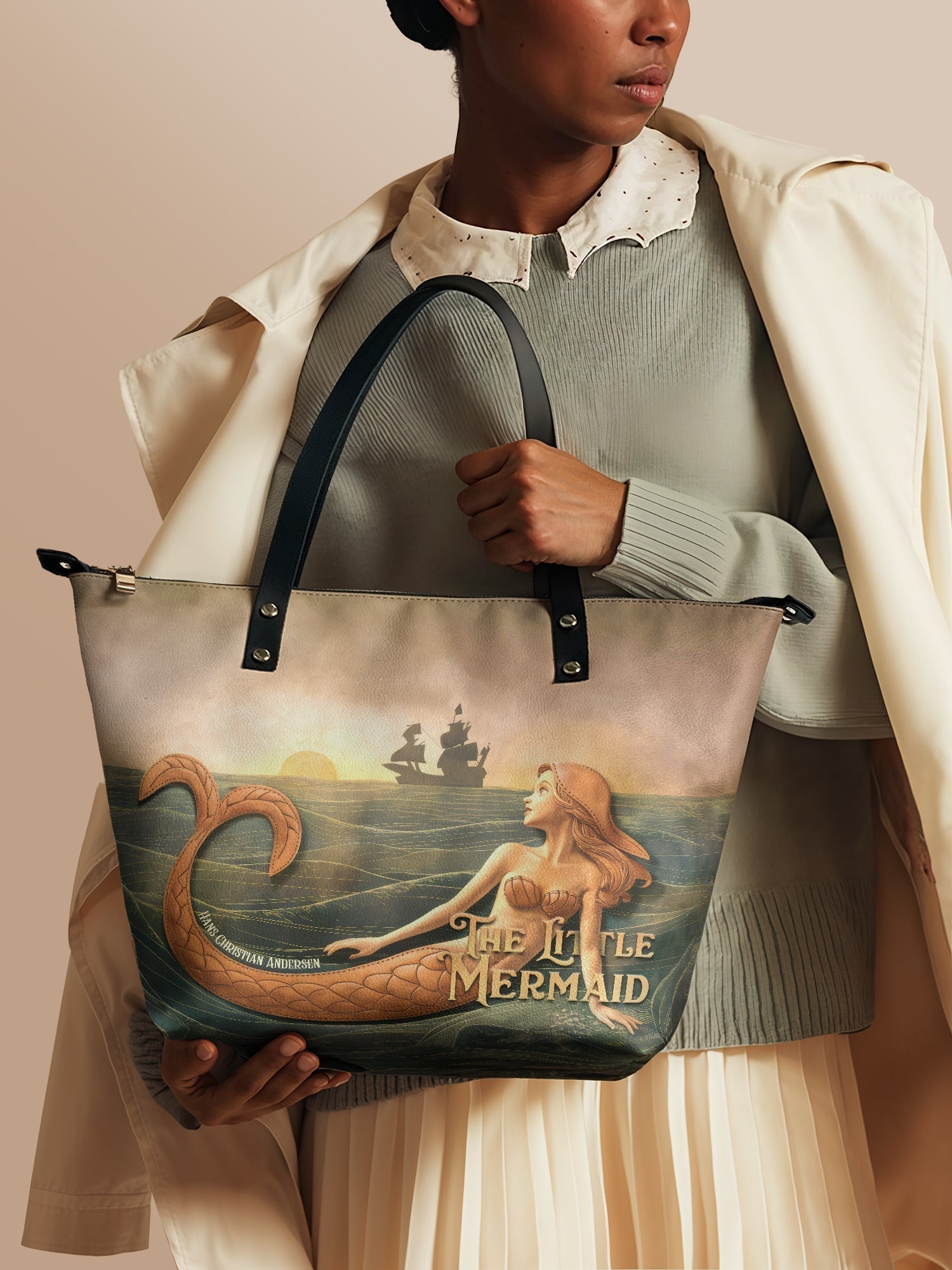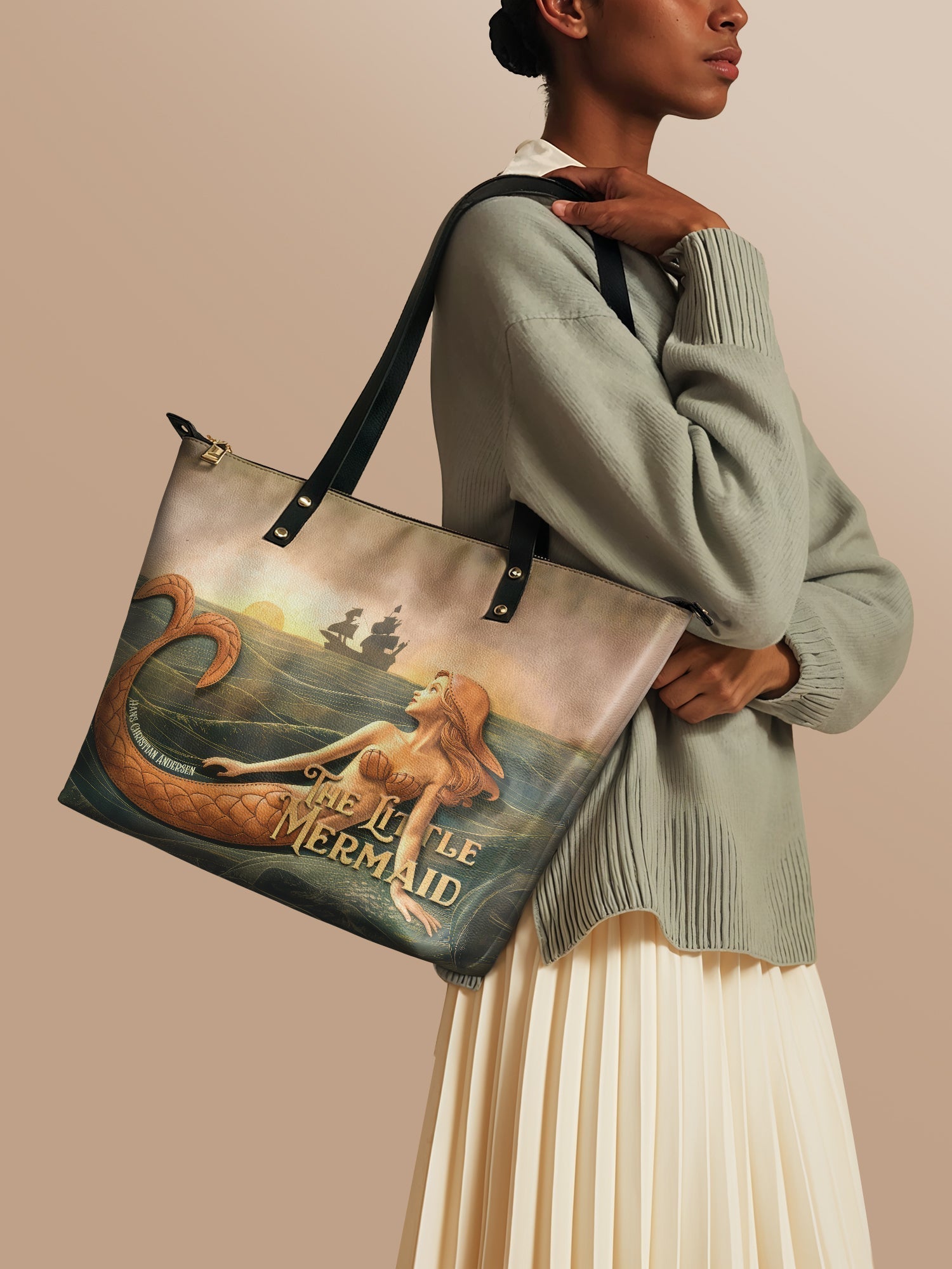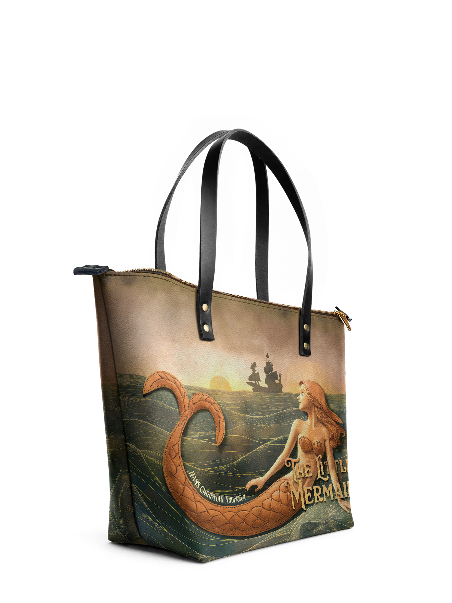 This Little Mermaid Leather Tote is a fairytale come to life. The vintage-style design captures a golden-haired mermaid gazing at a distant ship, lost in dreams of adventure. With deep ocean waves, a glowing sunset, and a soft storybook feel, it’s timeless and enchanting. Made from high-quality leather with sleek black handles and gold details, this tote is perfect for book lovers, ocean dreamers, and anyone who believes in magic beneath the waves.