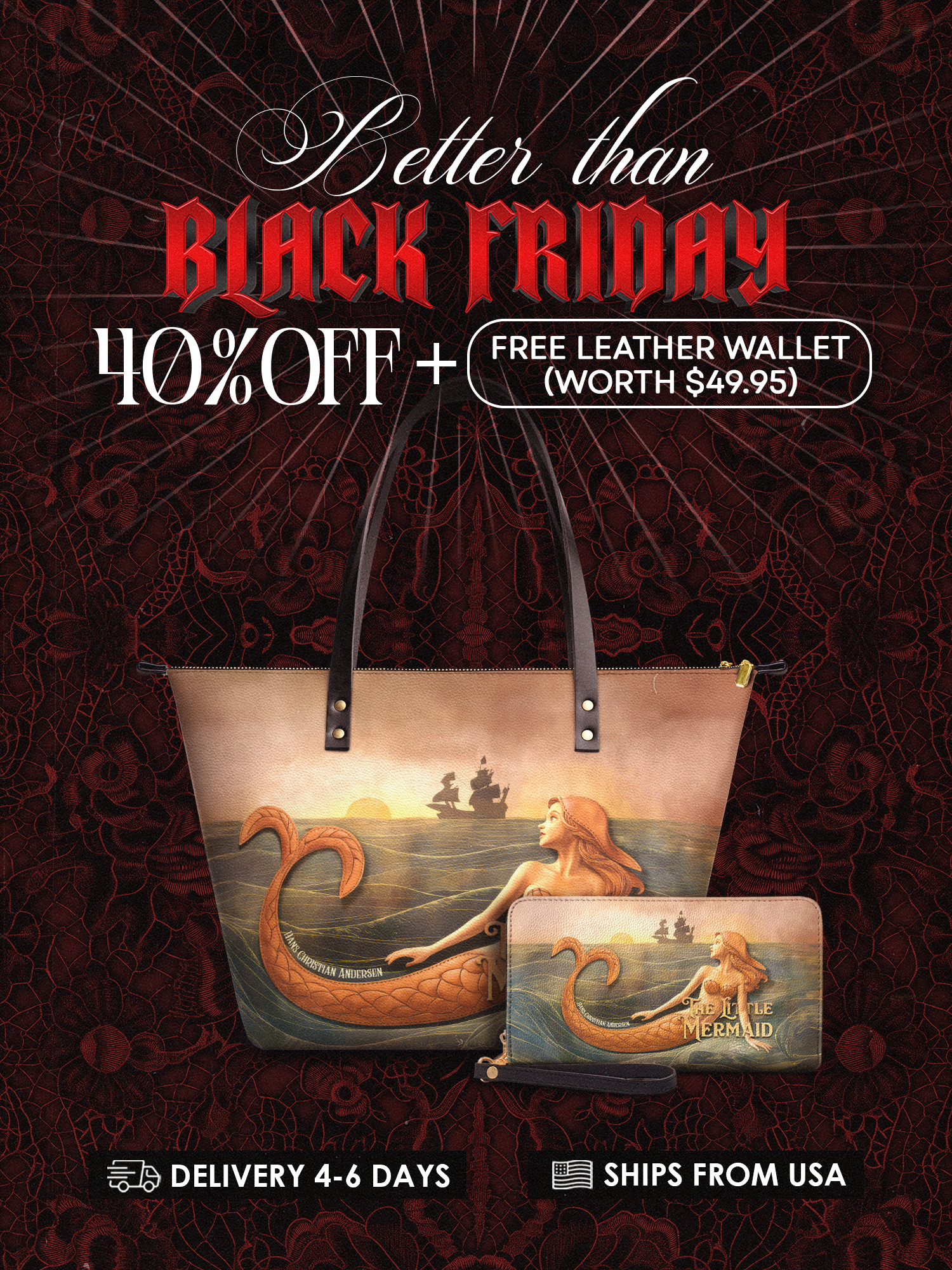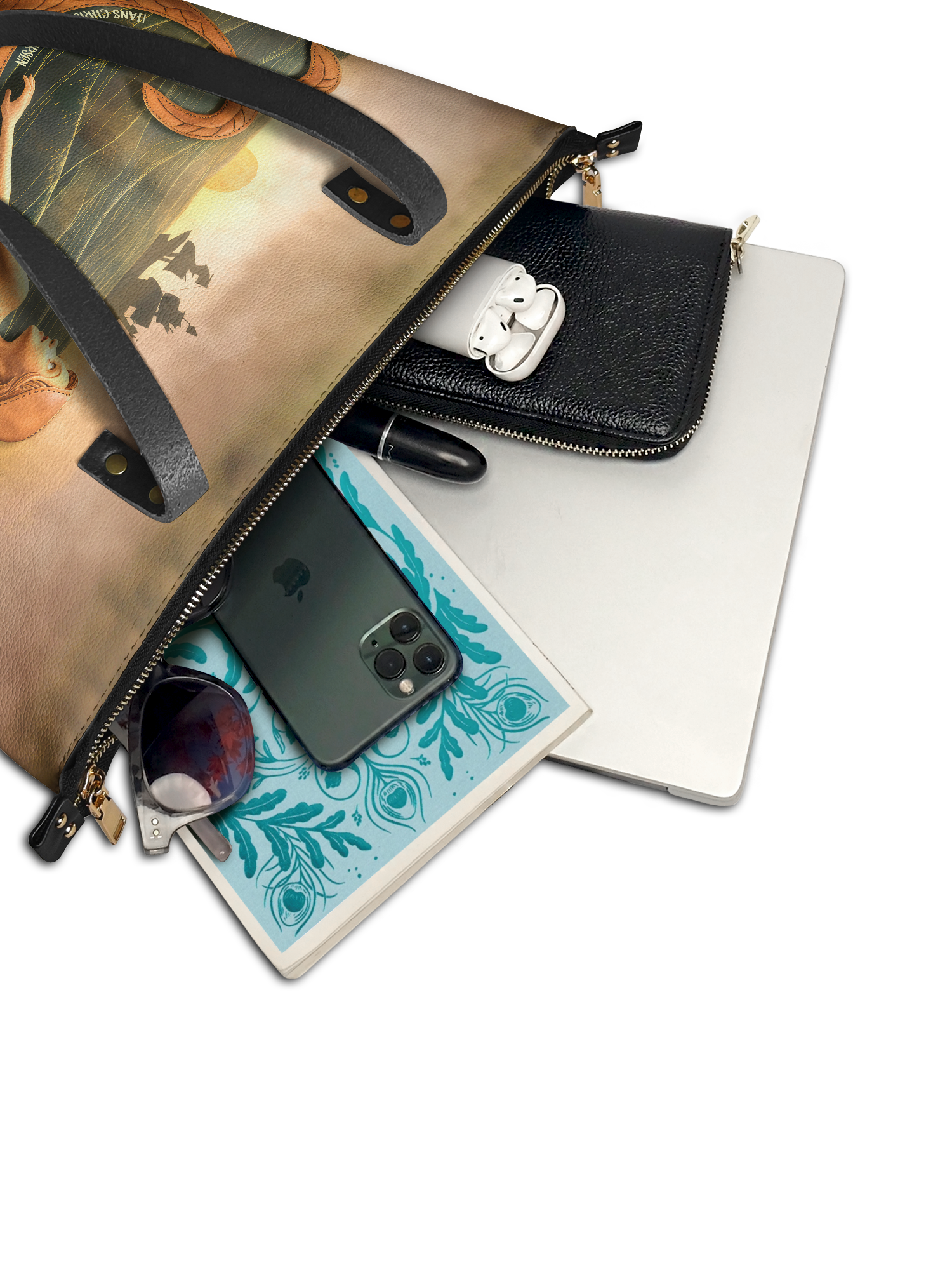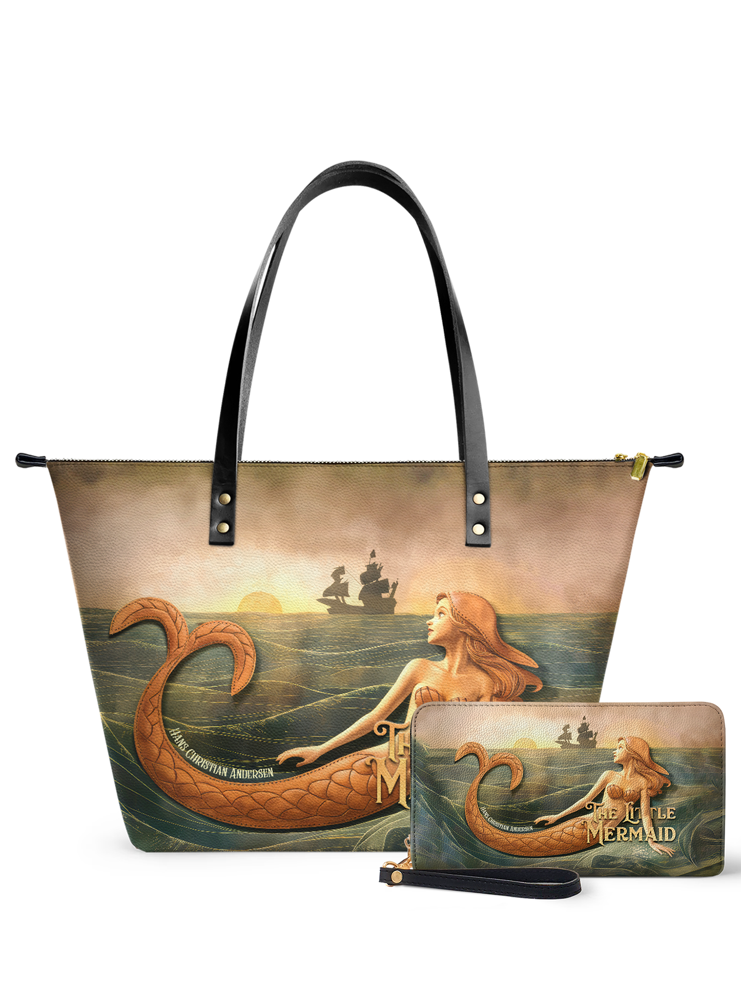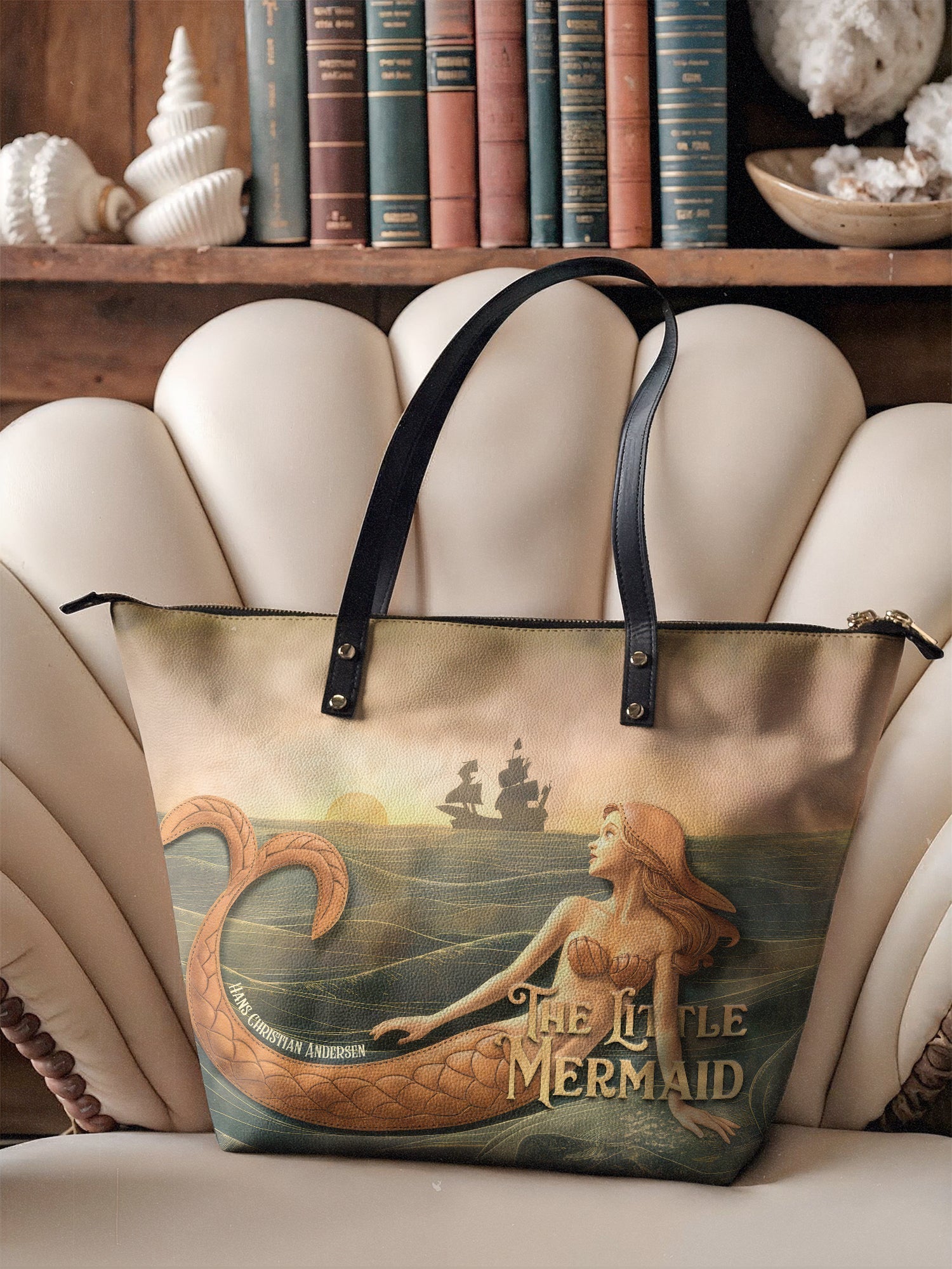 This Little Mermaid Leather Tote is a fairytale come to life. The vintage-style design captures a golden-haired mermaid gazing at a distant ship, lost in dreams of adventure. With deep ocean waves, a glowing sunset, and a soft storybook feel, it’s timeless and enchanting. Made from high-quality leather with sleek black handles and gold details, this tote is perfect for book lovers, ocean dreamers, and anyone who believes in magic beneath the waves.