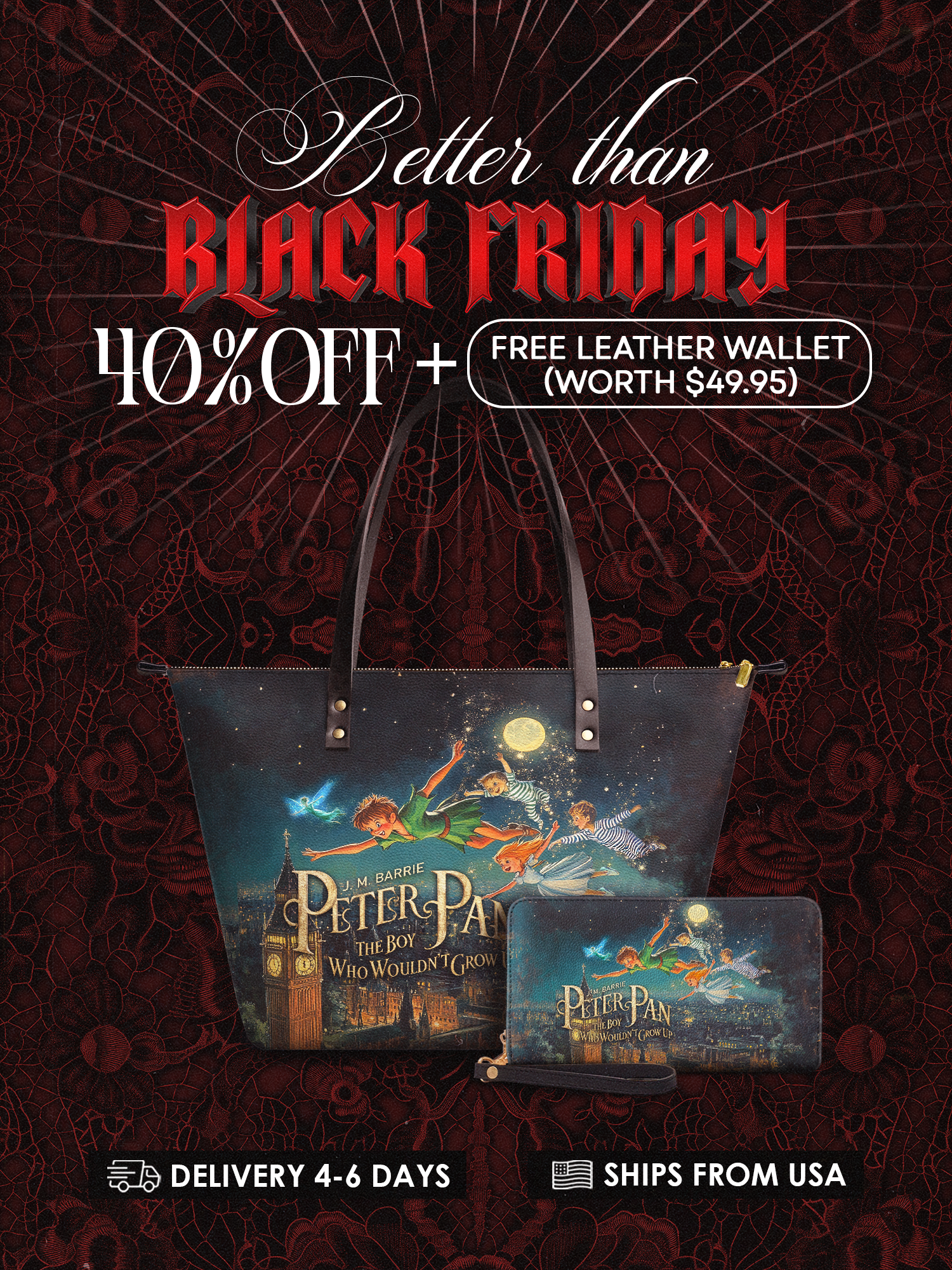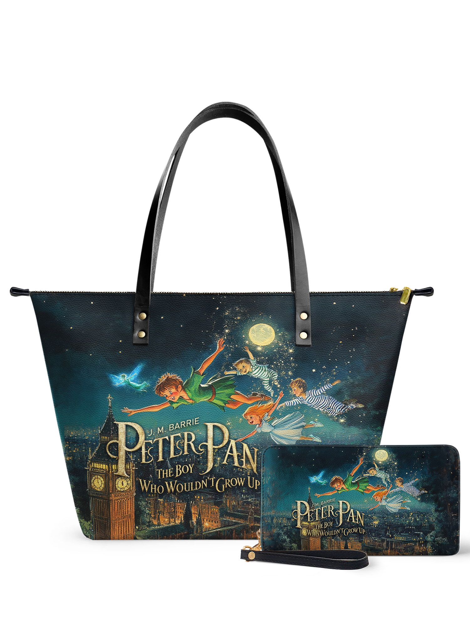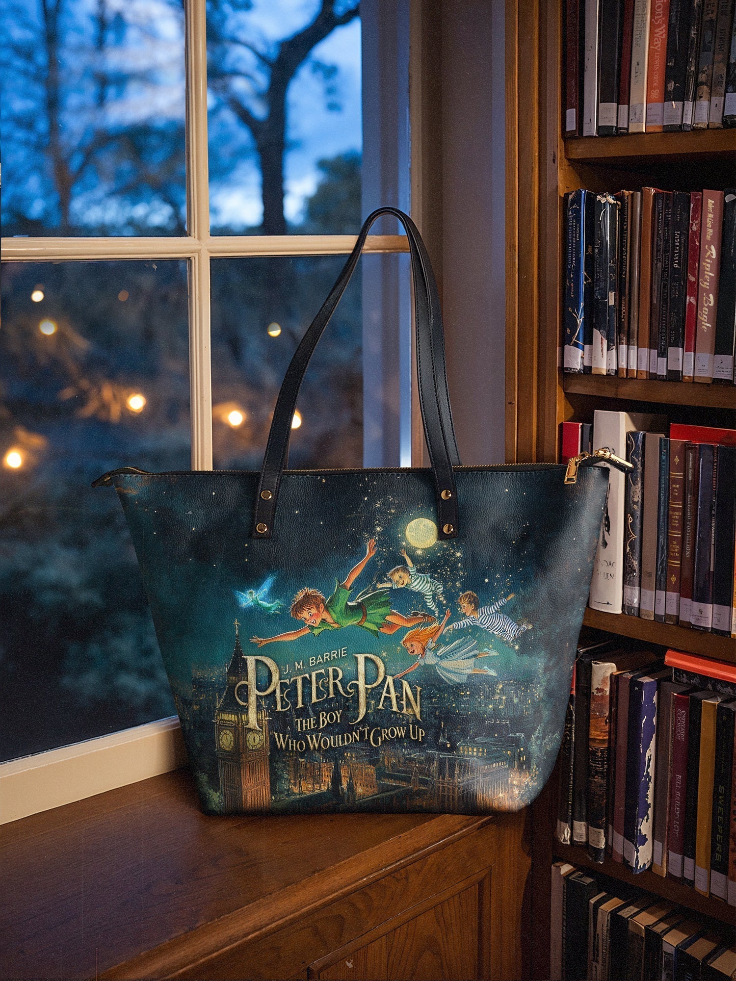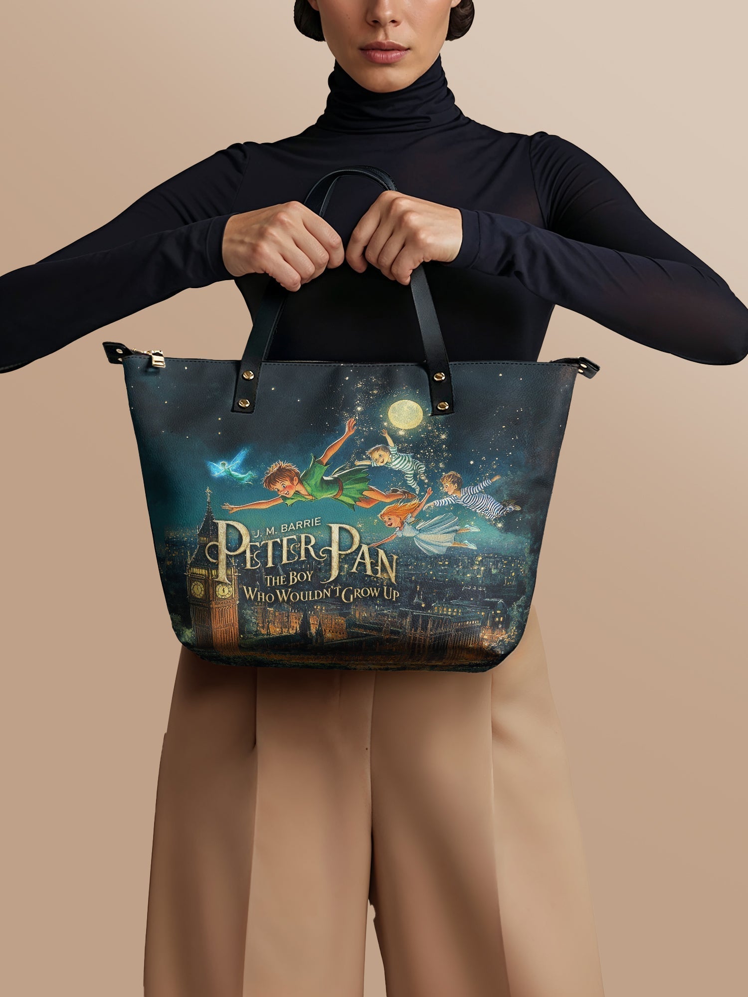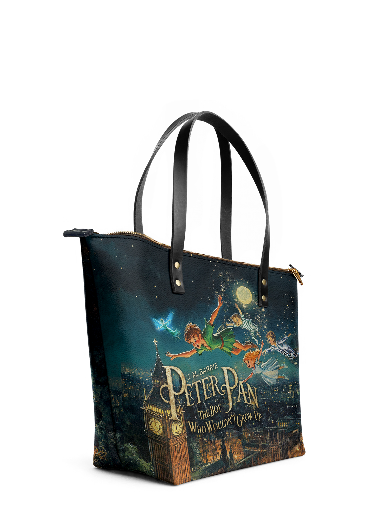 This Peter Pan Leather Tote is pure storybook magic. The design captures Peter, Wendy, John, and Michael flying high above London, with Big Ben glowing and the moon lighting the night sky. It feels like a dream—full of adventure, wonder, and just a little bit of pixie dust. Made from high-quality leather with sleek black handles and gold accents, this tote is perfect for book lovers, dreamers, and anyone who believes in never growing up.