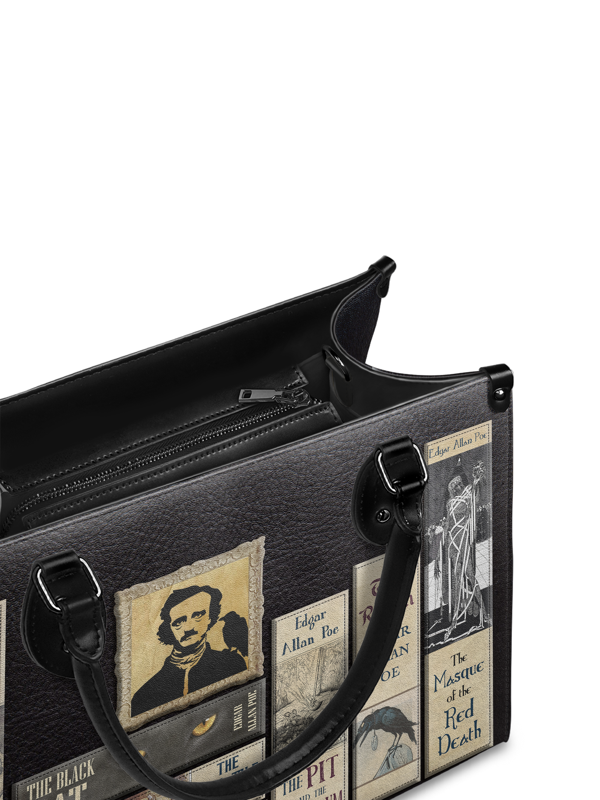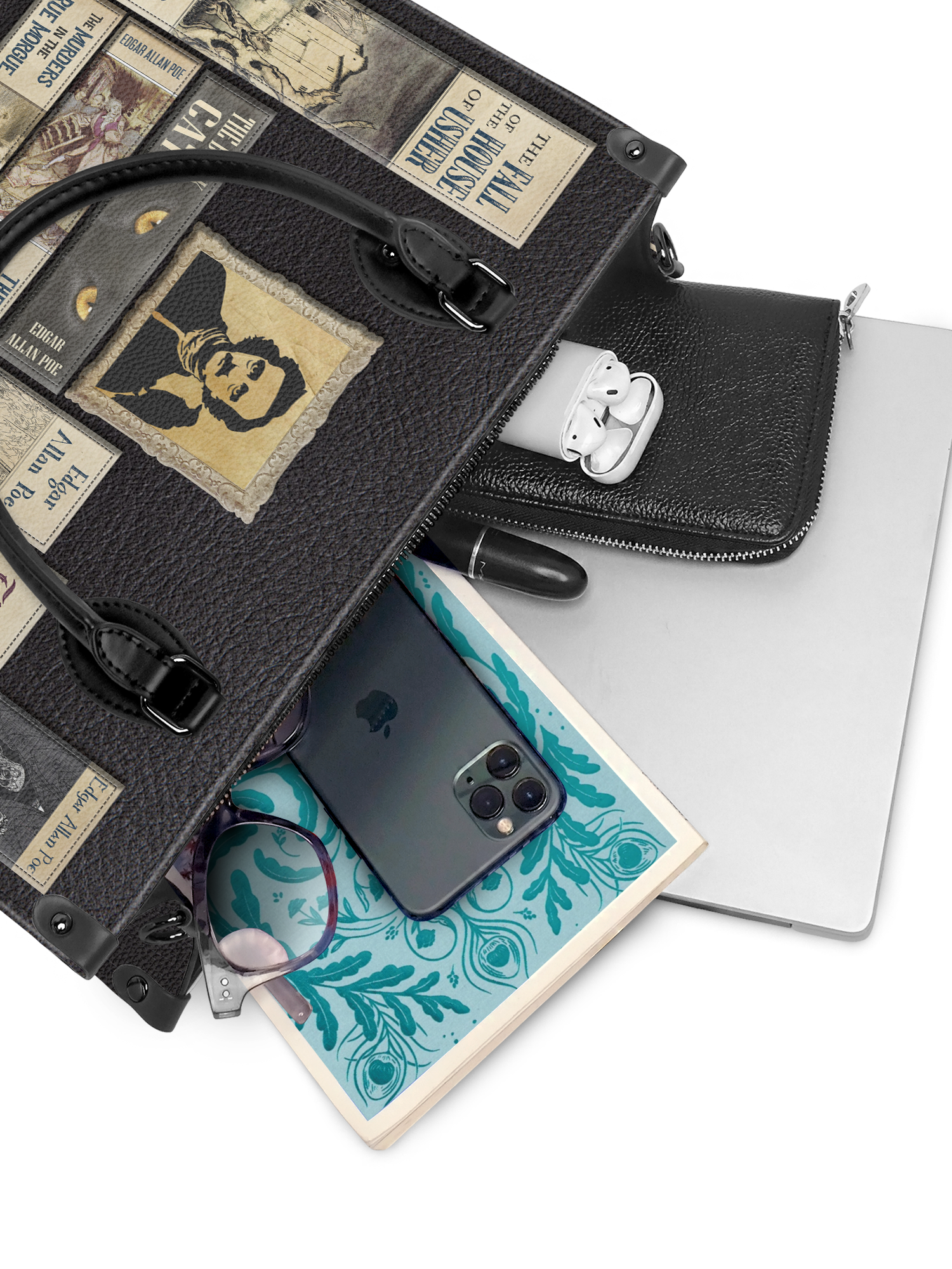 This Poe’s Library Black Leather Handbag is pure gothic perfection. Covered in haunting book covers and eerie illustrations, it’s a tribute to the master of macabre, Edgar Allan Poe. The dark, vintage-style design is a dream for literary lovers, mystery seekers, and gothic souls. Whether you adore the chilling lines of The Raven or get lost in the mystery of The Tell-Tale Heart, this bag is your perfect companion. Soft, stylish, and just a little sinister—carry your love for the classics wherever you go.