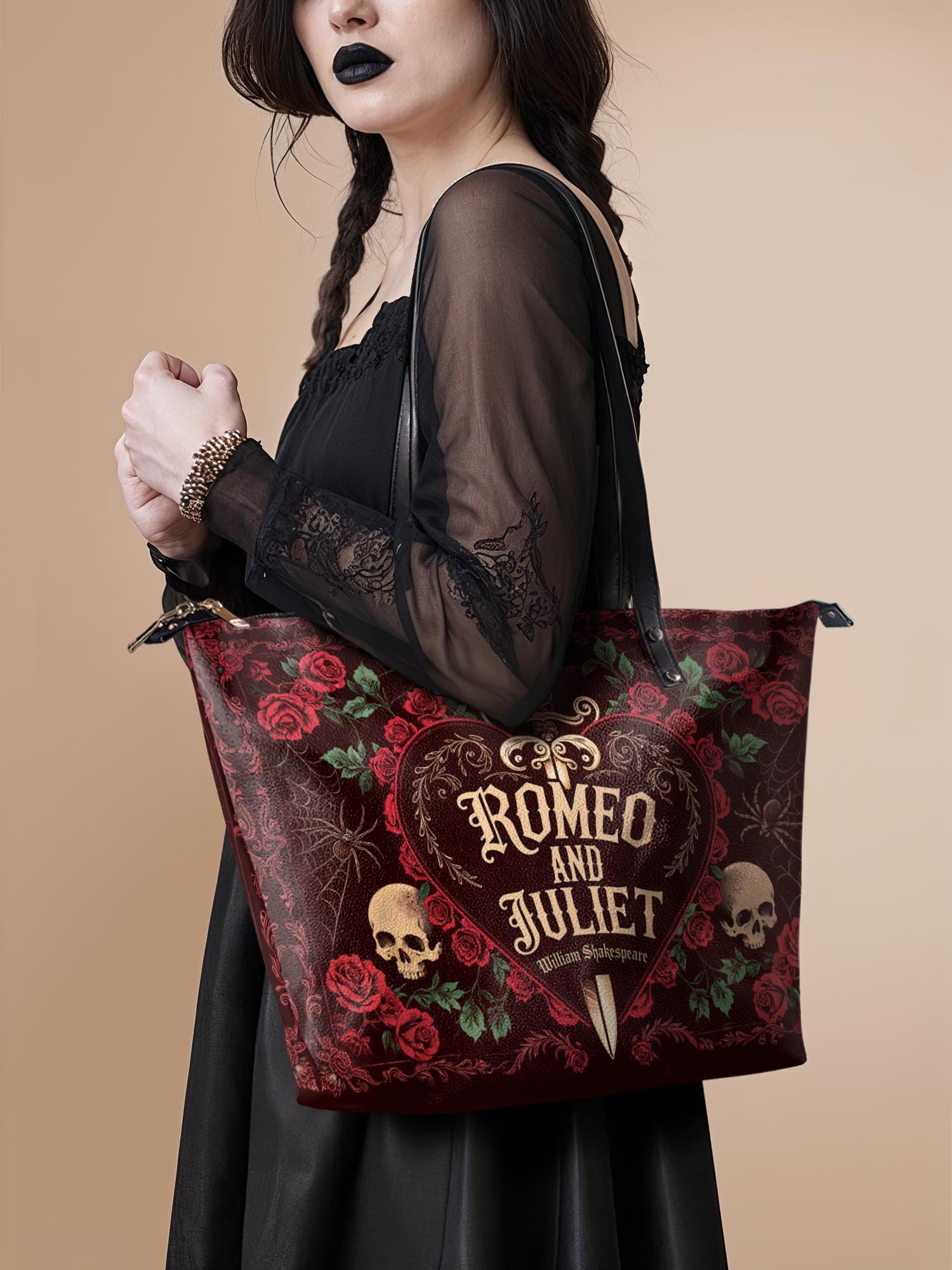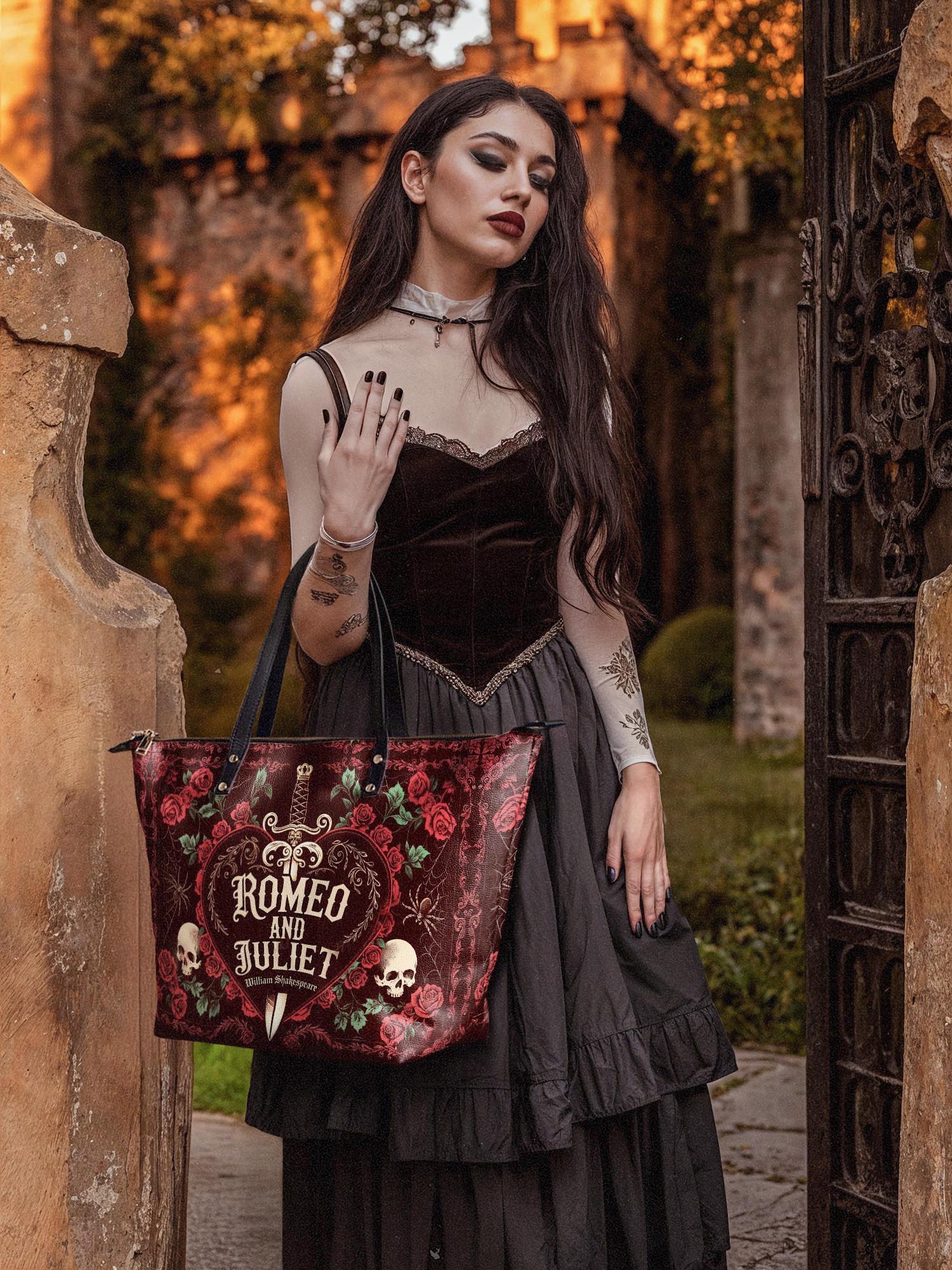 This tote is the chameleon of the crypt: sling it over a wool cape for windswept walks reciting Annabel Lee, or pair it with tailored blacks for a midnight masquerade.