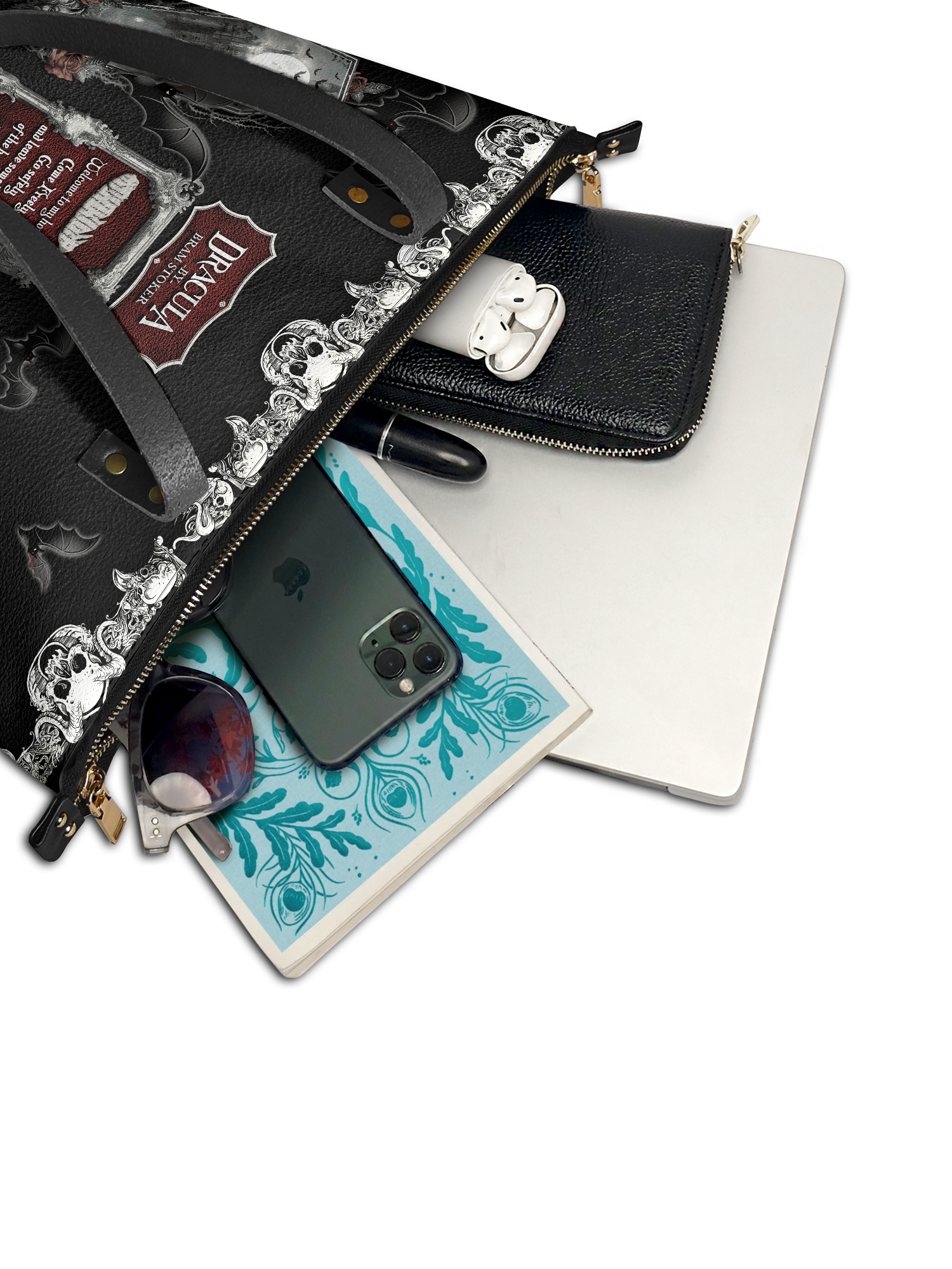Handcrafted in the United States, this Premium Vegan Leather tote transforms mundane errands into a procession through the House of Usher.