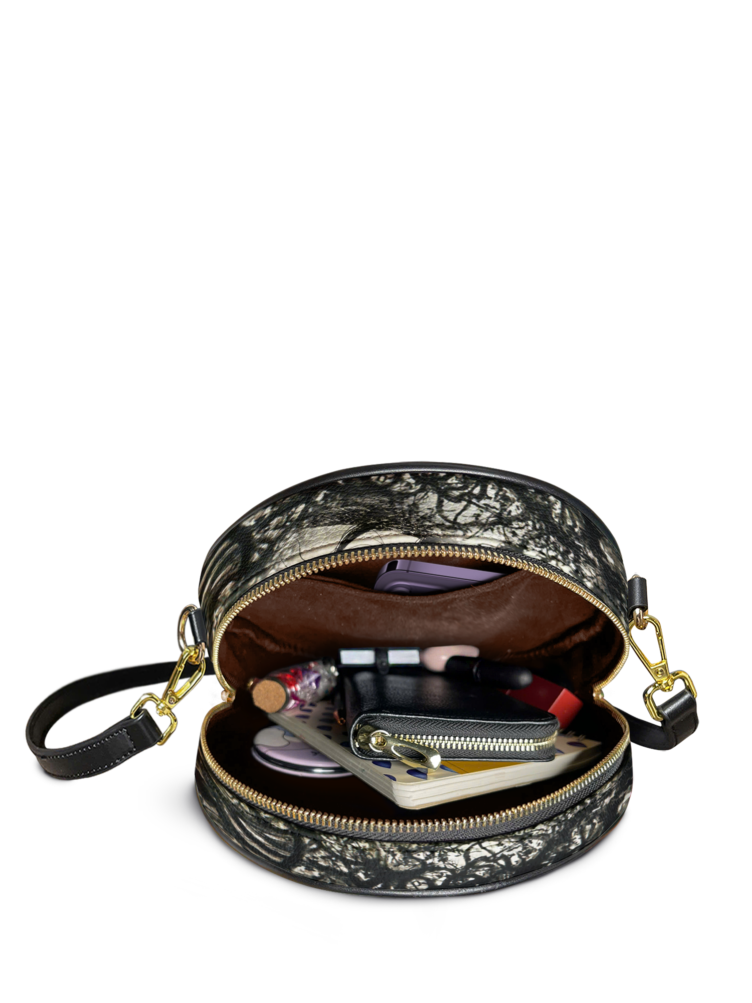 Designed with a secure zipper closure and adjustable strap, it’s ideal for daily errands, moonlit strolls, or midnight bookstore runs.