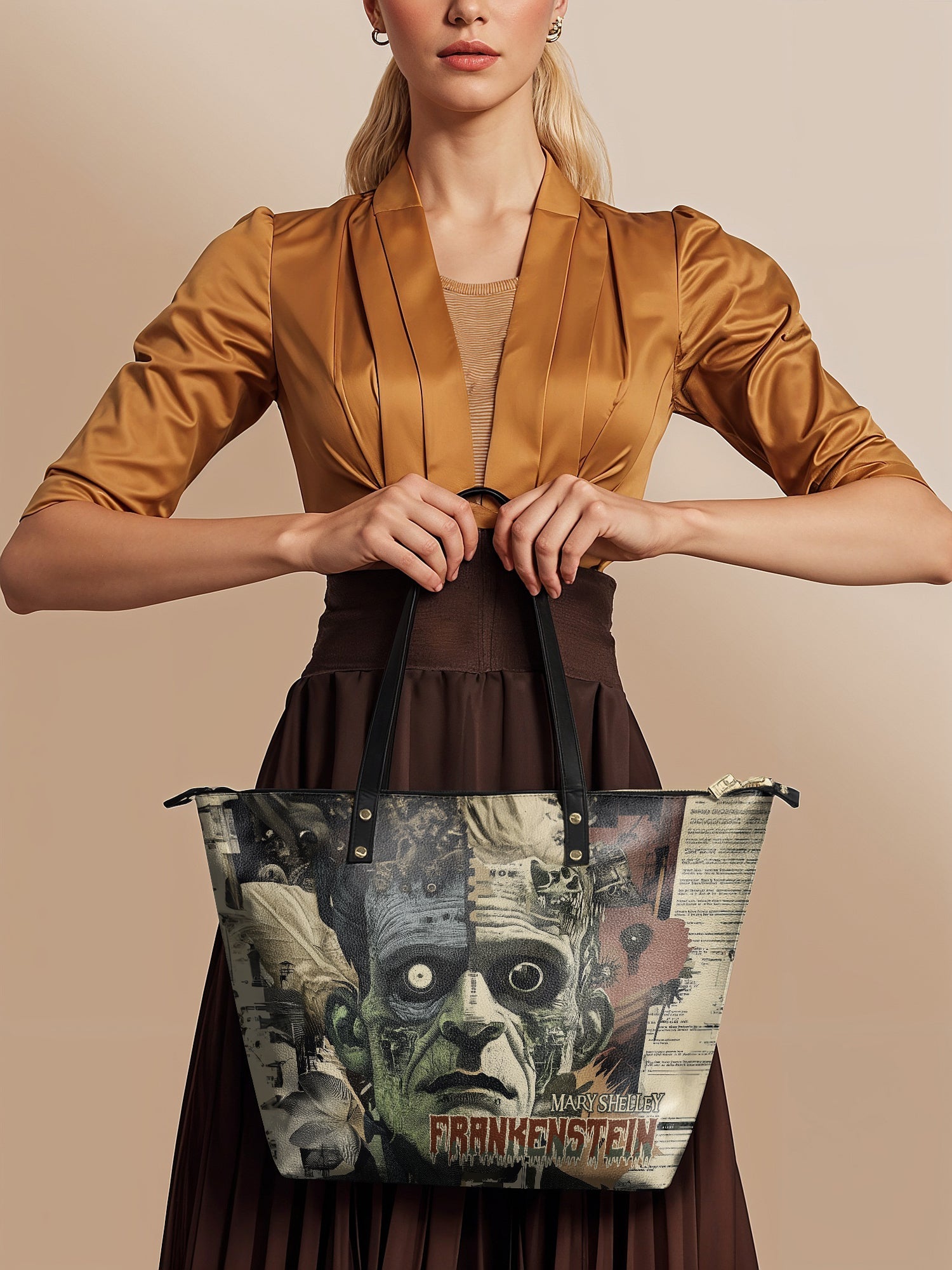 This Frankenstein Leather Tote is bold, eerie, and full of gothic charm. The haunting design features a stitched-together collage of Frankenstein’s monster, layered with vintage textures, scientific sketches, and a chilling color palette. It’s dark, dramatic, and impossible to ignore. Made from high-quality leather with sleek black handles and gold accents, this tote is perfect for book lovers, horror fans, and anyone who sees the beauty in the misunderstood. A little madness, a little genius—carry the legend with you.
