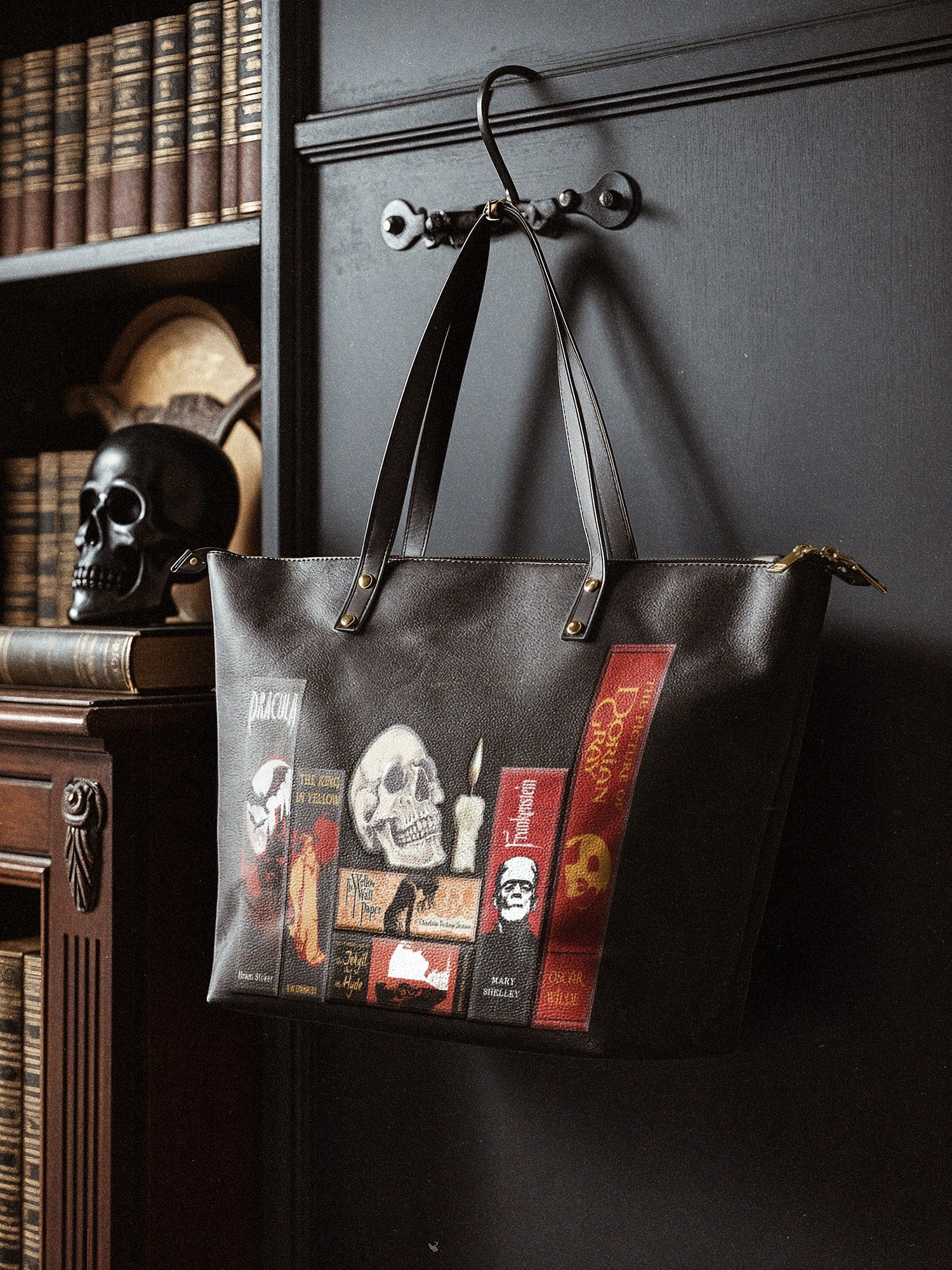 Handcrafted in the United States, this Premium Vegan Leather tote transforms mundane errands into a procession through the House of Usher.