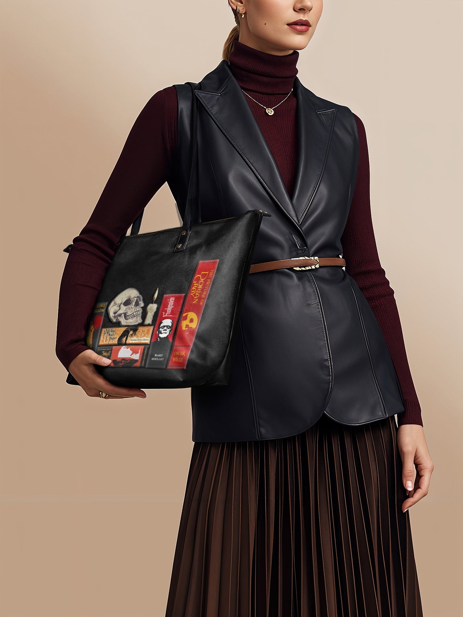 This tote is the chameleon of the crypt: sling it over a wool cape for windswept walks reciting Annabel Lee, or pair it with tailored blacks for a midnight masquerade.