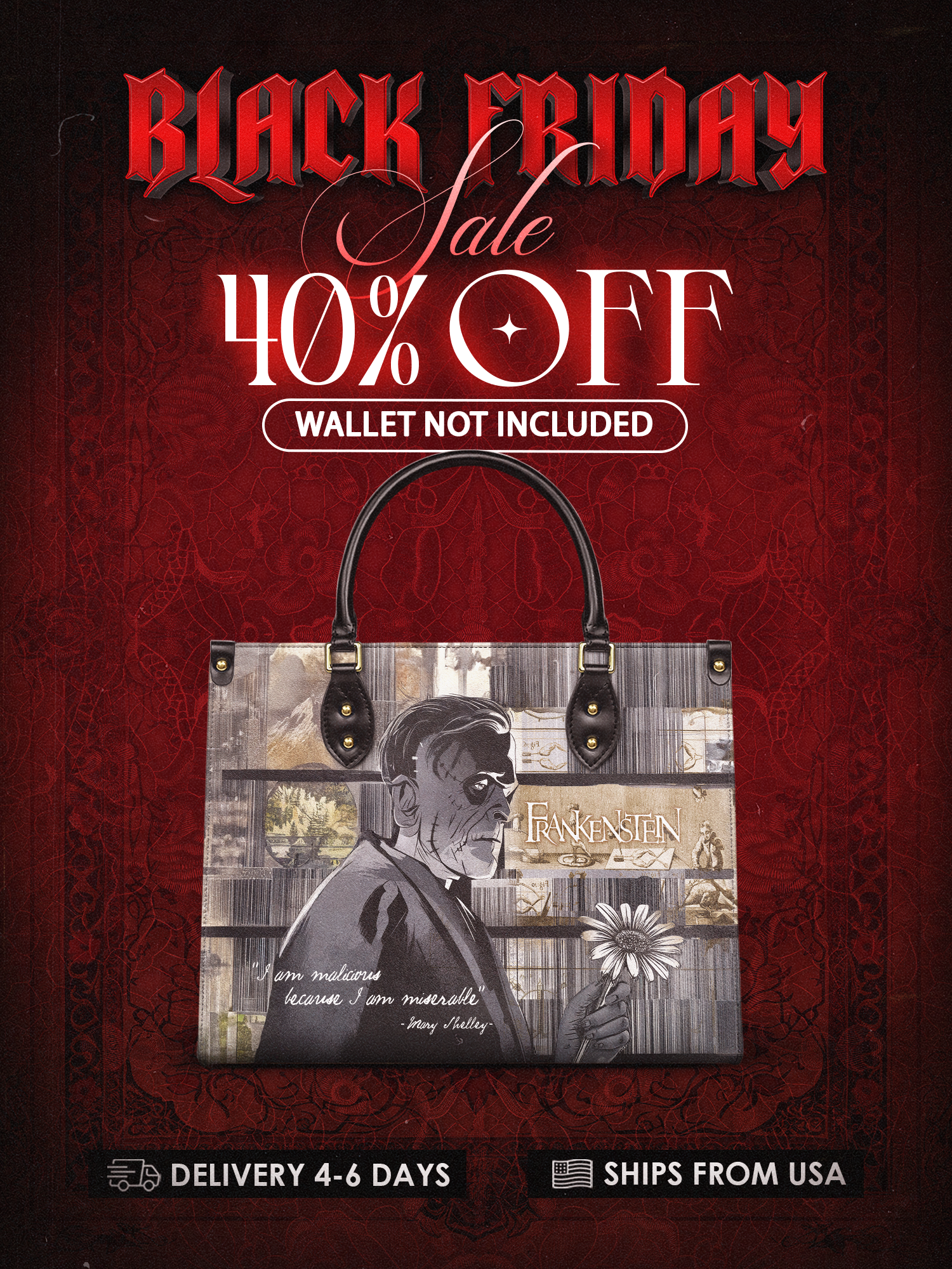 Moody and poetic, the Gray Frankenstein handbag captures the tragic heart of the monster behind the myth. With vintage tones and shadowy art, it’s a quiet homage to longing, loneliness, and the dark beauty of misunderstood souls. Understated, haunting, and deeply human.