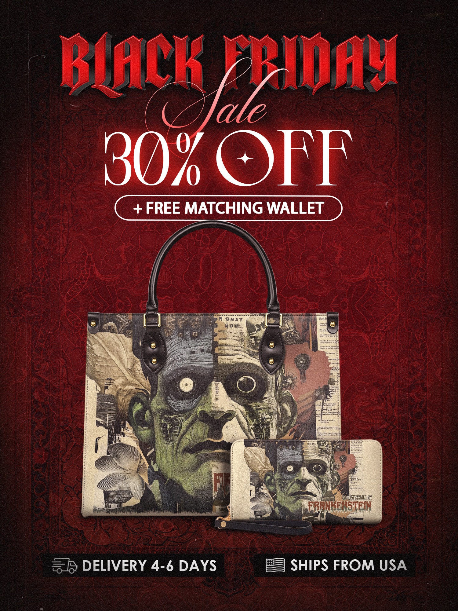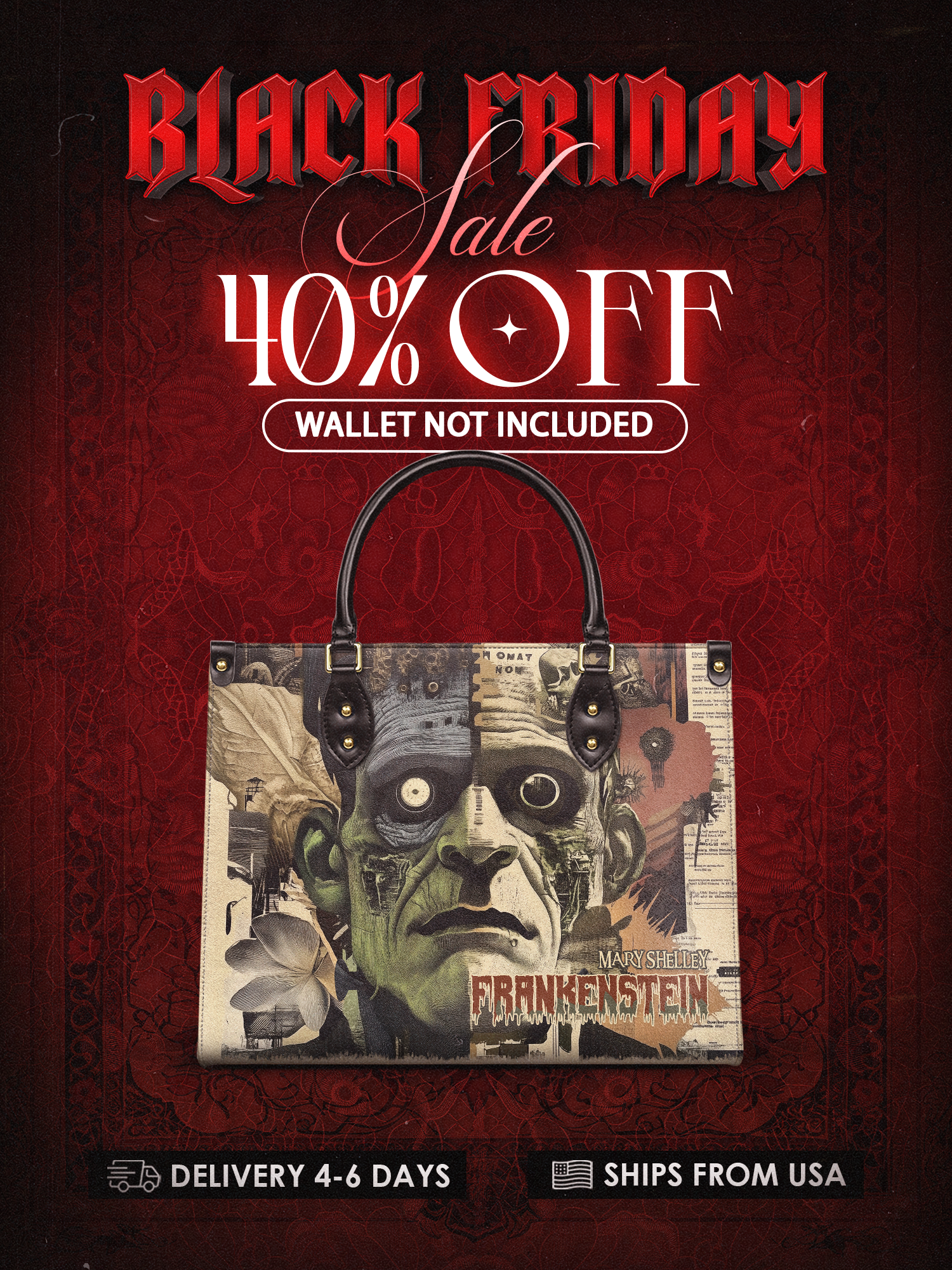 This Frankenstein Leather Handbag is bold, eerie, and full of classic horror vibes. The striking design features a stitched-together collage of the monster’s haunting face, layered with gothic imagery and vintage textures. It’s dark, dramatic, and impossible to ignore. Made from high-quality leather with sturdy black handles and gold details, this bag is perfect for book lovers, horror fans, and anyone who sees the beauty in the misunderstood. A little madness, a little genius—carry the legend with you.