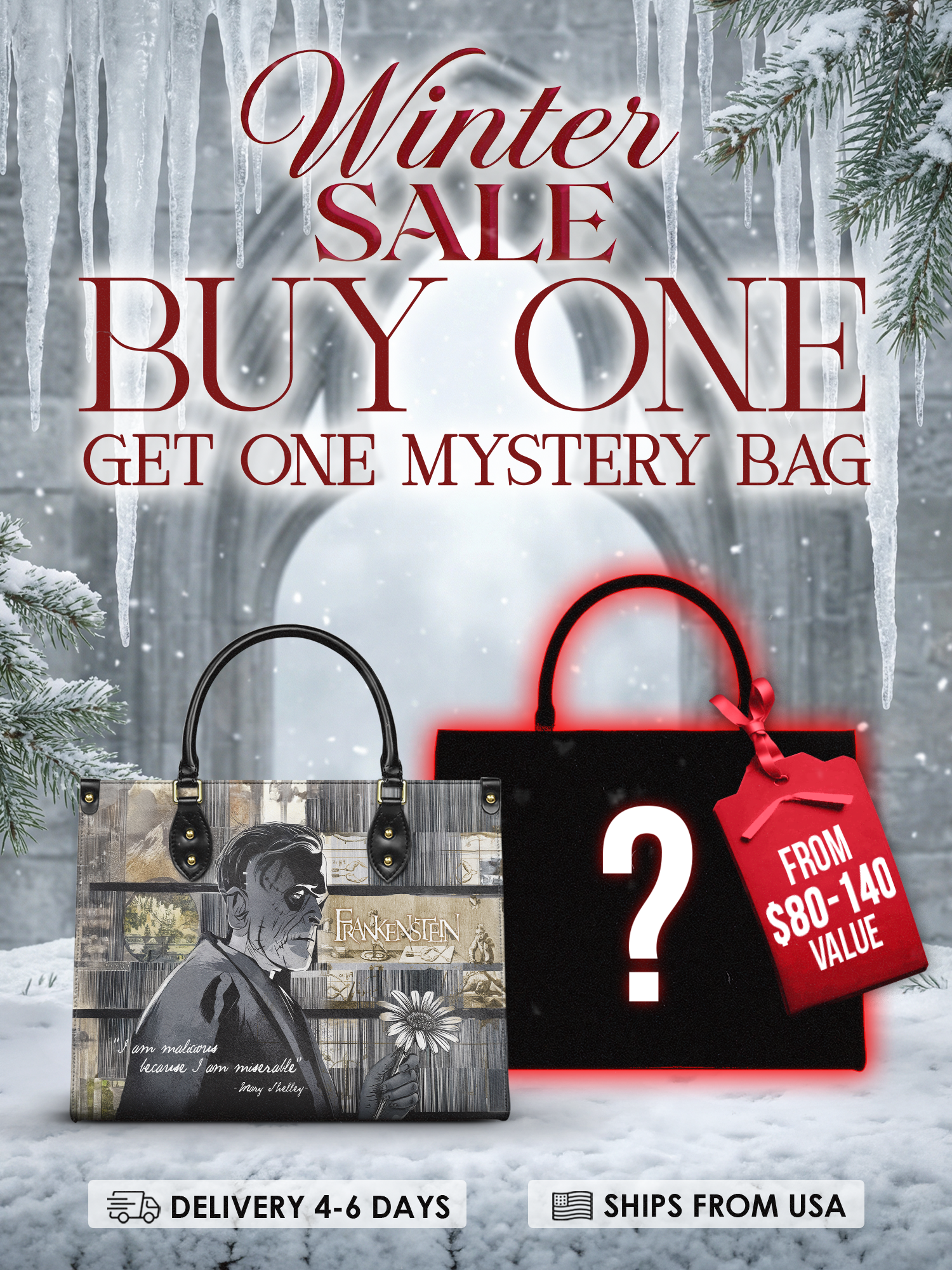Moody and poetic, the Gray Frankenstein handbag captures the tragic heart of the monster behind the myth. With vintage tones and shadowy art, it’s a quiet homage to longing, loneliness, and the dark beauty of misunderstood souls. Understated, haunting, and deeply human.
