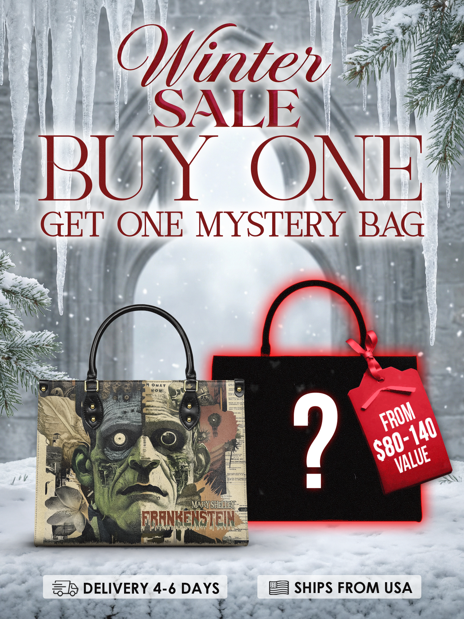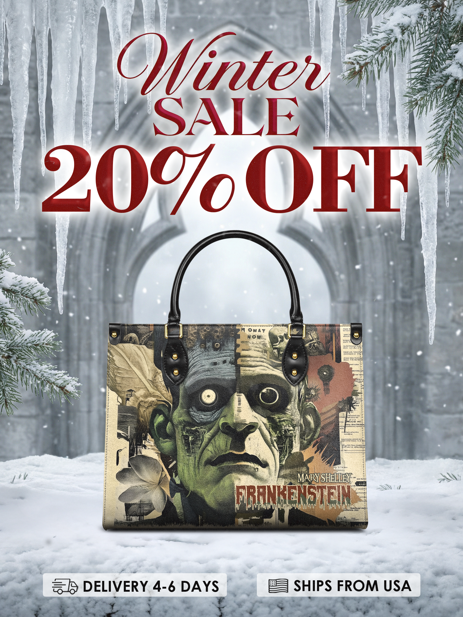 This Frankenstein Leather Handbag is bold, eerie, and full of classic horror vibes. The striking design features a stitched-together collage of the monster’s haunting face, layered with gothic imagery and vintage textures. It’s dark, dramatic, and impossible to ignore. Made from high-quality leather with sturdy black handles and gold details, this bag is perfect for book lovers, horror fans, and anyone who sees the beauty in the misunderstood. A little madness, a little genius—carry the legend with you.