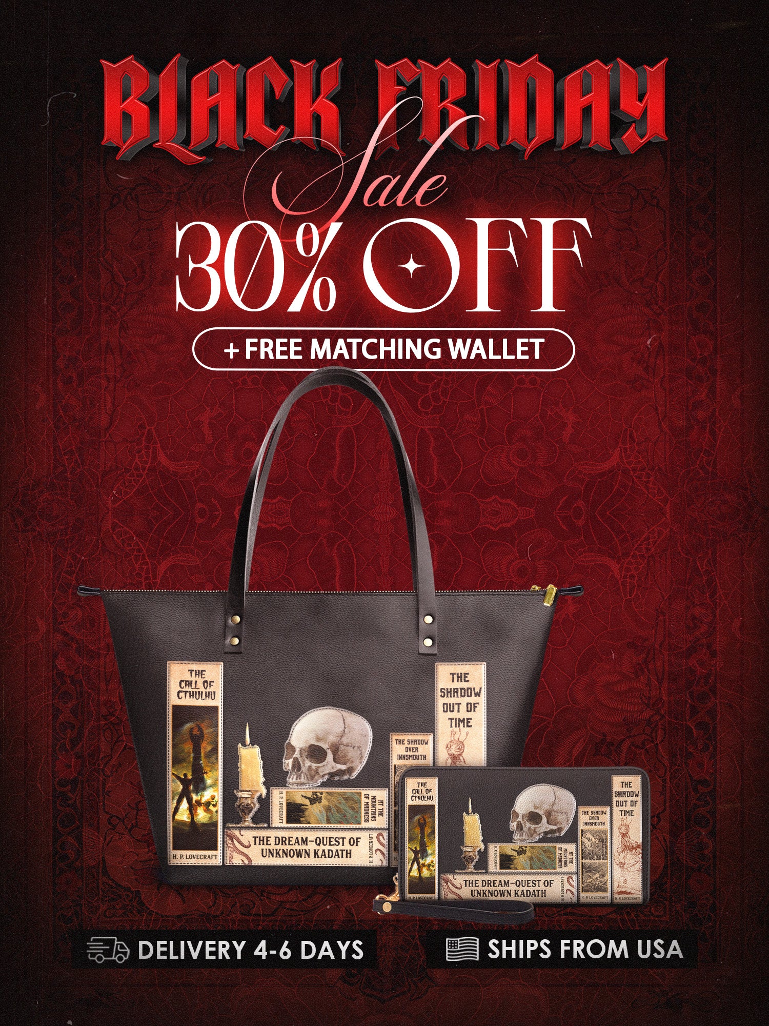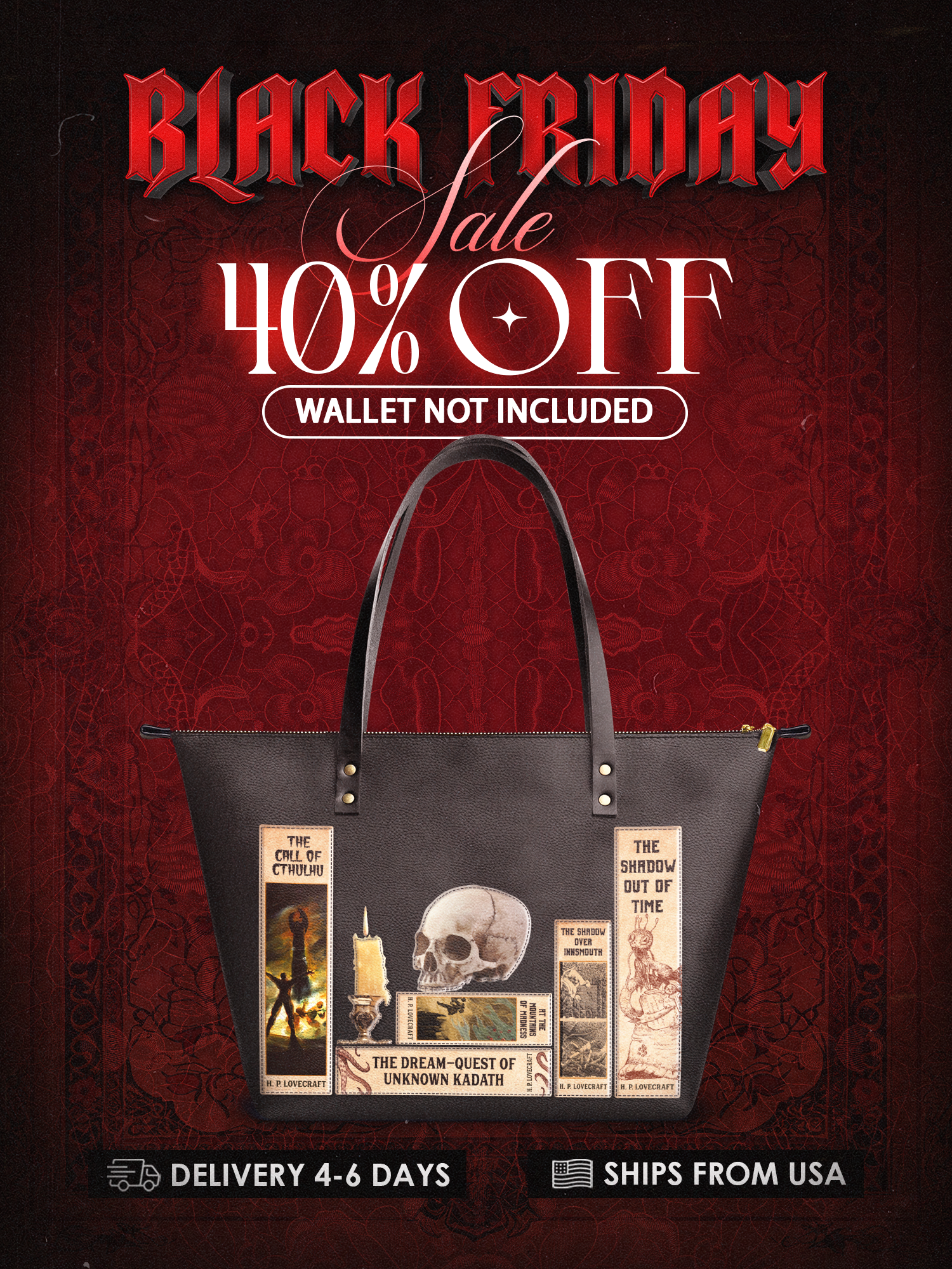 Handcrafted in the United States, this Premium Vegan Leather tote transforms mundane errands into a procession through the House of Usher.