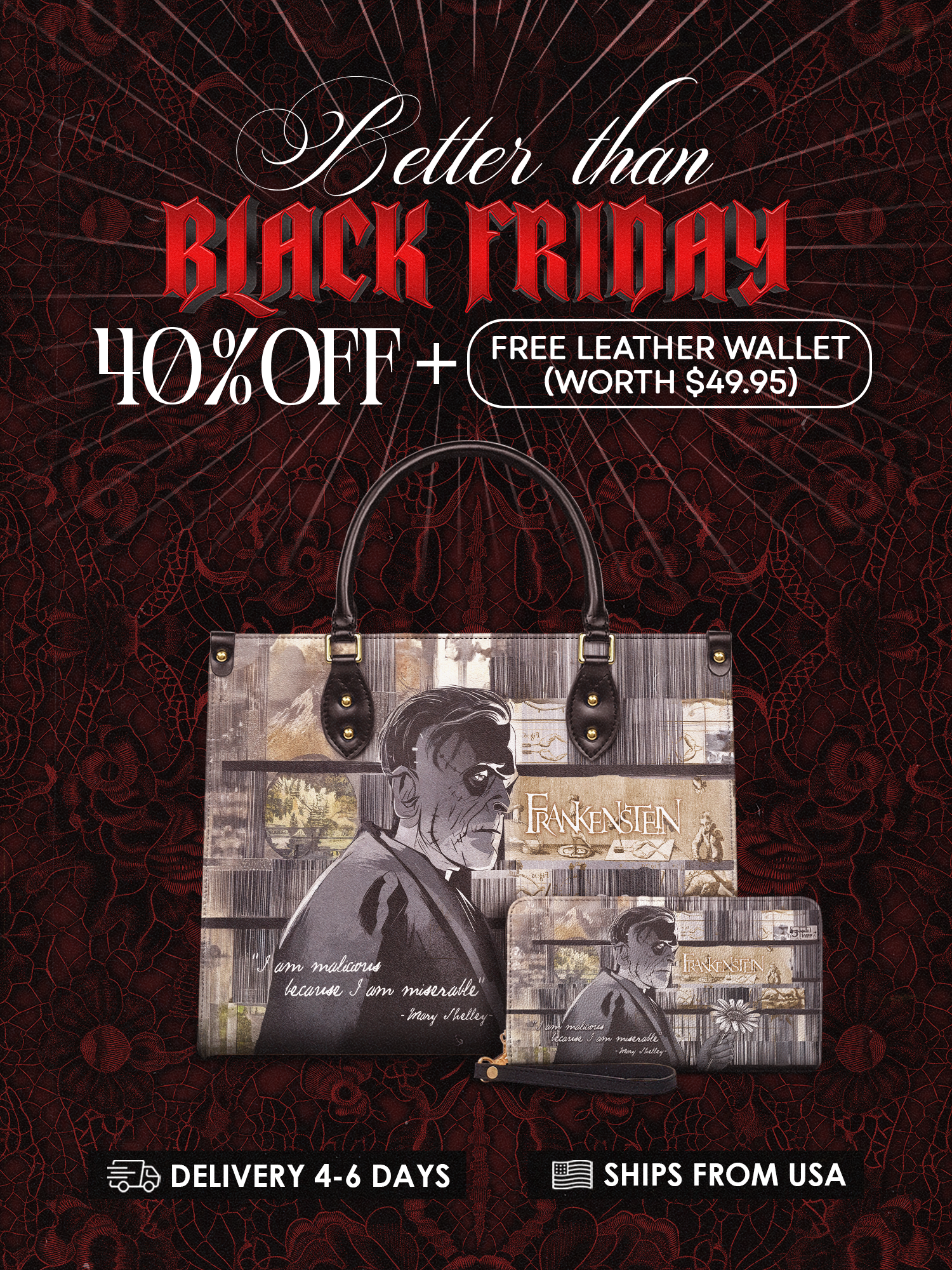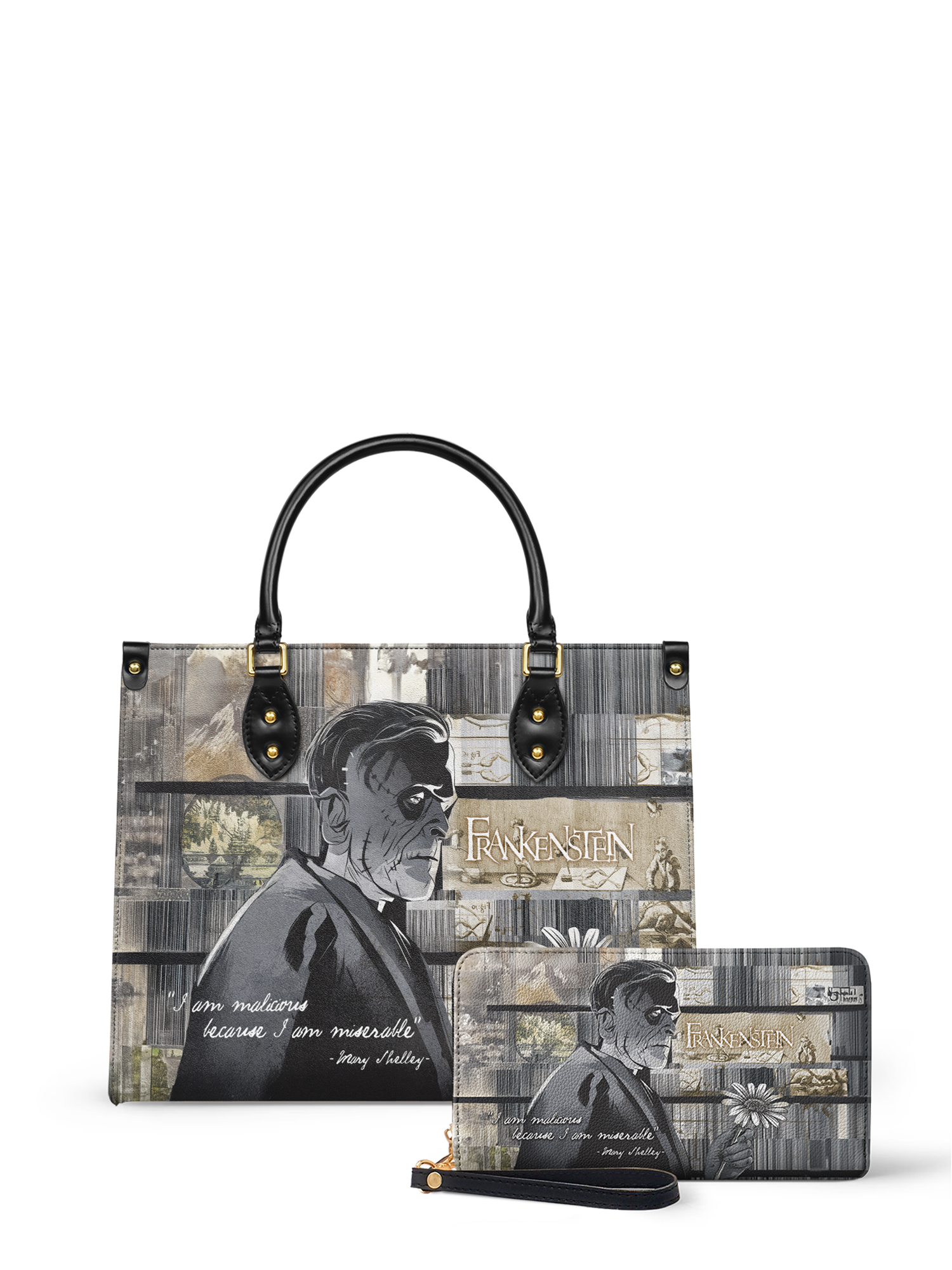 Moody and poetic, the Gray Frankenstein handbag captures the tragic heart of the monster behind the myth. With vintage tones and shadowy art, it’s a quiet homage to longing, loneliness, and the dark beauty of misunderstood souls. Understated, haunting, and deeply human.