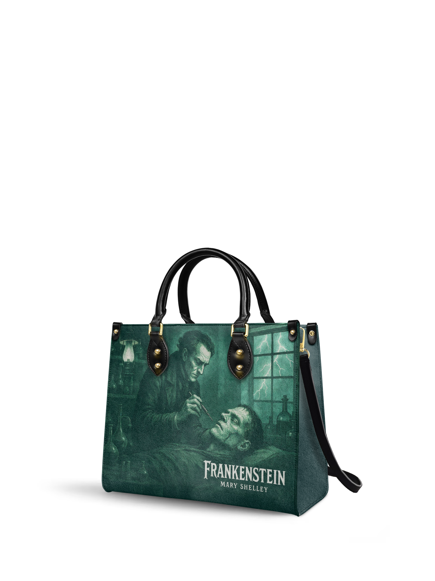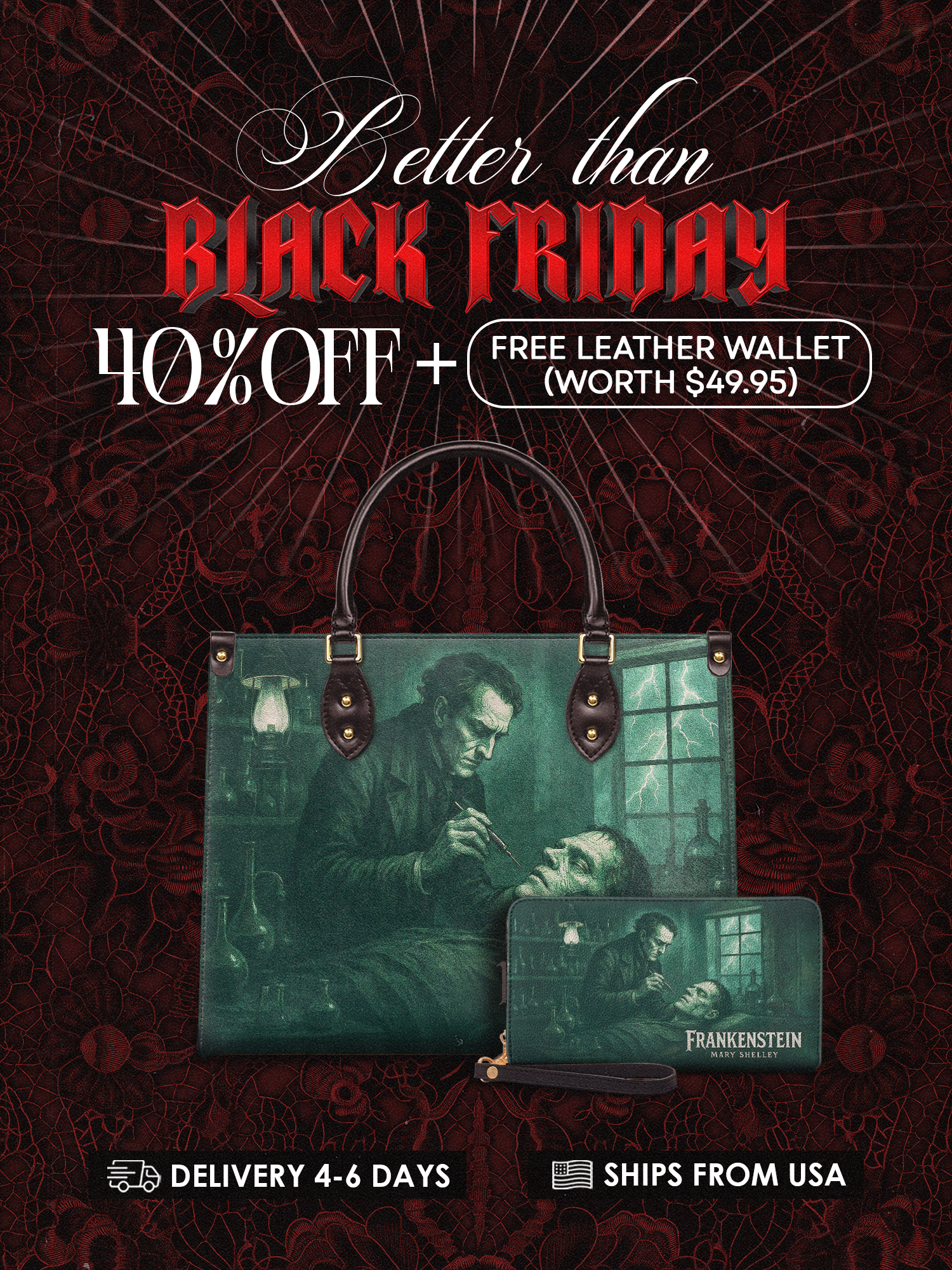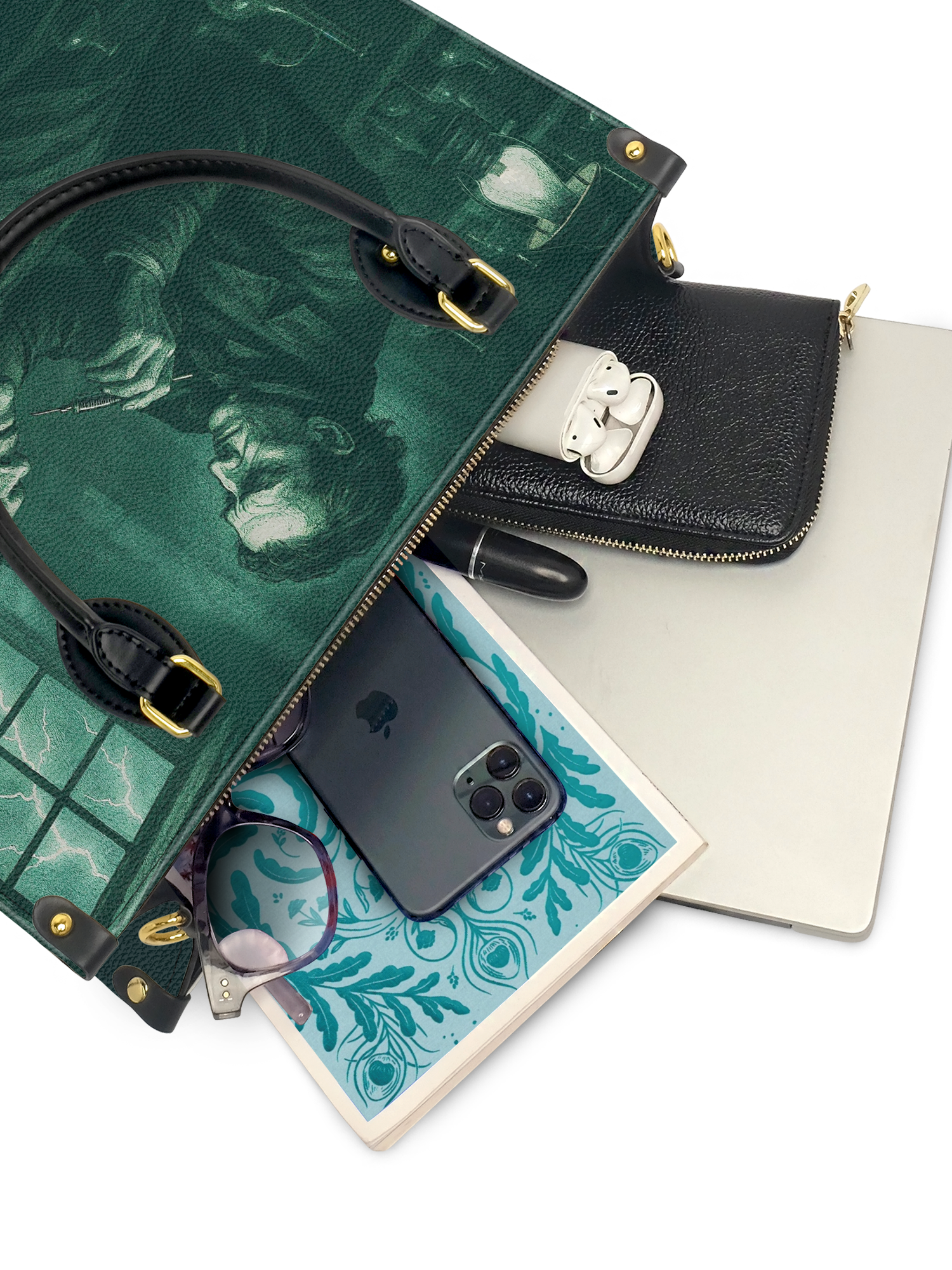 The Green Frankenstein handbag channels vintage horror at its most haunting. With eerie emerald tones and classic film imagery, it’s a love letter to the original tale of terror and creation. Elegant, eerie, and steeped in cinematic nostalgia—it’s horror history you can carry.