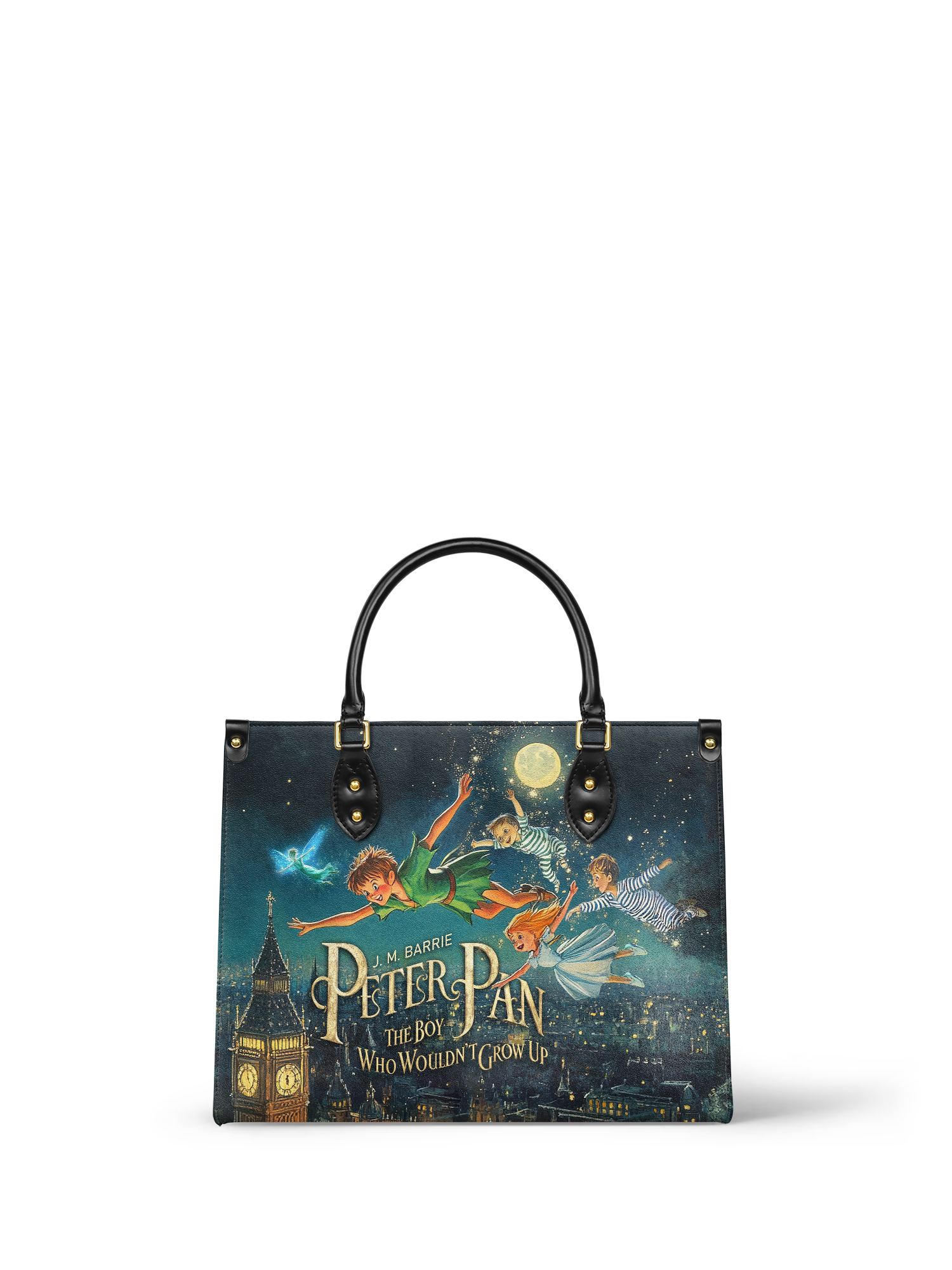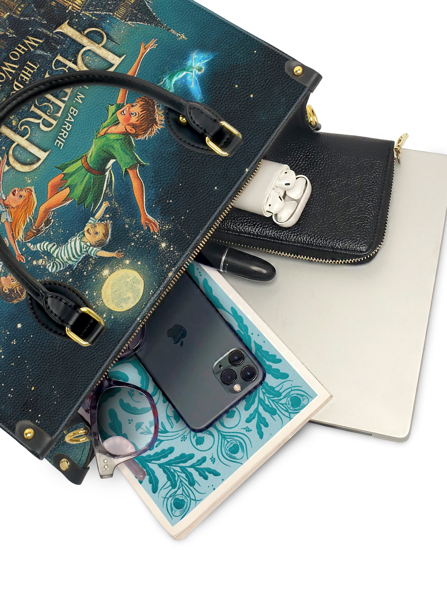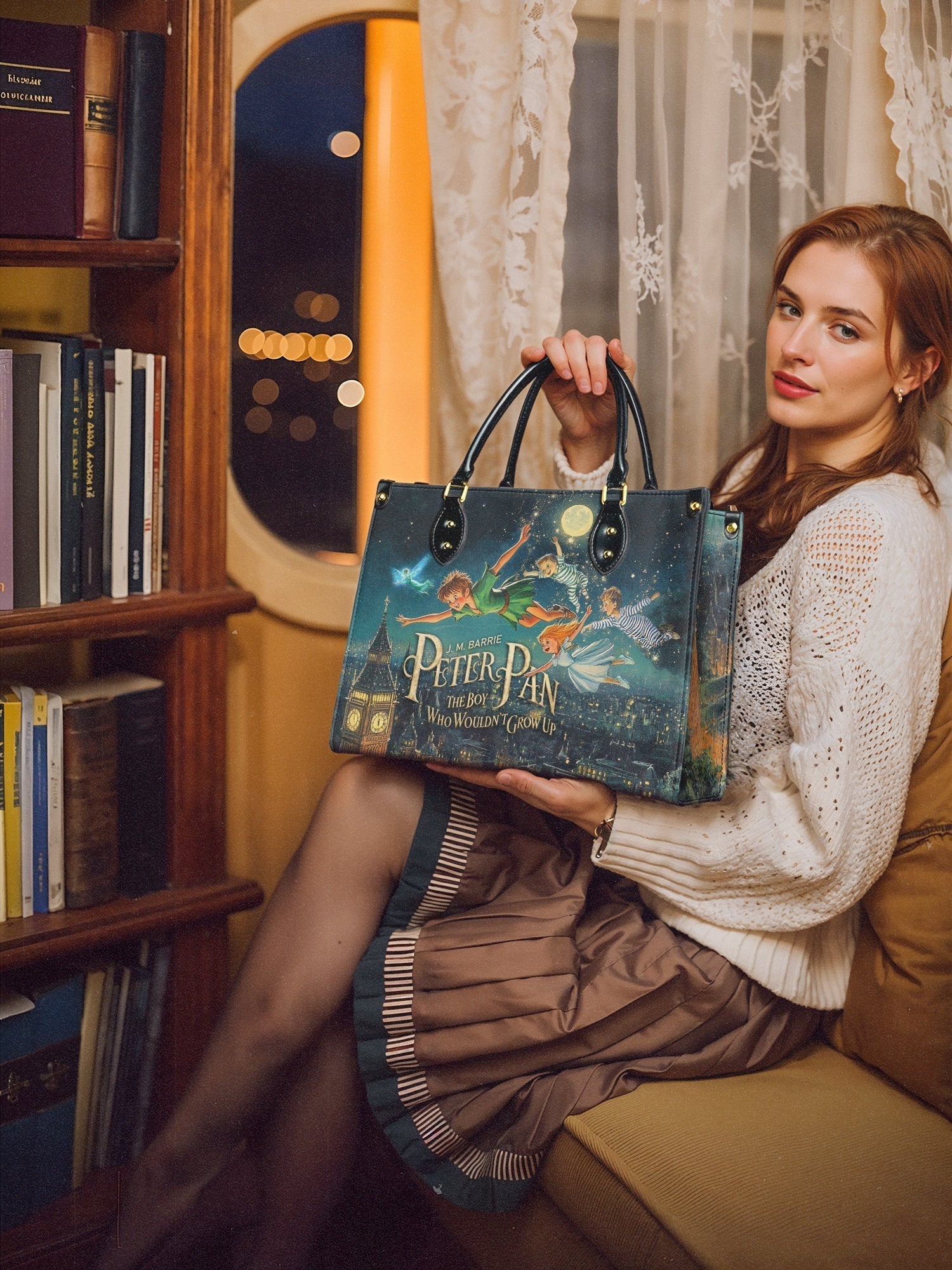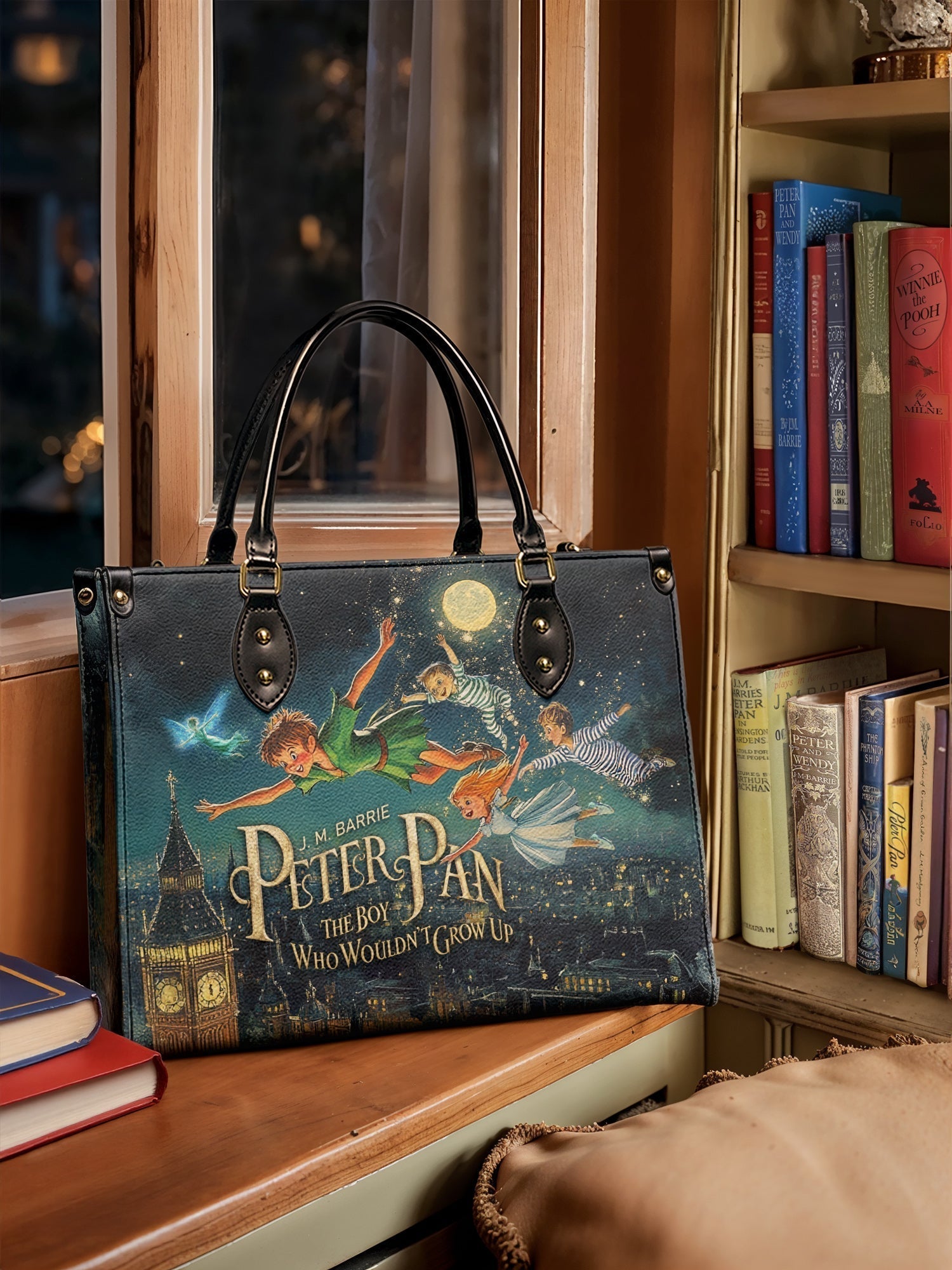 This Peter Pan Leather Handbag is pure magic and adventure. The dreamy design shows Peter, Wendy, John, and Michael soaring over London, with Big Ben glowing below and the moon lighting their way. The colors are rich, the details are enchanting, and the whole thing feels like a page from a storybook. Made from high-quality leather with sturdy black handles and gold accents, this bag is perfect for book lovers, dreamers, and anyone who never wants to grow up.