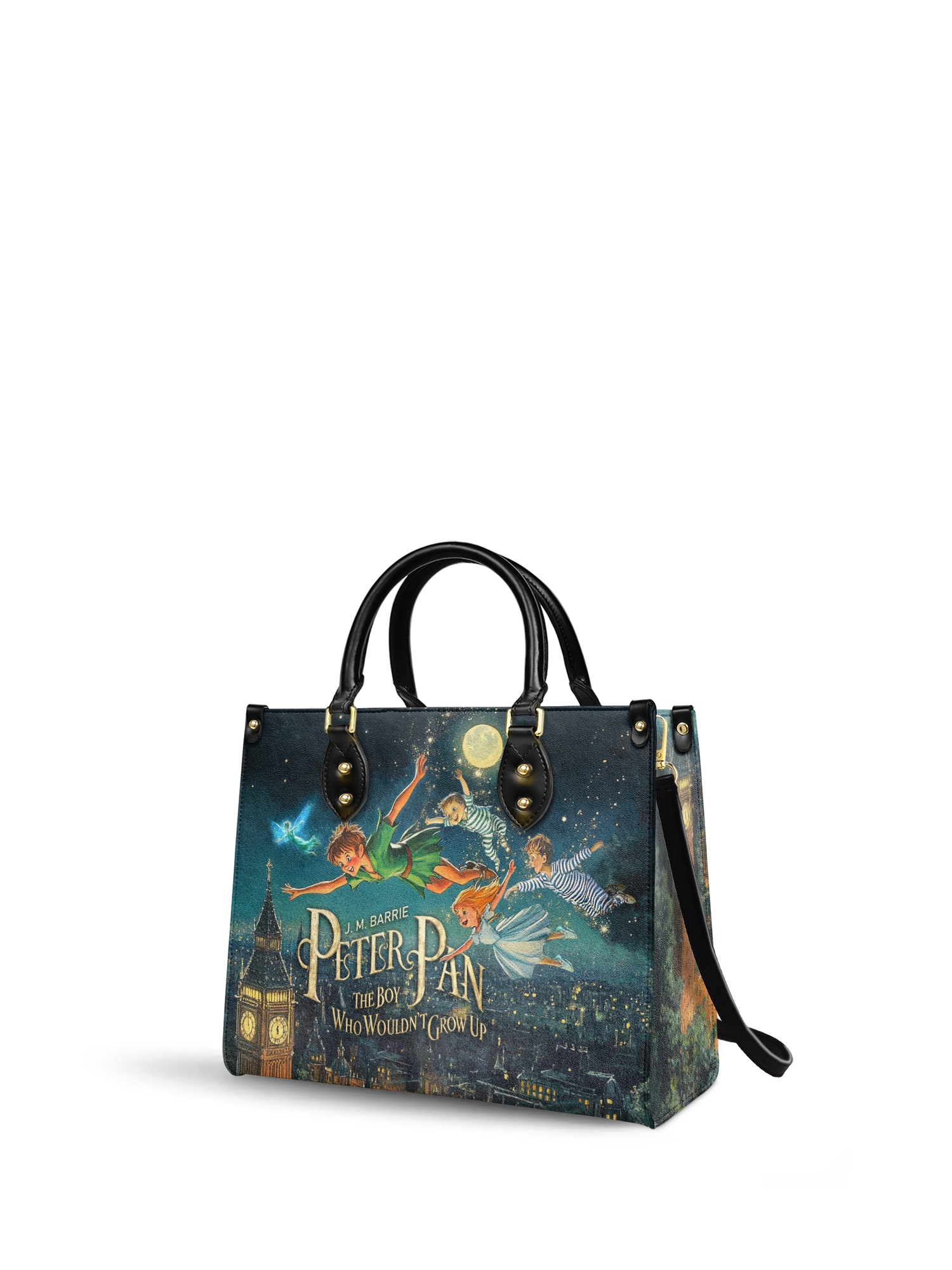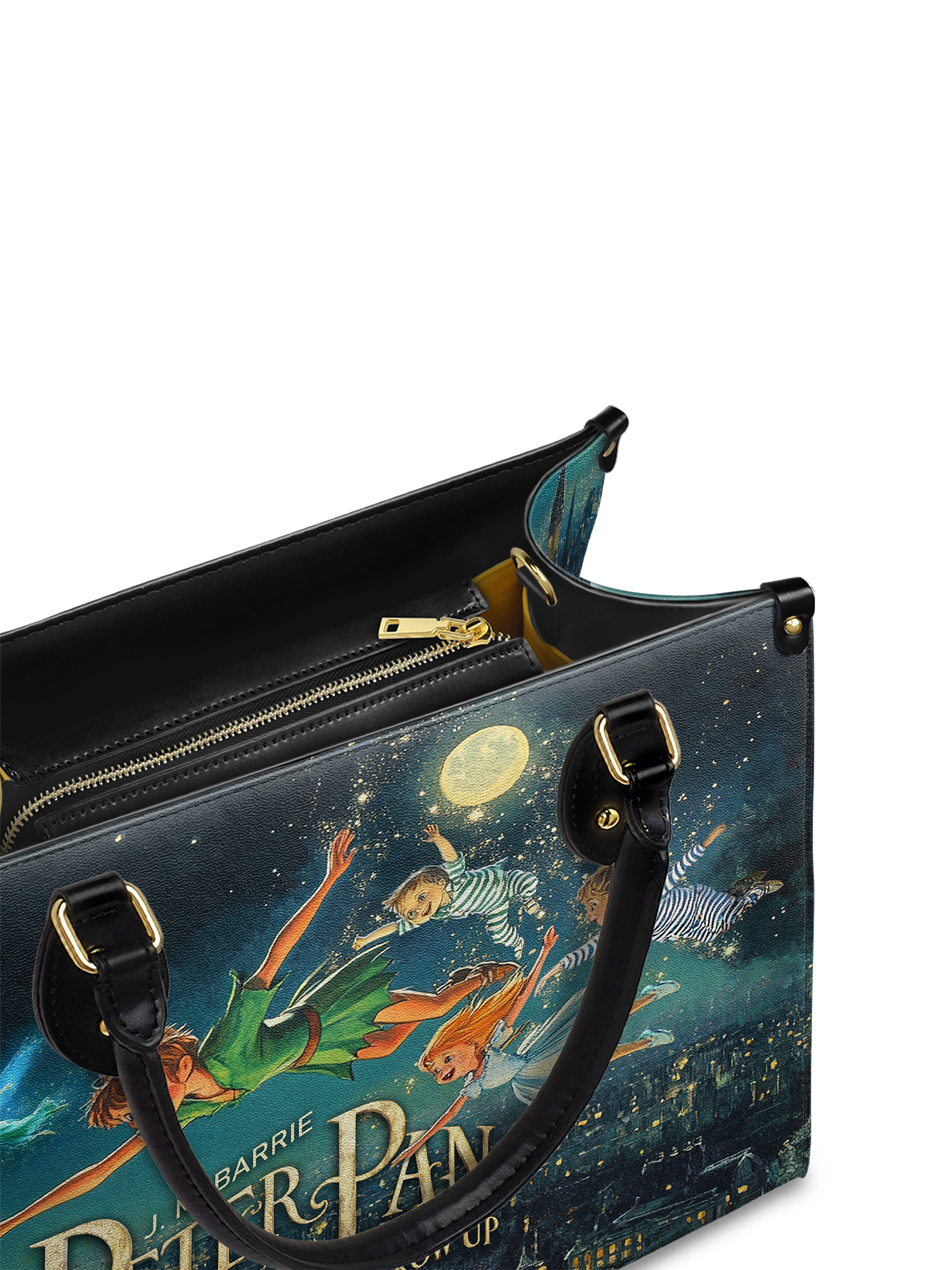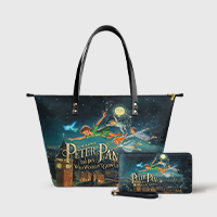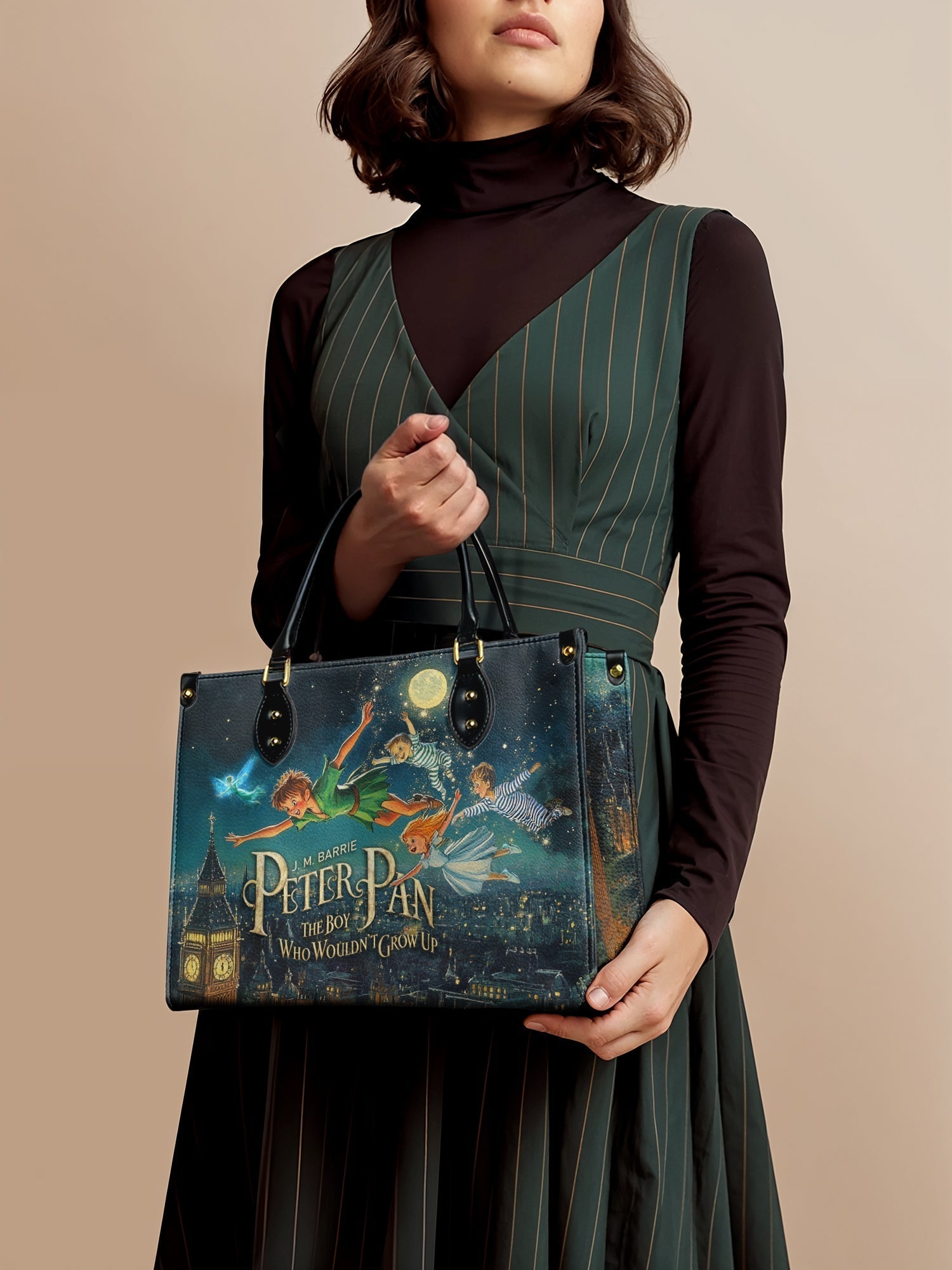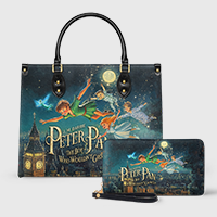This Peter Pan Leather Handbag is pure magic and adventure. The dreamy design shows Peter, Wendy, John, and Michael soaring over London, with Big Ben glowing below and the moon lighting their way. The colors are rich, the details are enchanting, and the whole thing feels like a page from a storybook. Made from high-quality leather with sturdy black handles and gold accents, this bag is perfect for book lovers, dreamers, and anyone who never wants to grow up.