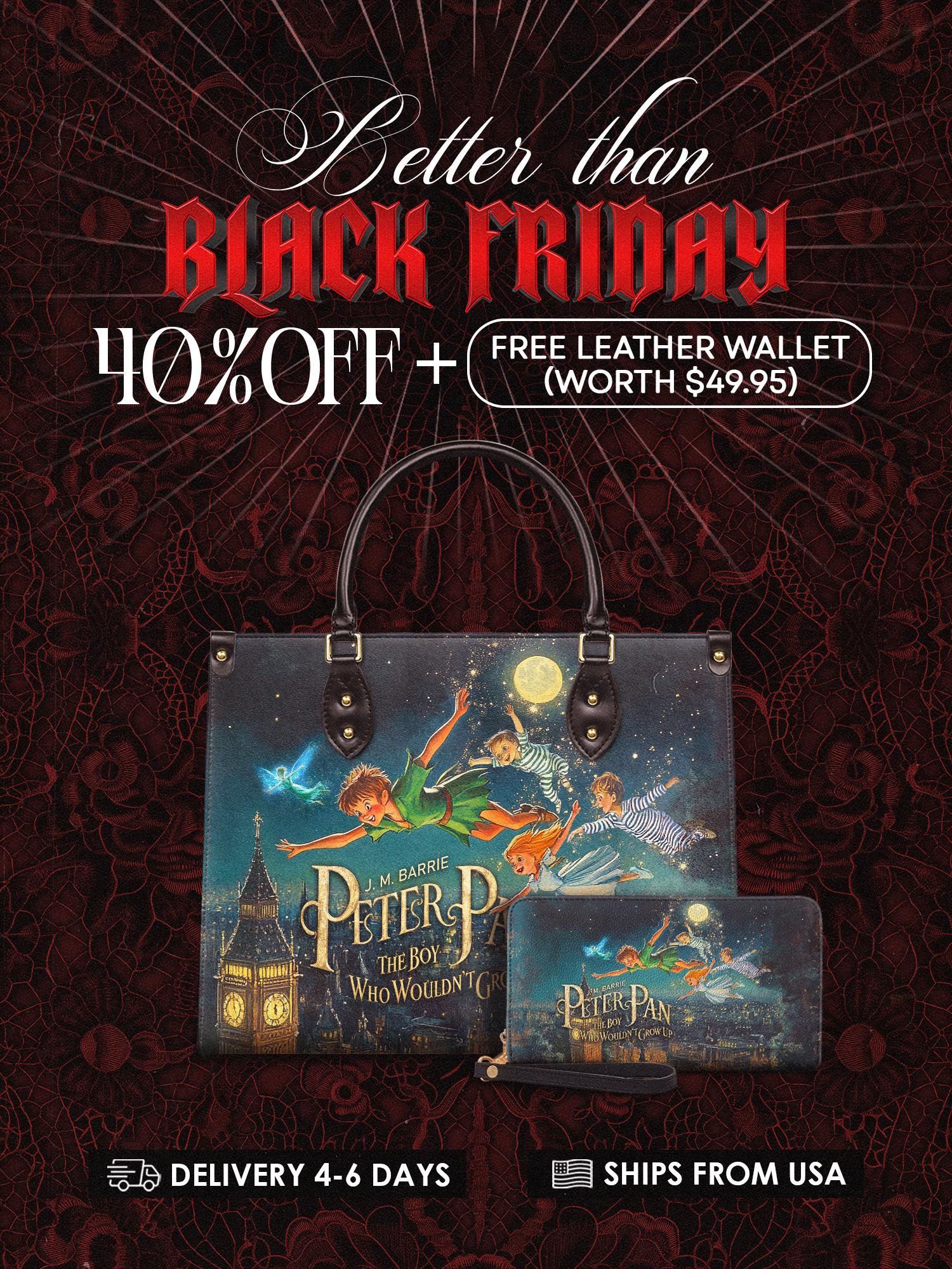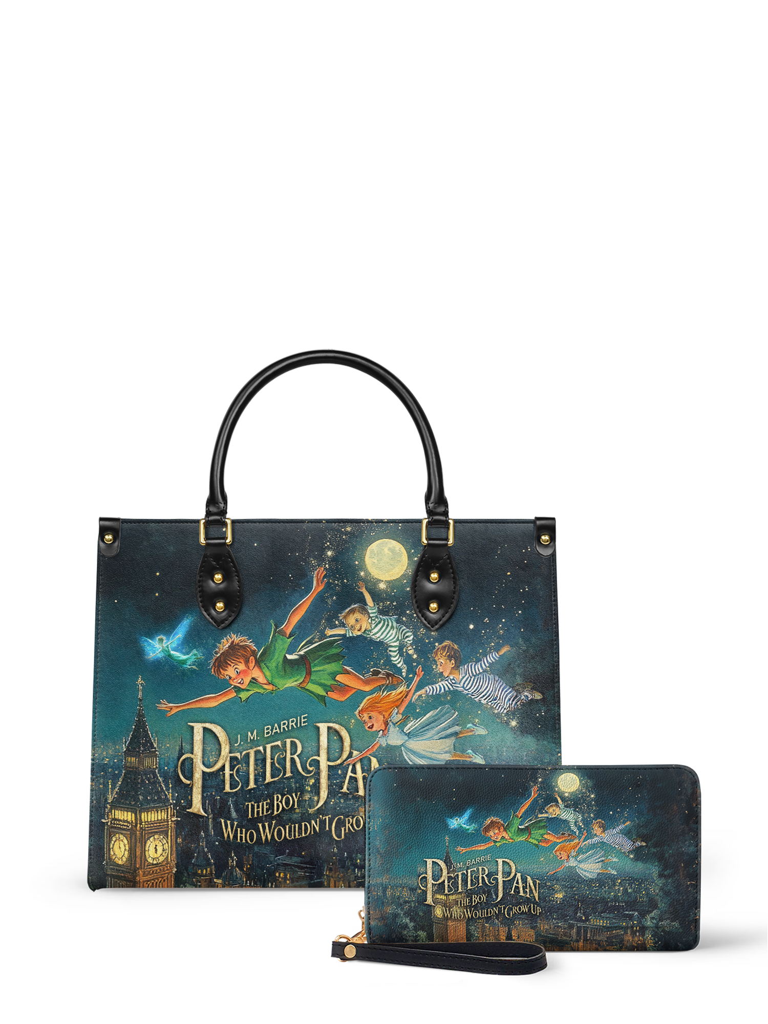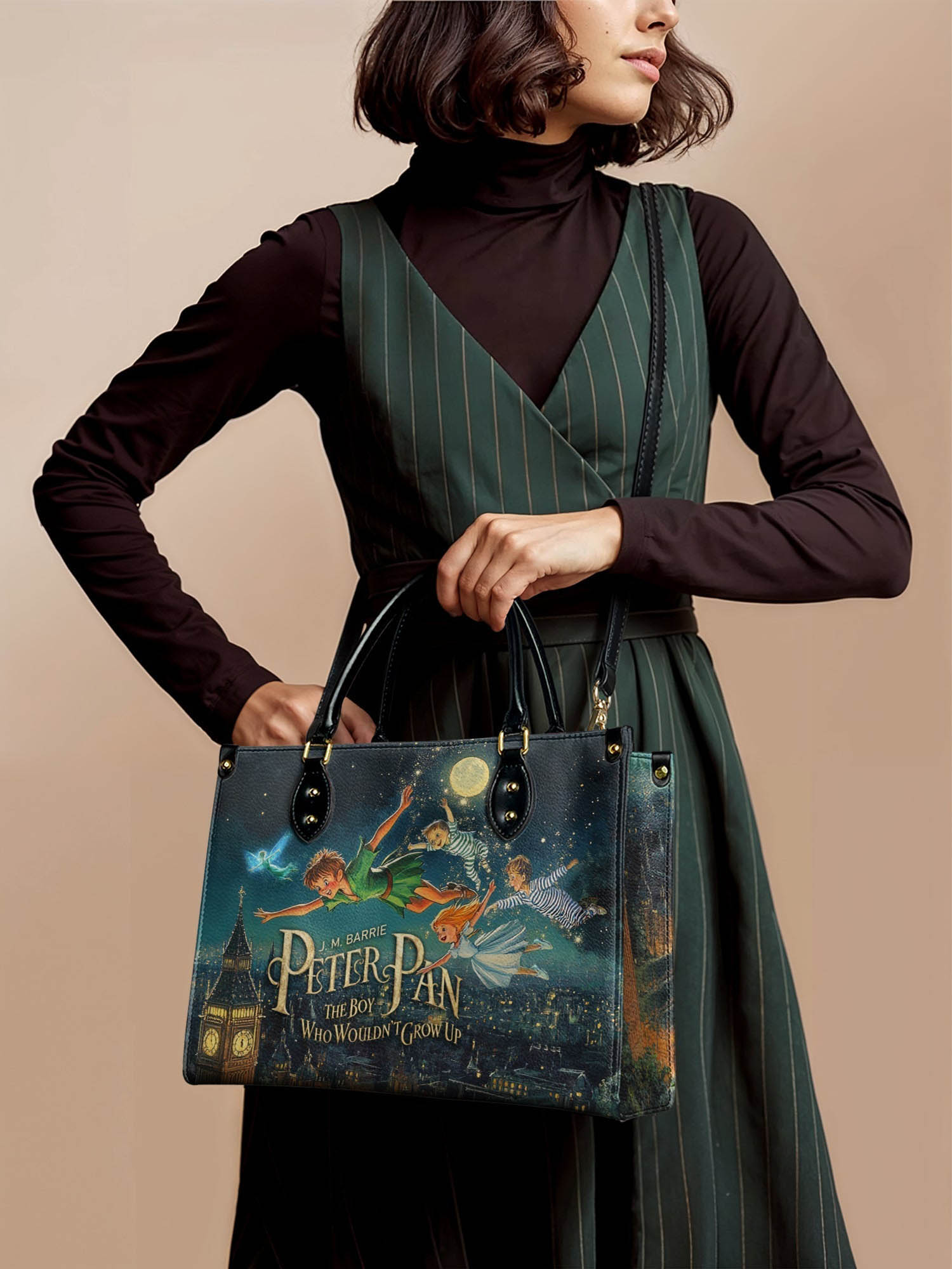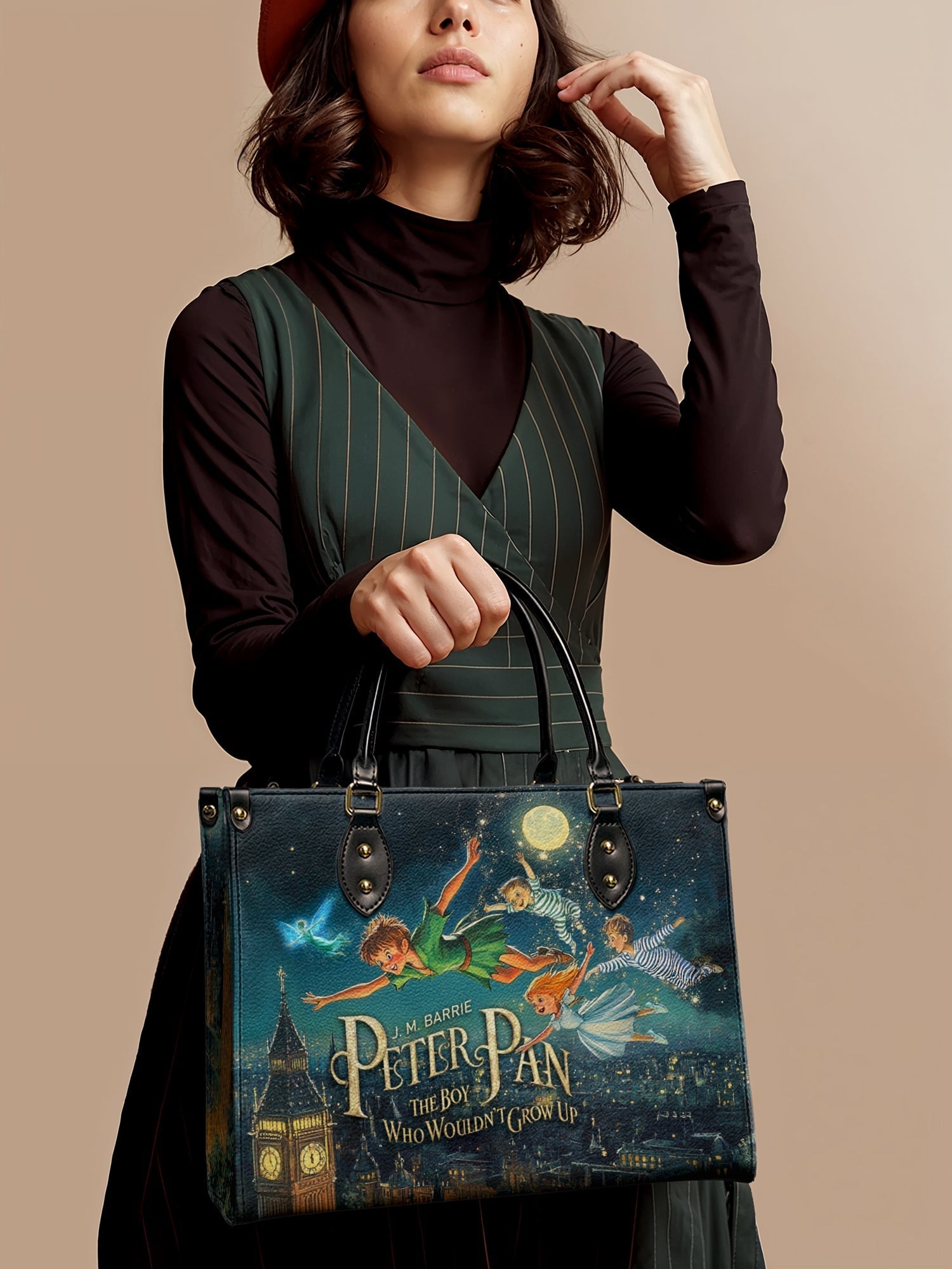 This Peter Pan Leather Handbag is pure magic and adventure. The dreamy design shows Peter, Wendy, John, and Michael soaring over London, with Big Ben glowing below and the moon lighting their way. The colors are rich, the details are enchanting, and the whole thing feels like a page from a storybook. Made from high-quality leather with sturdy black handles and gold accents, this bag is perfect for book lovers, dreamers, and anyone who never wants to grow up.