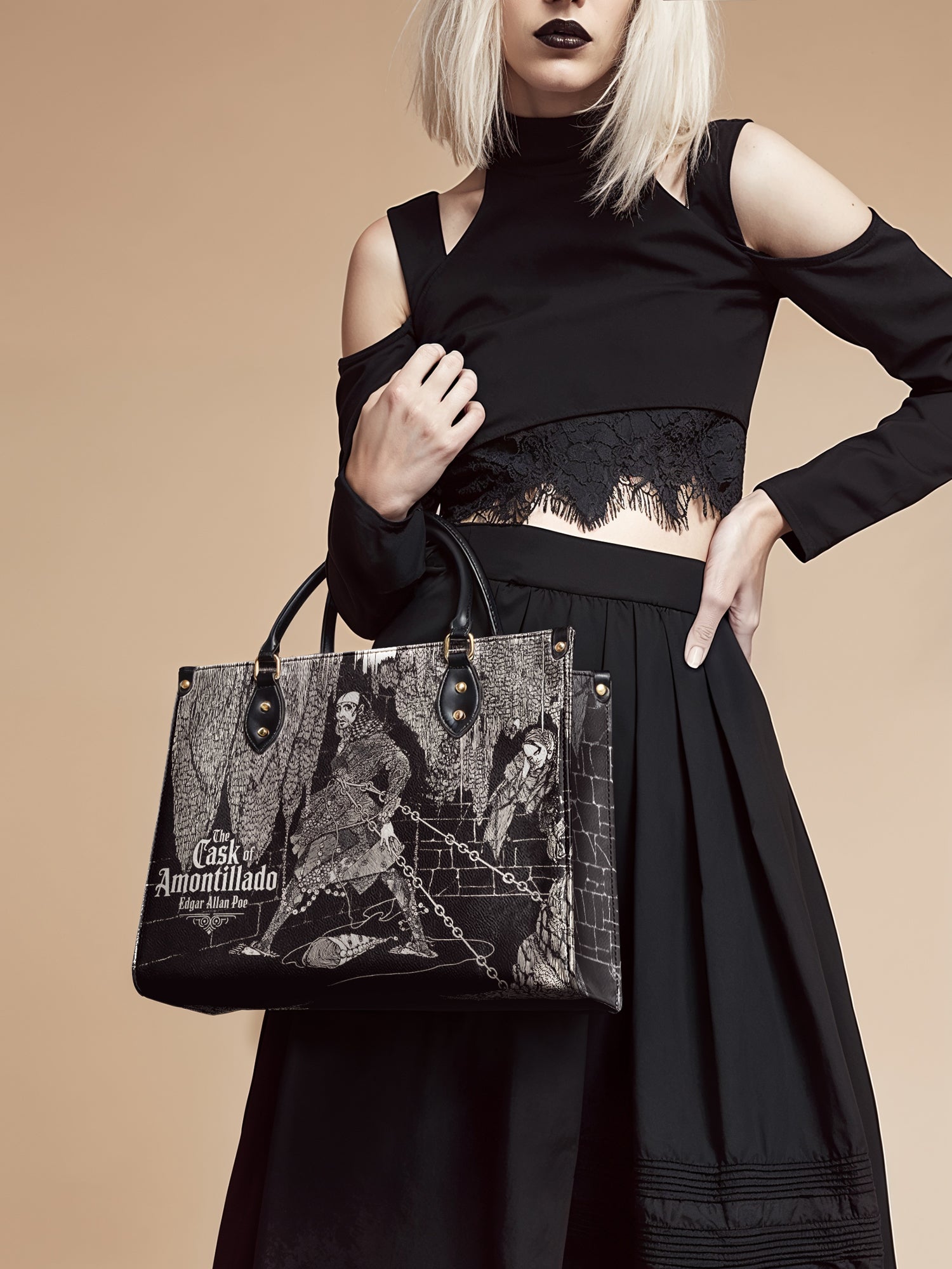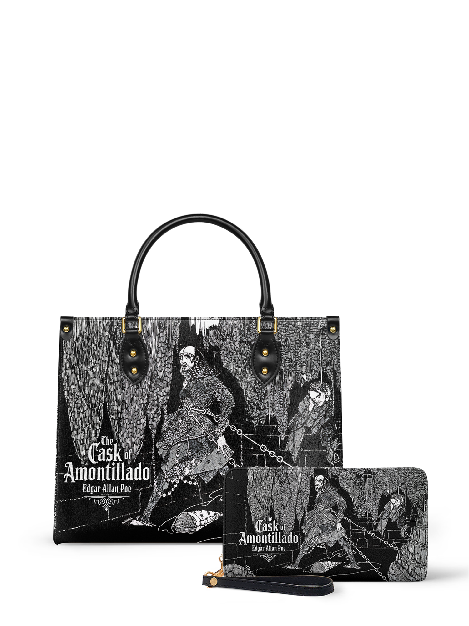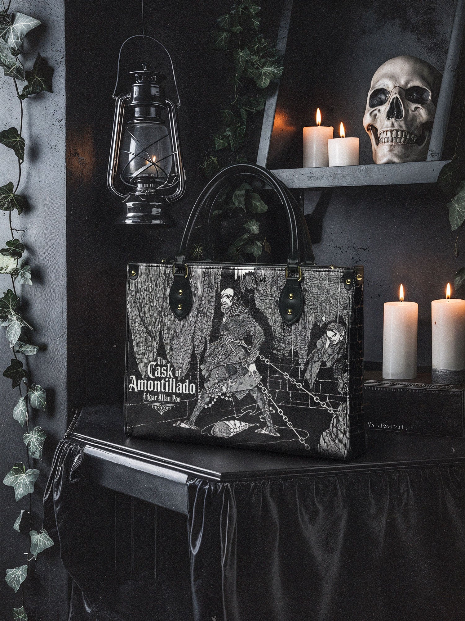 “For the love of God, Montresor!” A whisper of revenge echoes through this chilling design inspired by Poe’s The Cask of Amontillado. Crafted for those who savor the slow burn of a perfectly plotted vengeance, this leather handbag carries more than just your daily essentials—it carries a secret. Gothic, bold, and unforgettable, it's the perfect statement for readers who know that beneath every calm surface, madness may be bricked in.