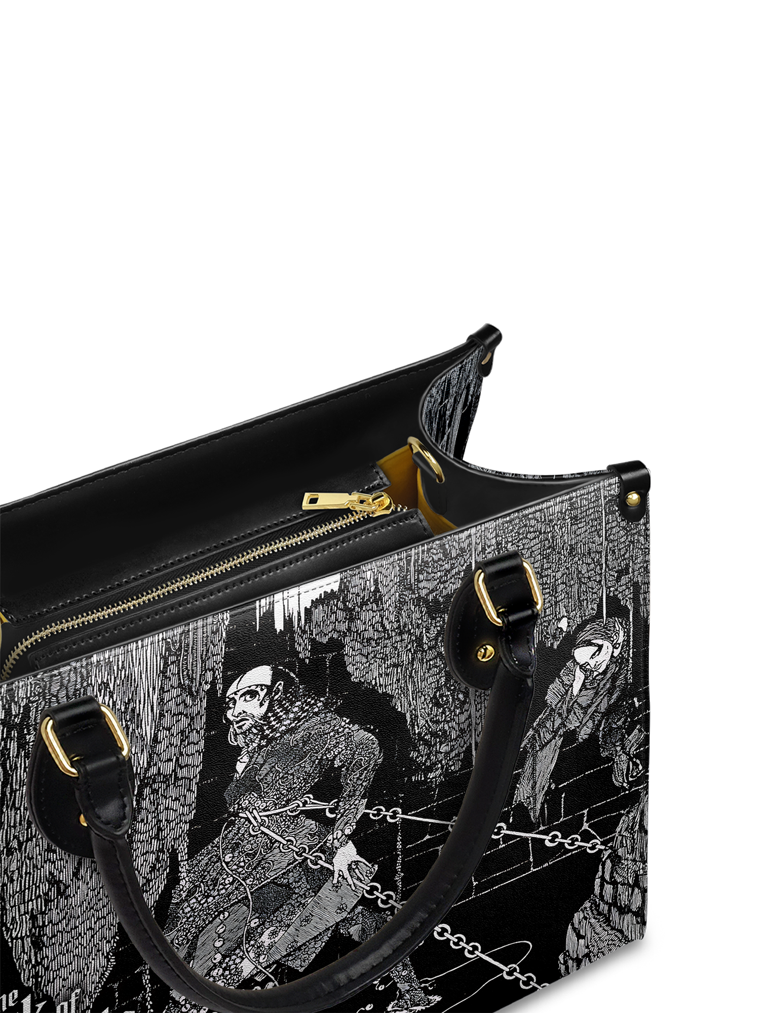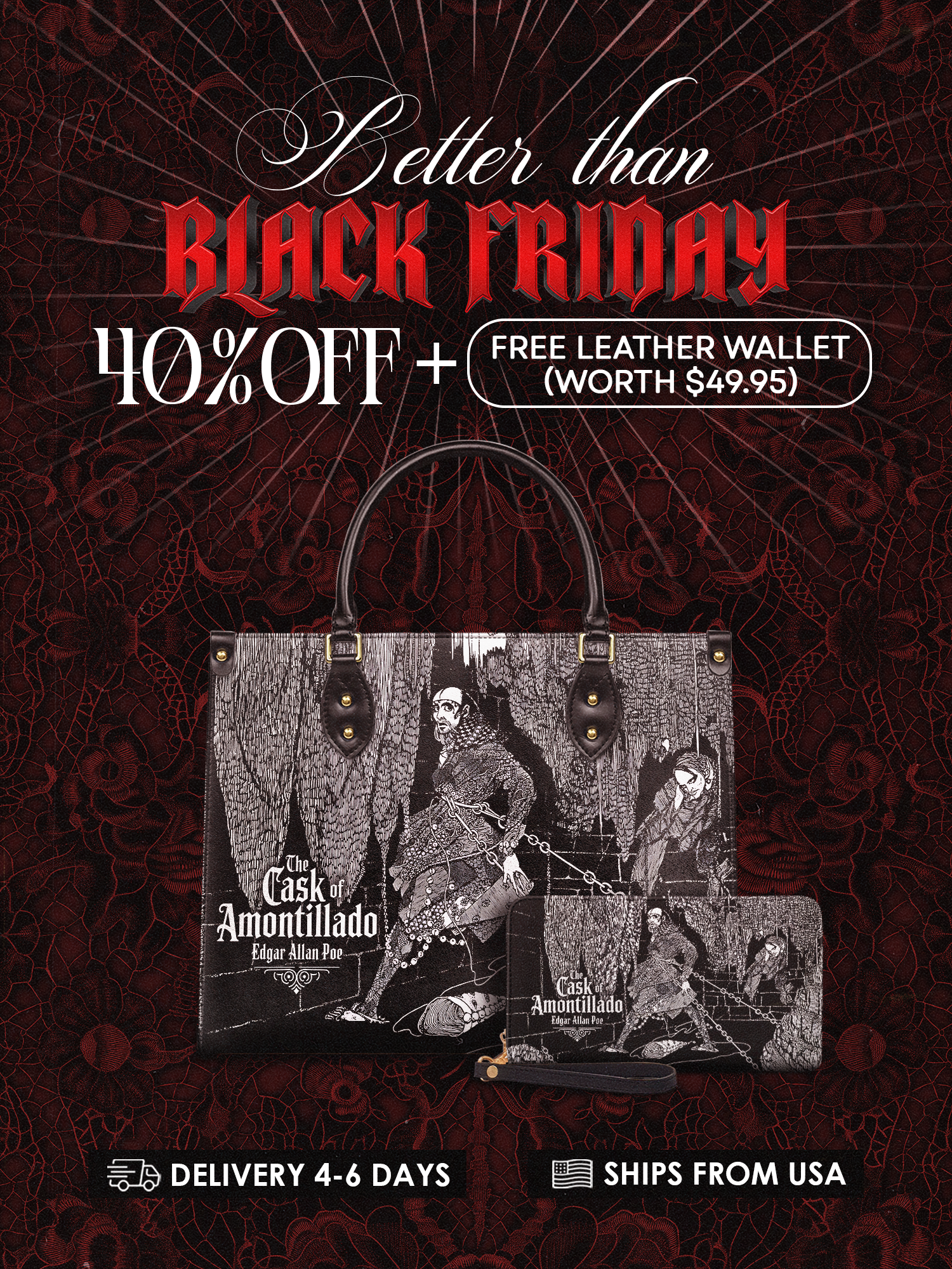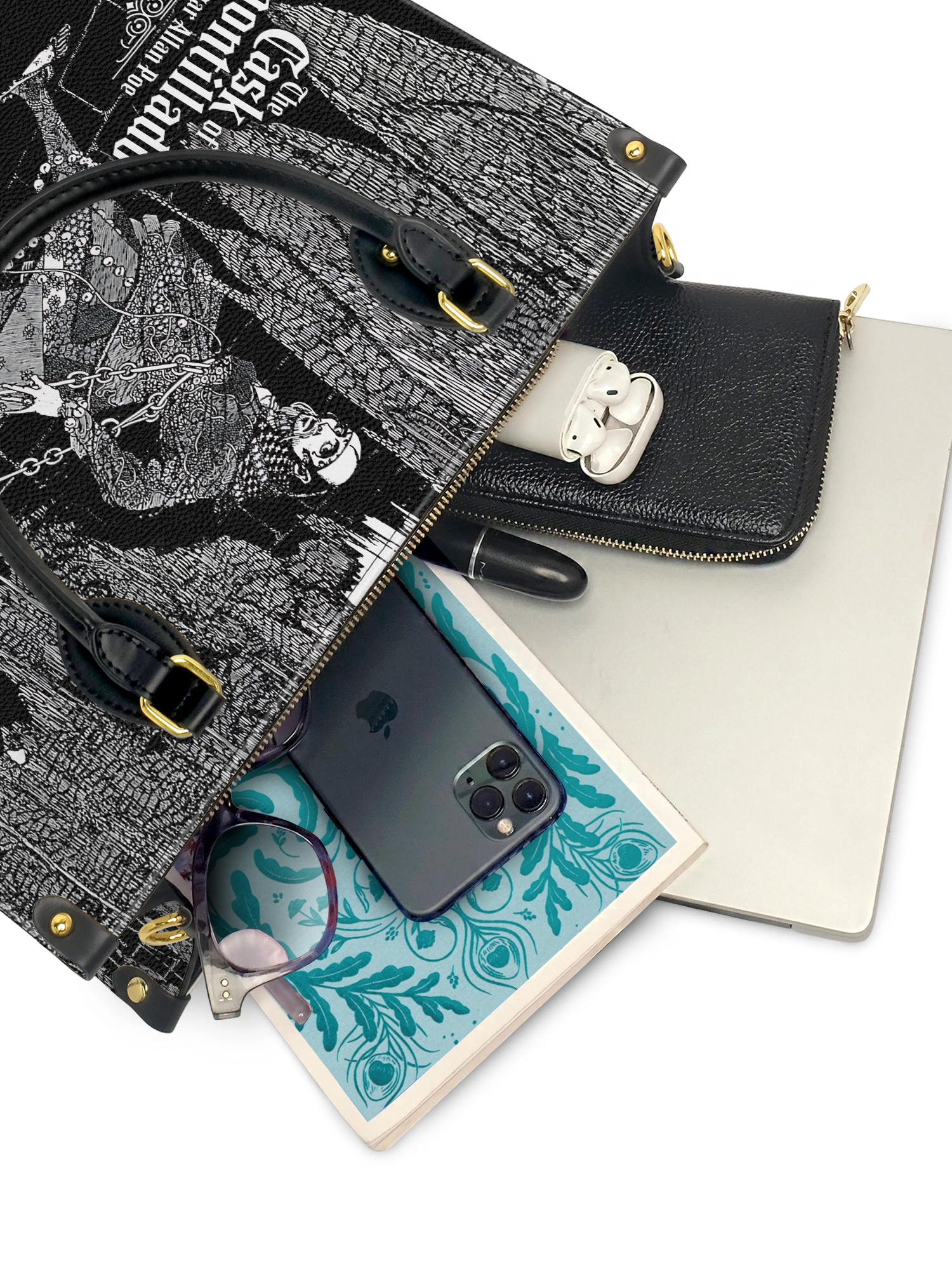 “For the love of God, Montresor!” A whisper of revenge echoes through this chilling design inspired by Poe’s The Cask of Amontillado. Crafted for those who savor the slow burn of a perfectly plotted vengeance, this leather handbag carries more than just your daily essentials—it carries a secret. Gothic, bold, and unforgettable, it's the perfect statement for readers who know that beneath every calm surface, madness may be bricked in.