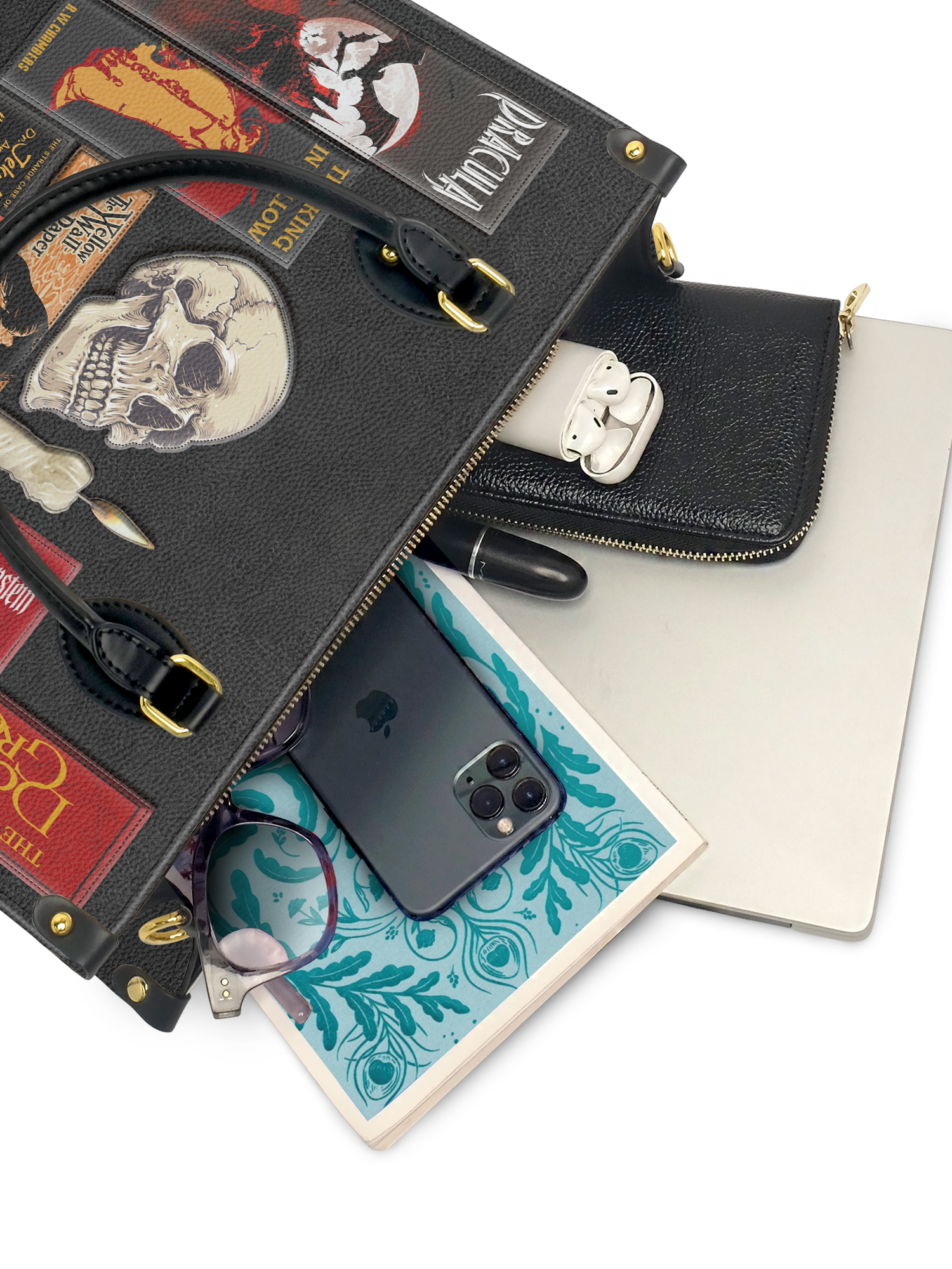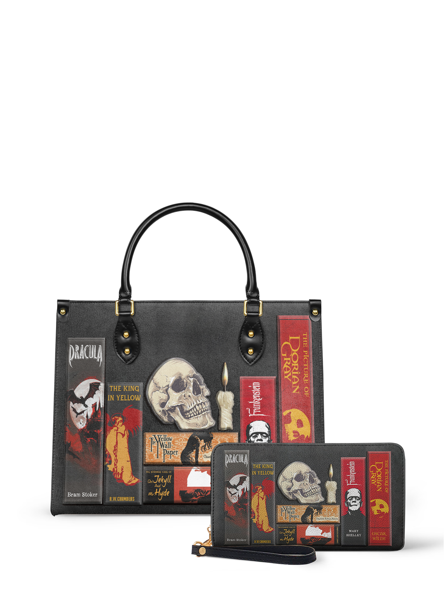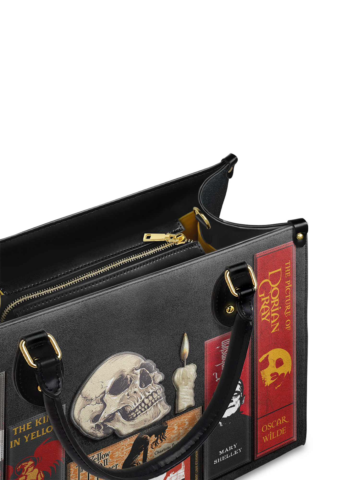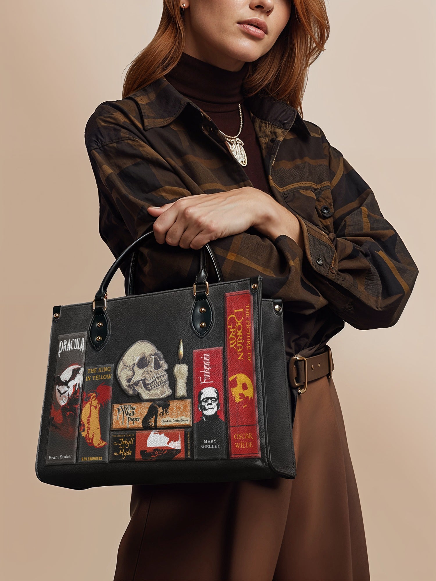 This Codex of Gothic Tales Leather Handbag is dripping with eerie elegance. A haunting collection of classic horror books—Dracula, Frankenstein, The Picture of Dorian Gray, The King in Yellow, and more—stacked together like a forbidden library. A weathered skull, a flickering candle, and vintage textures bring the dark academia aesthetic to life. Made from high-quality leather with sleek black handles and gold accents, this bag is perfect for book lovers, gothic souls, and those who love a touch of mystery. Dare to carry the dark tales that never fade?