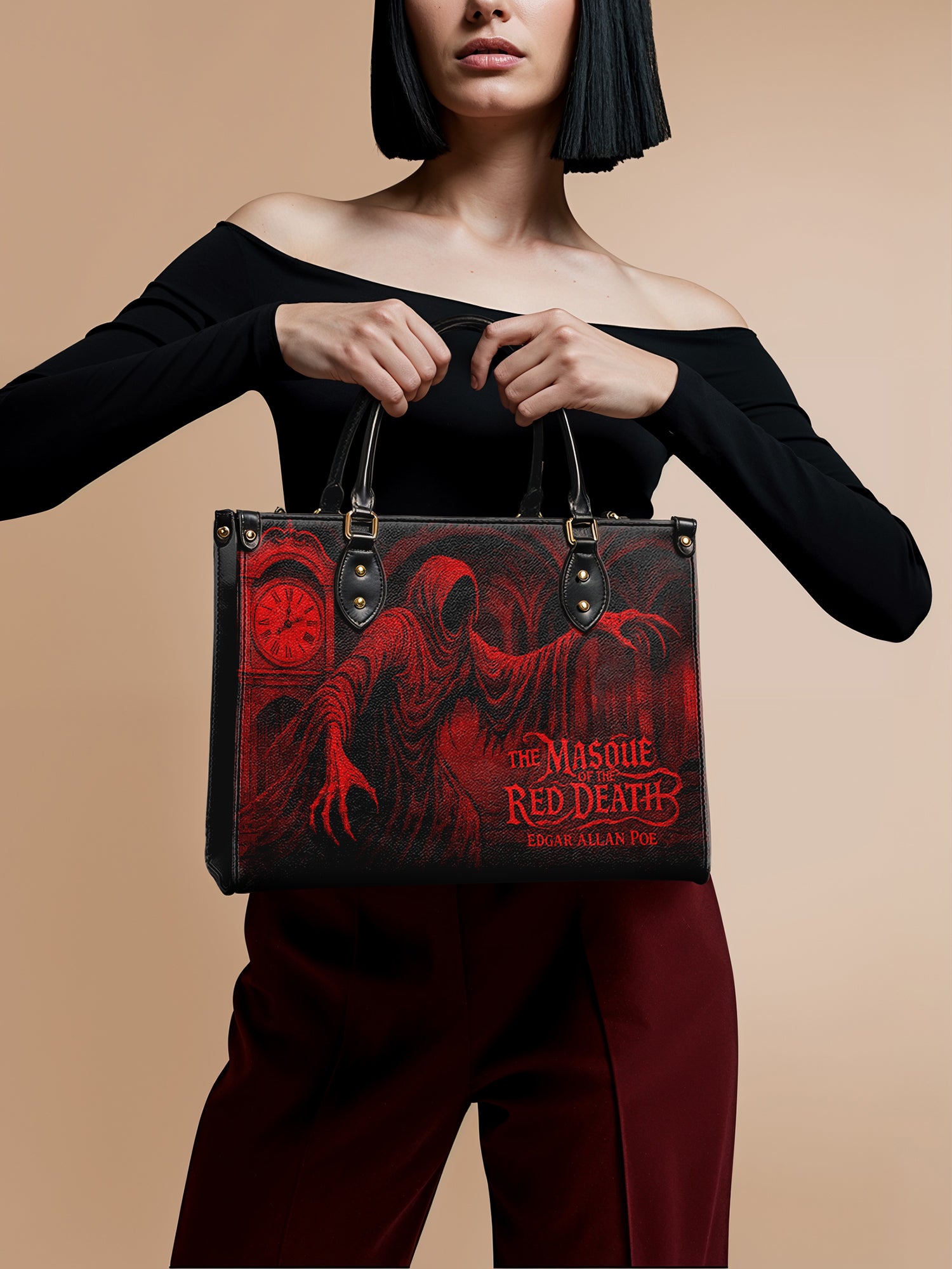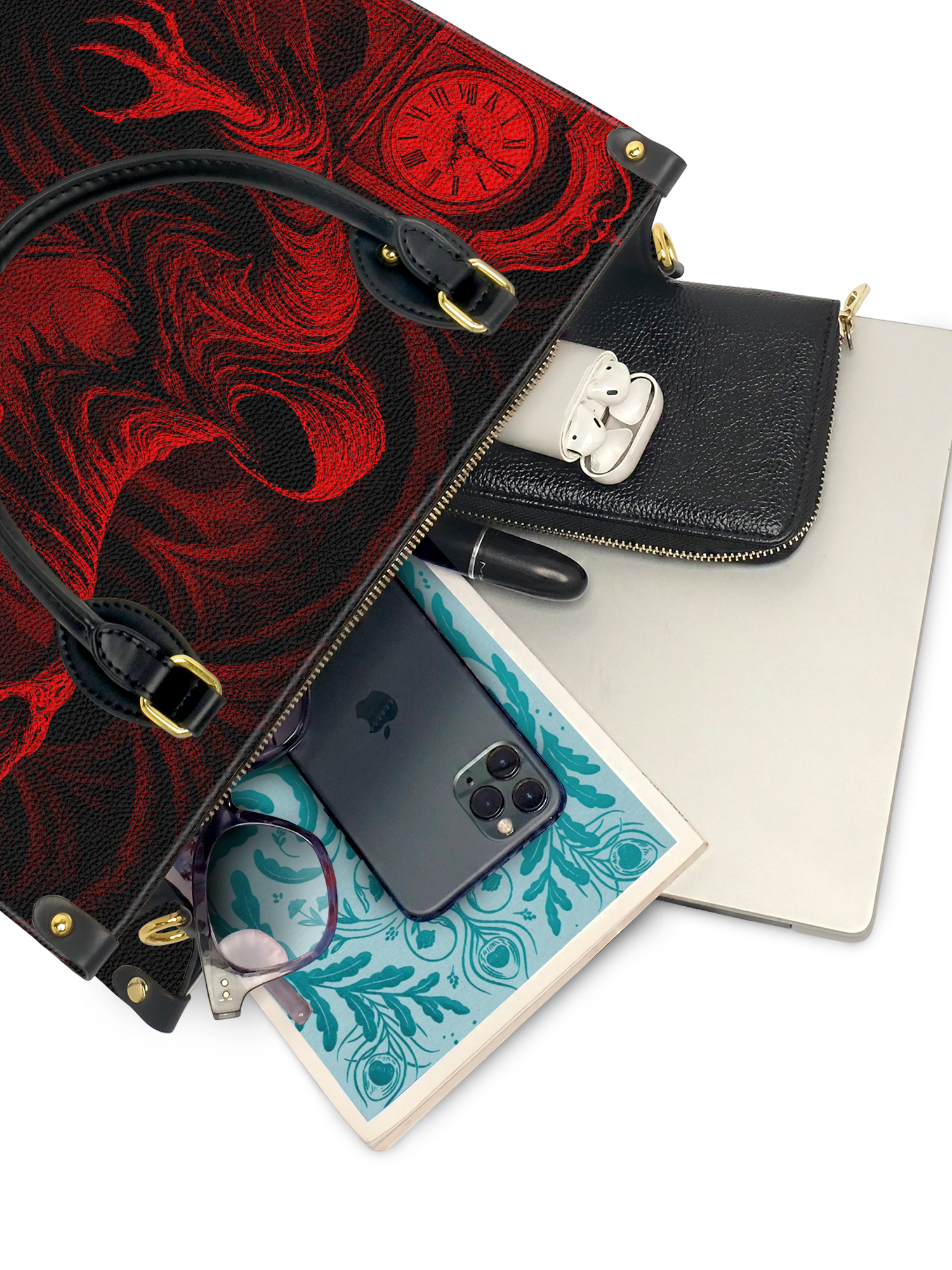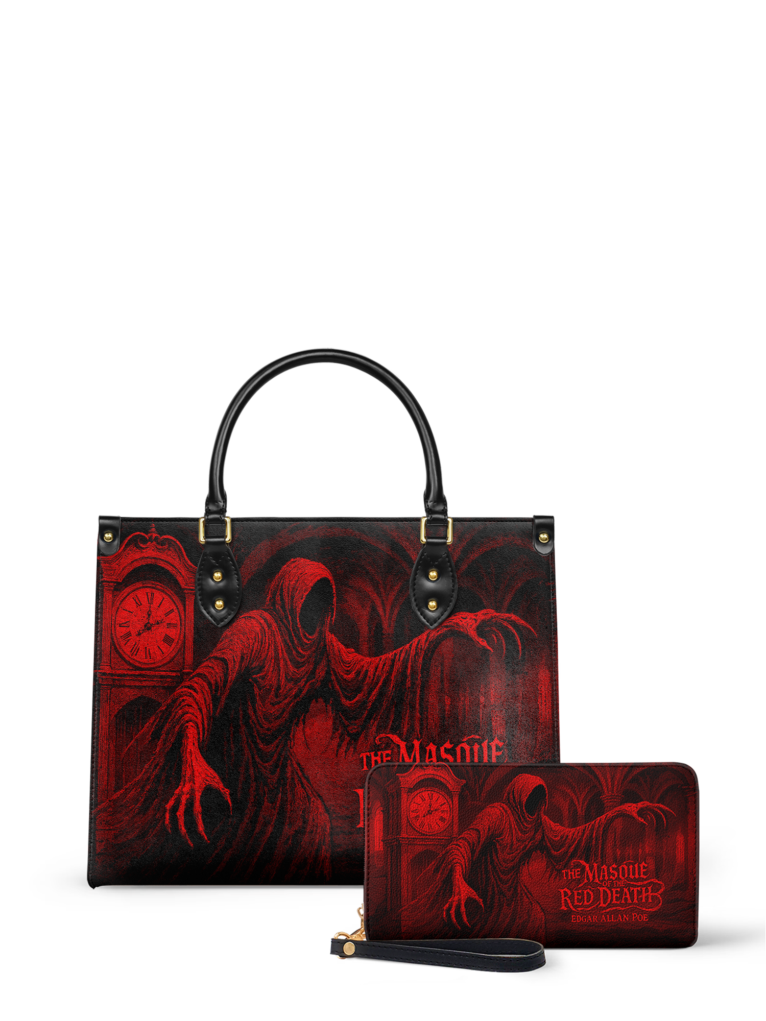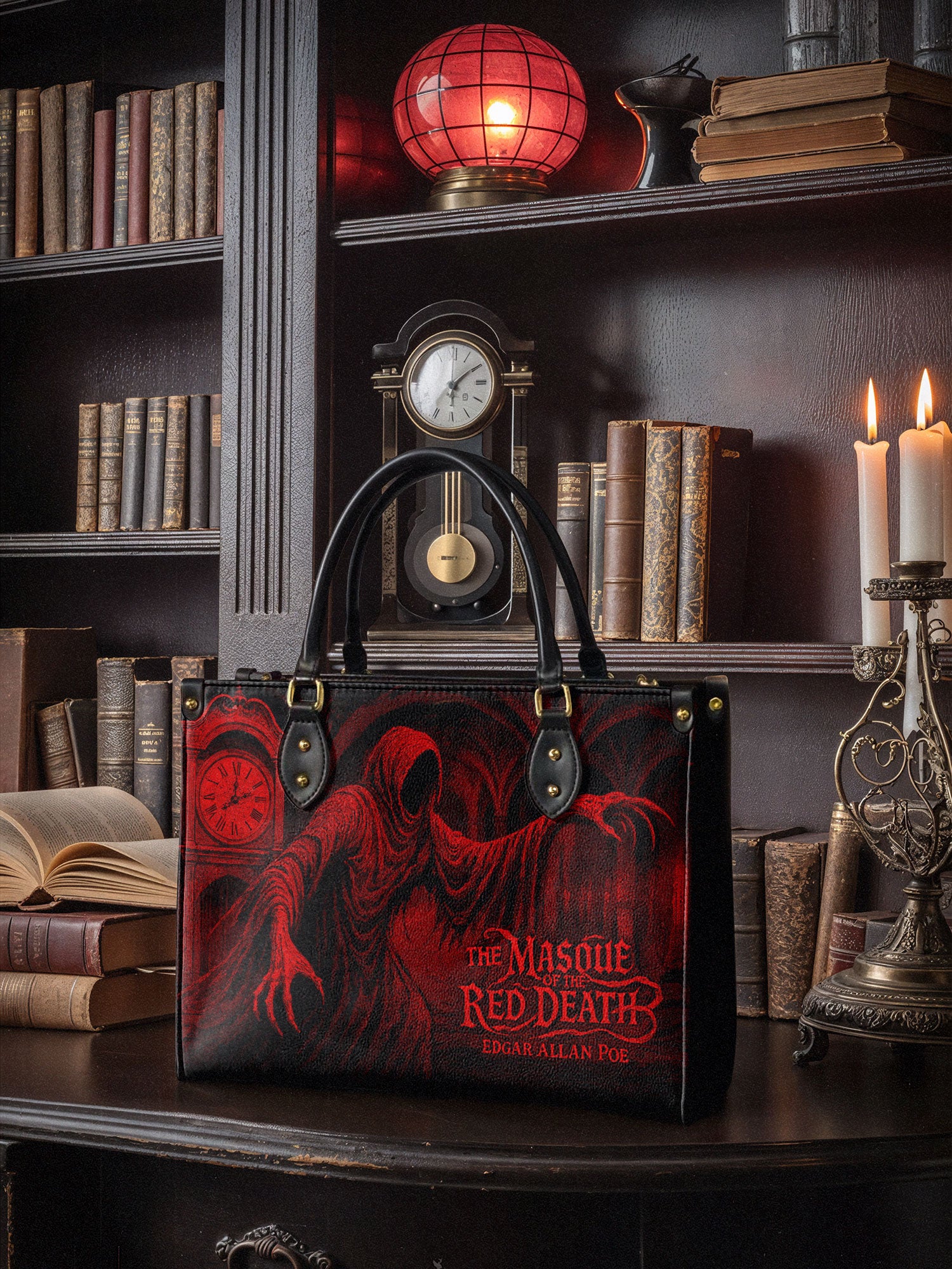This bag doesn’t whisper—it haunts. Inspired by Poe’s The Masque of the Red Death, it's a tribute to the eerie grandeur of that final, fatal masquerade. Blood-red tones, a looming clock, and the spectral figure of doom remind us that no fortress is immune to fate. For those who revel in gothic beauty and timeless tales of terror, this handbag is your invitation to dance—before the clock strikes midnight.