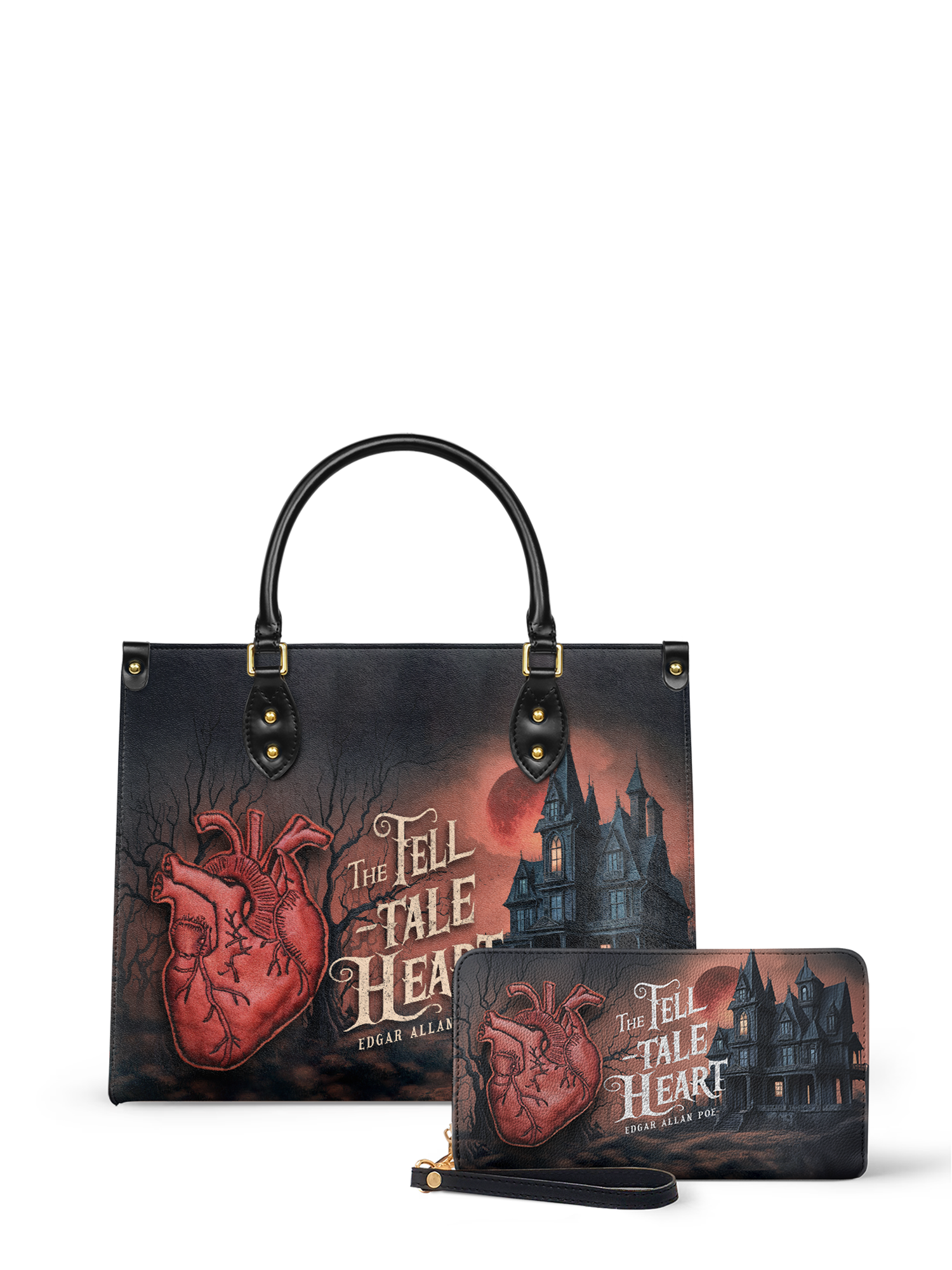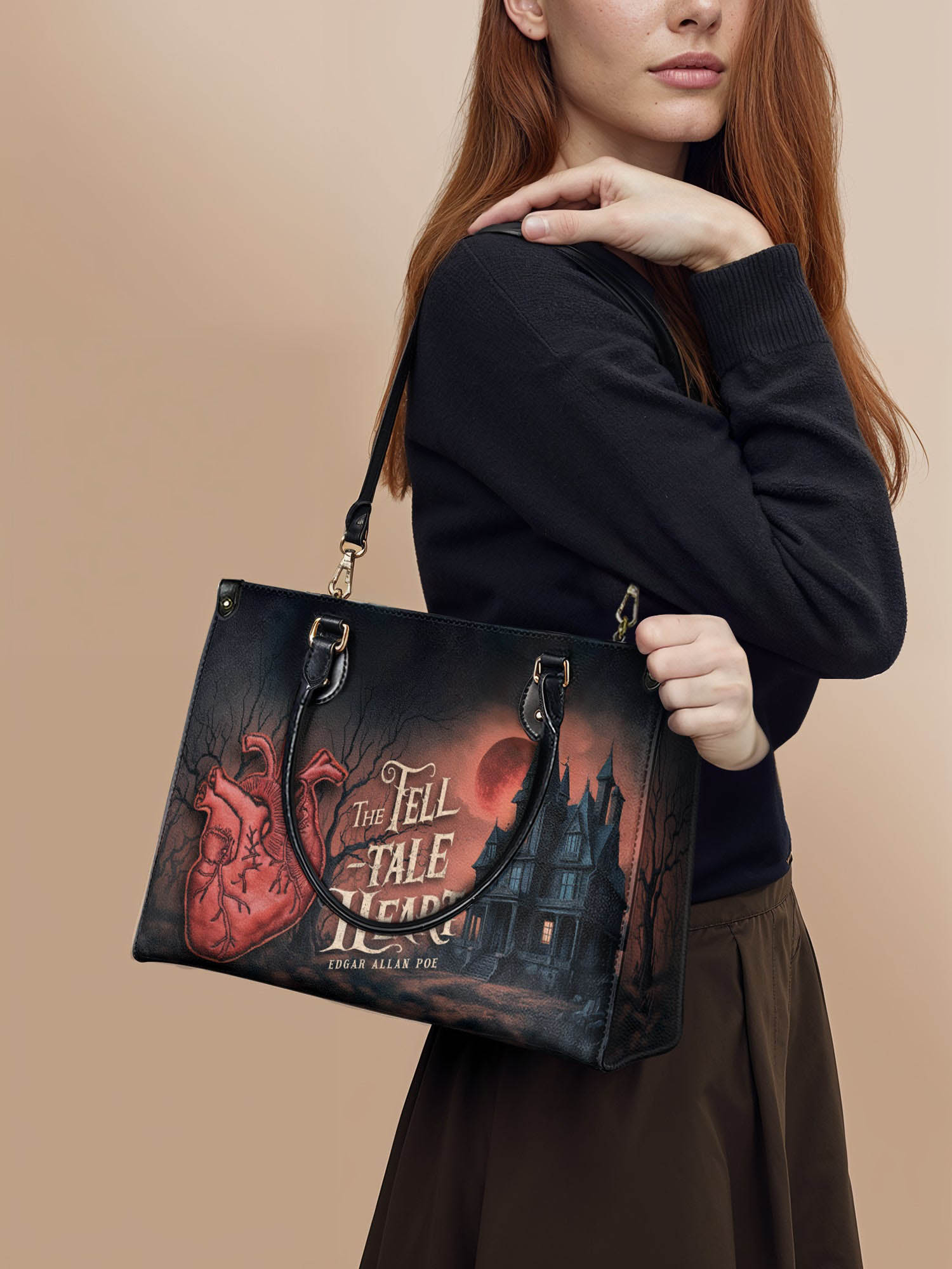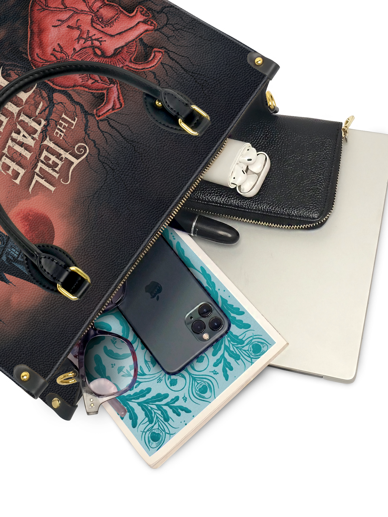 This The Tell-Tale Heart Leather Handbag is dark, eerie, and impossible to ignore. The chilling design features a beating heart, a haunted house, and a blood-red moon—straight from Poe’s twisted tale. It’s haunting, dramatic, and full of gothic mystery. Made from high-quality leather with black handles and gold accents, this bag is perfect for book lovers, horror fans, and anyone drawn to the macabre. Can you hear it? The heart still beats…