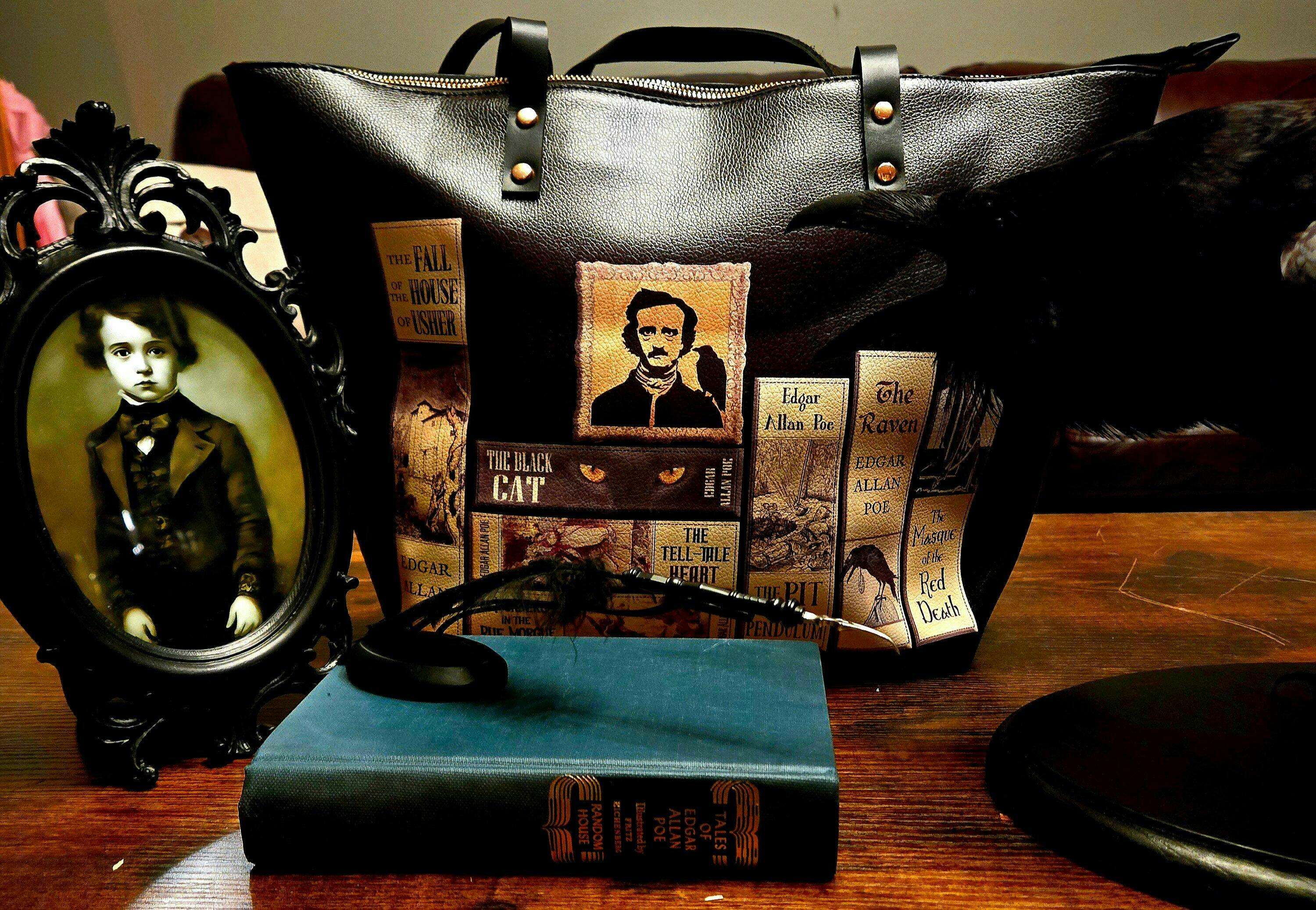 Subtle stitching mimics aged binding, and a hidden interior quote – "All that we see or seem is but a dream within a dream" – winks from the lining like a secret pact with the macabre.