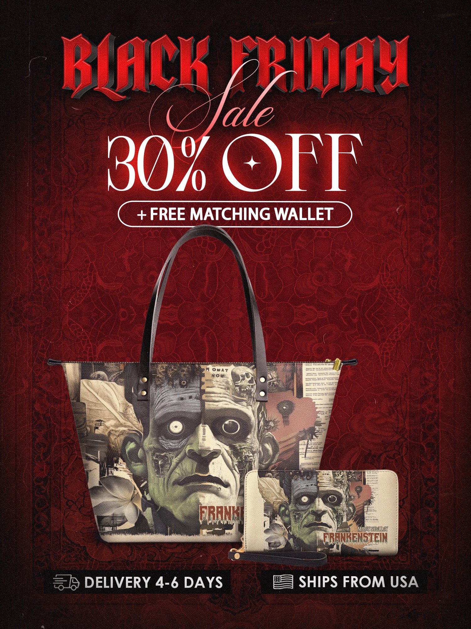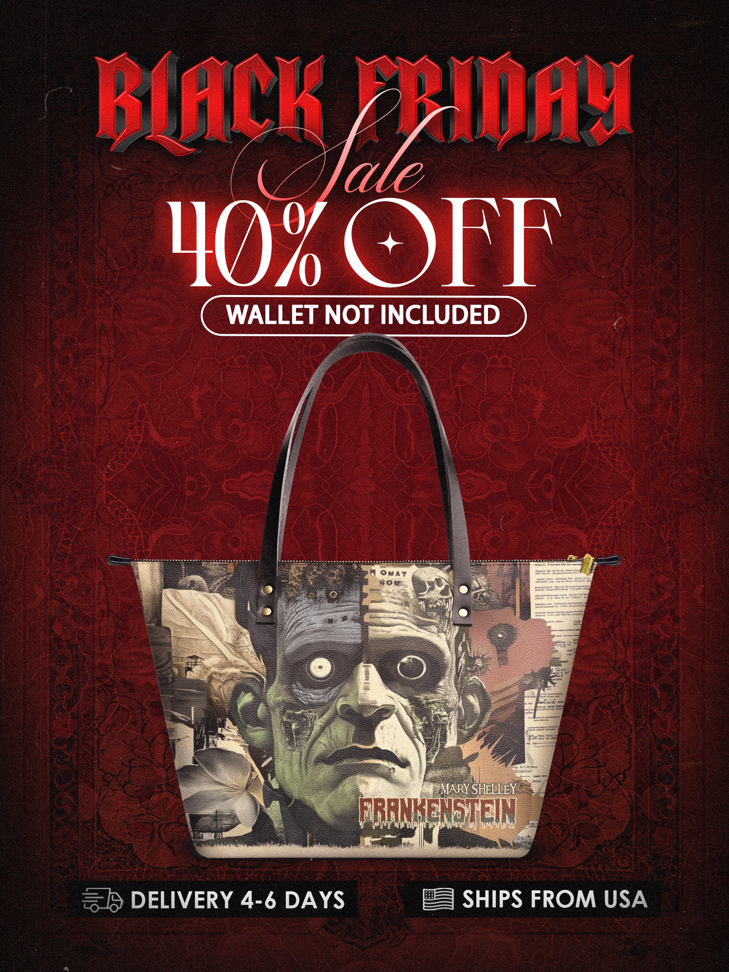 This Frankenstein Leather Tote is bold, eerie, and full of gothic charm. The haunting design features a stitched-together collage of Frankenstein’s monster, layered with vintage textures, scientific sketches, and a chilling color palette. It’s dark, dramatic, and impossible to ignore. Made from high-quality leather with sleek black handles and gold accents, this tote is perfect for book lovers, horror fans, and anyone who sees the beauty in the misunderstood. A little madness, a little genius—carry the legend with you.