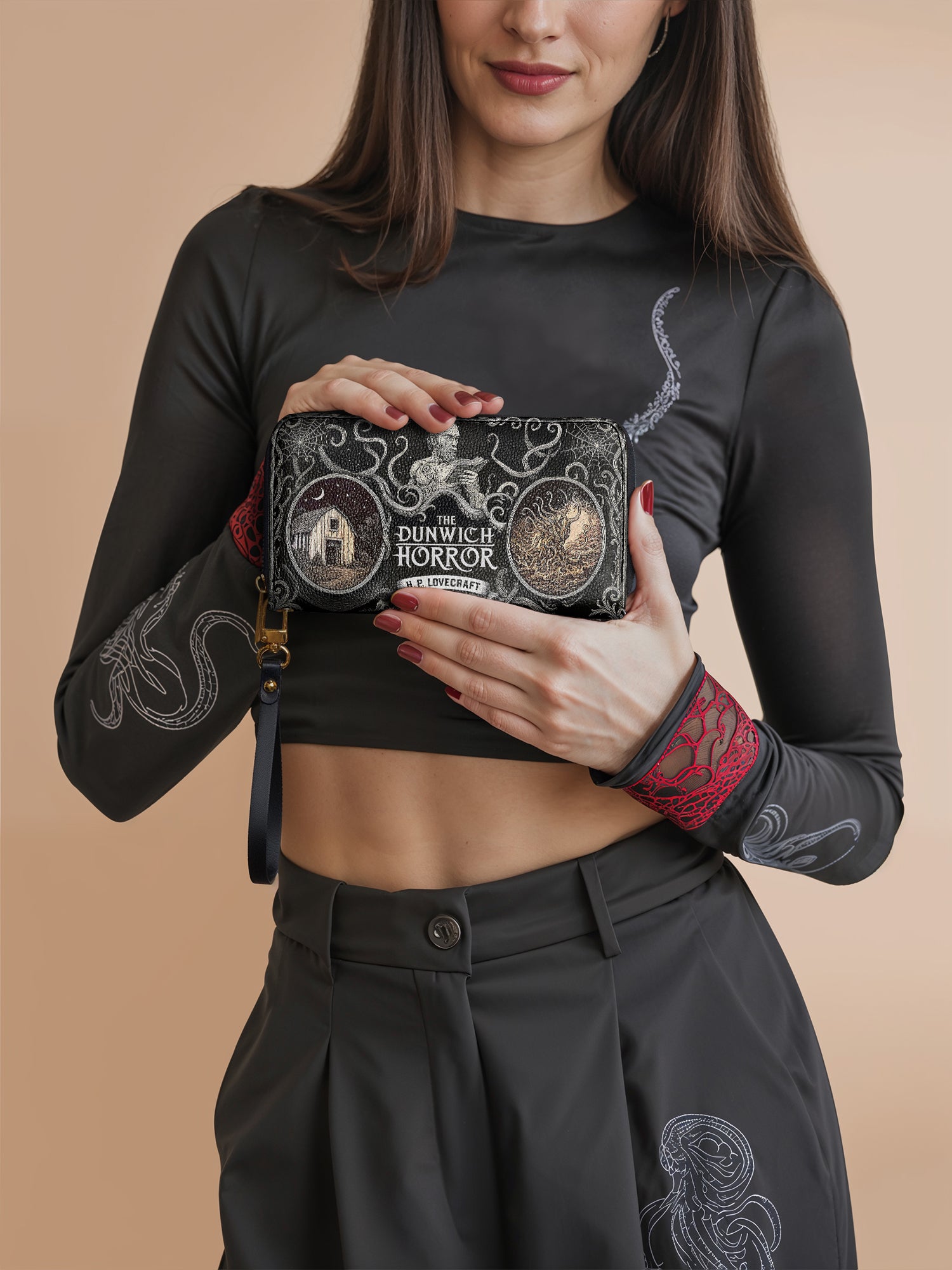 Omg! I love this wallet! I got the Codex of Gothic Tales with the cobwebs. I'm so excited I can't think of the actual title. Please forgive me. It's more stunning in person than on the website. I am saving up for the purse now. I highly recommend this site and products. Absolutely stunning wallet.