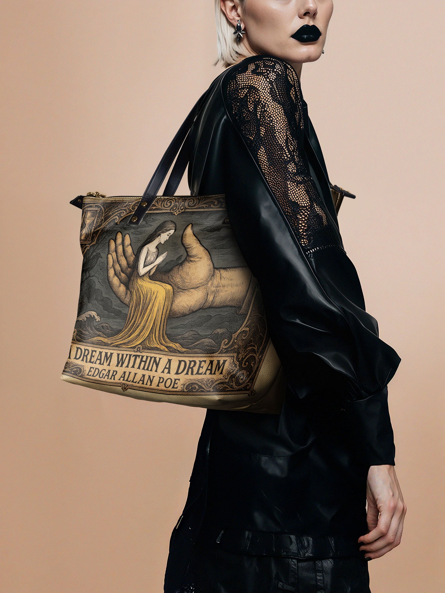 This tote is the chameleon of the crypt: sling it over a wool cape for windswept walks reciting Annabel Lee, or pair it with tailored blacks for a midnight masquerade.