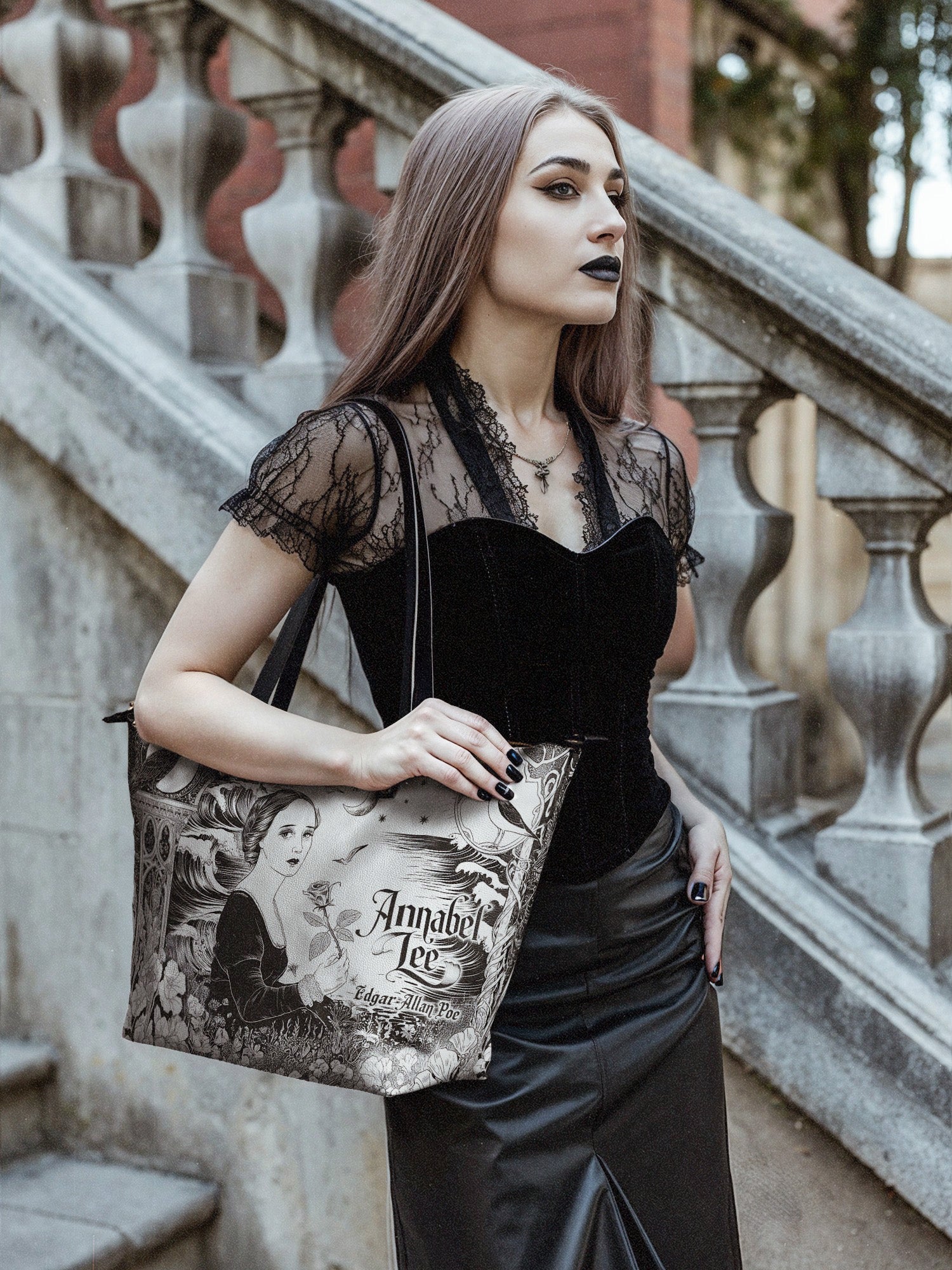 This tote is the chameleon of the crypt: sling it over a wool cape for windswept walks reciting Annabel Lee, or pair it with tailored blacks for a midnight masquerade.