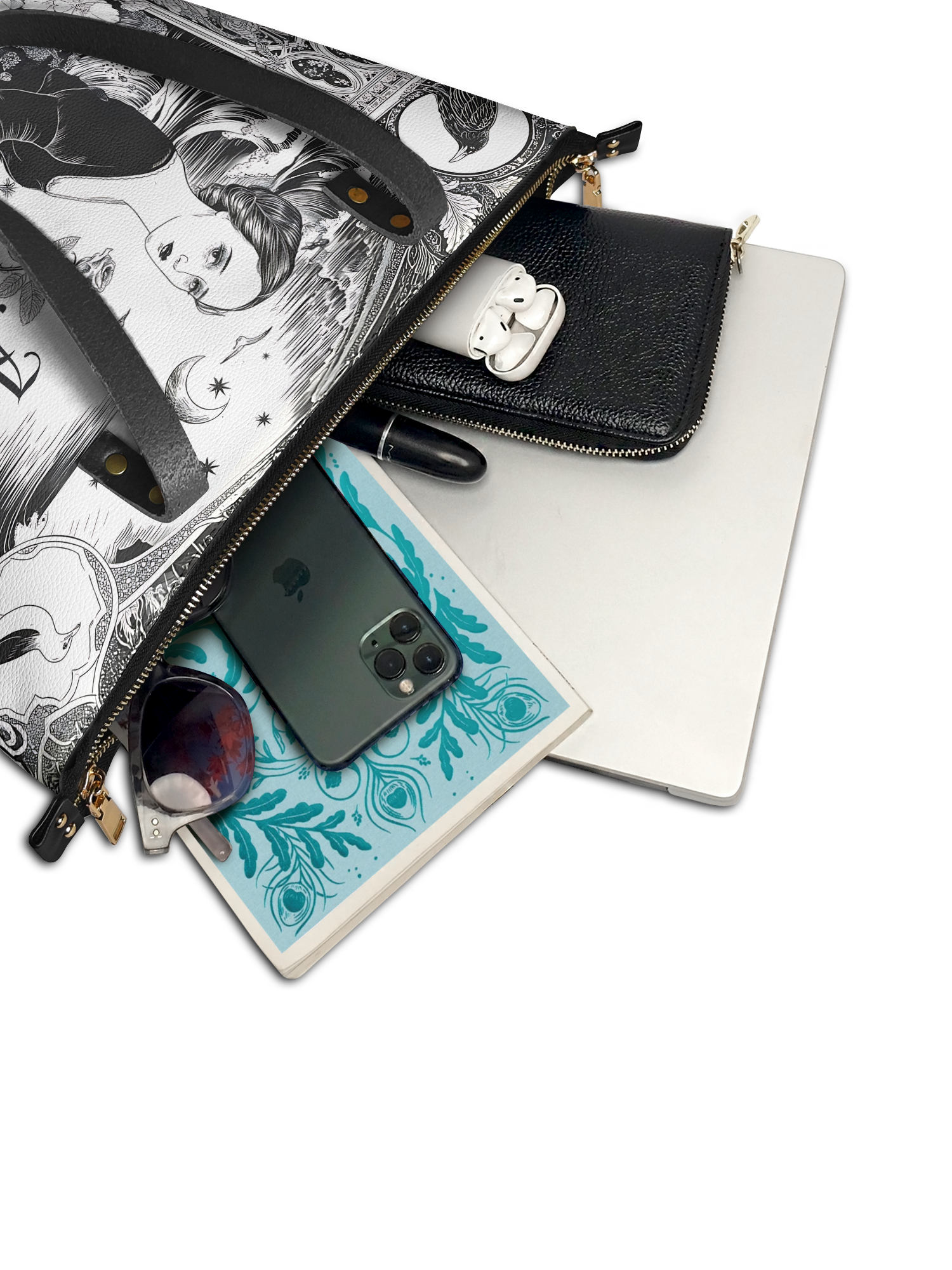 Handcrafted in the United States, this Premium Vegan Leather tote transforms mundane errands into a procession through the House of Usher.
