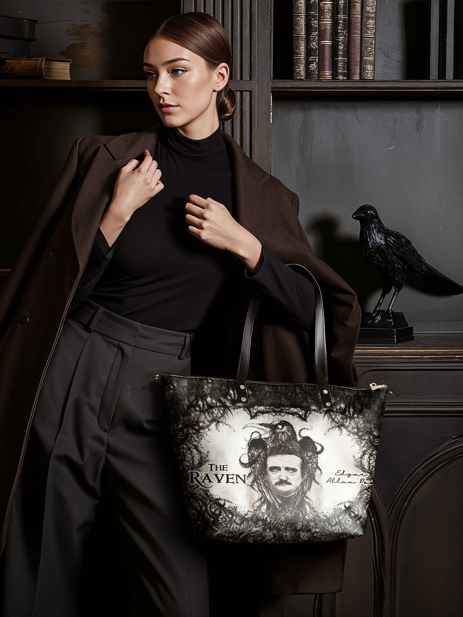 This tote is the chameleon of the crypt: sling it over a wool cape for windswept walks reciting Annabel Lee, or pair it with tailored blacks for a midnight masquerade.