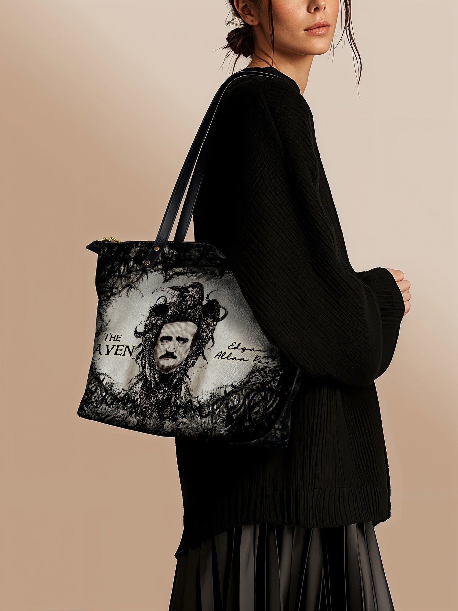This The Raven Leather Tote is hauntingly beautiful, perfect for lovers of gothic literature and dark poetry. The eerie design features Edgar Allan Poe with the iconic raven perched above, surrounded by twisted branches and a shadowy, mysterious atmosphere. It’s bold, moody, and dripping with literary charm. Made from high-quality leather with sleek black handles and gold accents, this tote is perfect for book lovers, poets, and anyone who adores the macabre. Quoth the raven, “Nevermore”—but you’ll want to carry this bag forever.