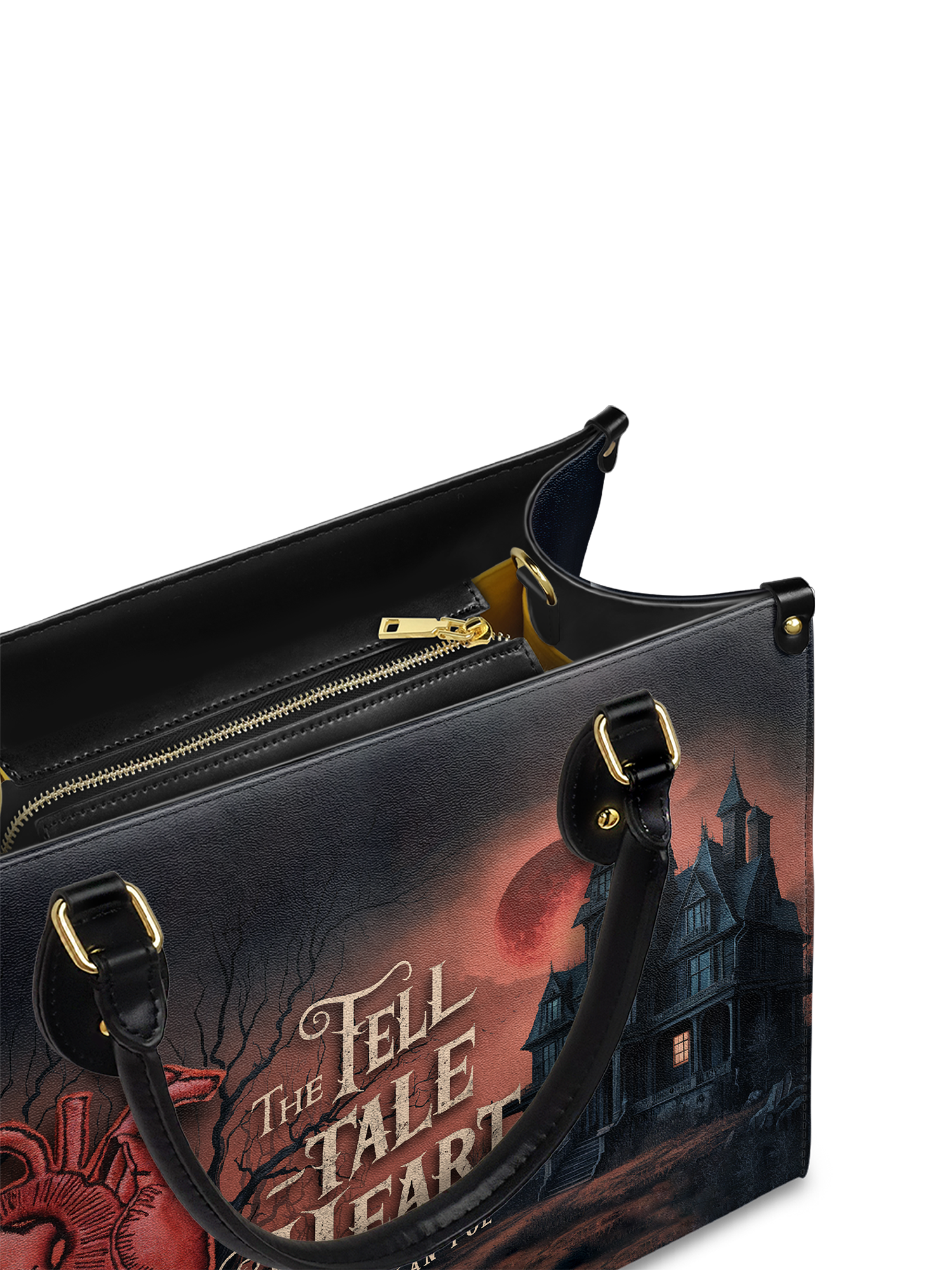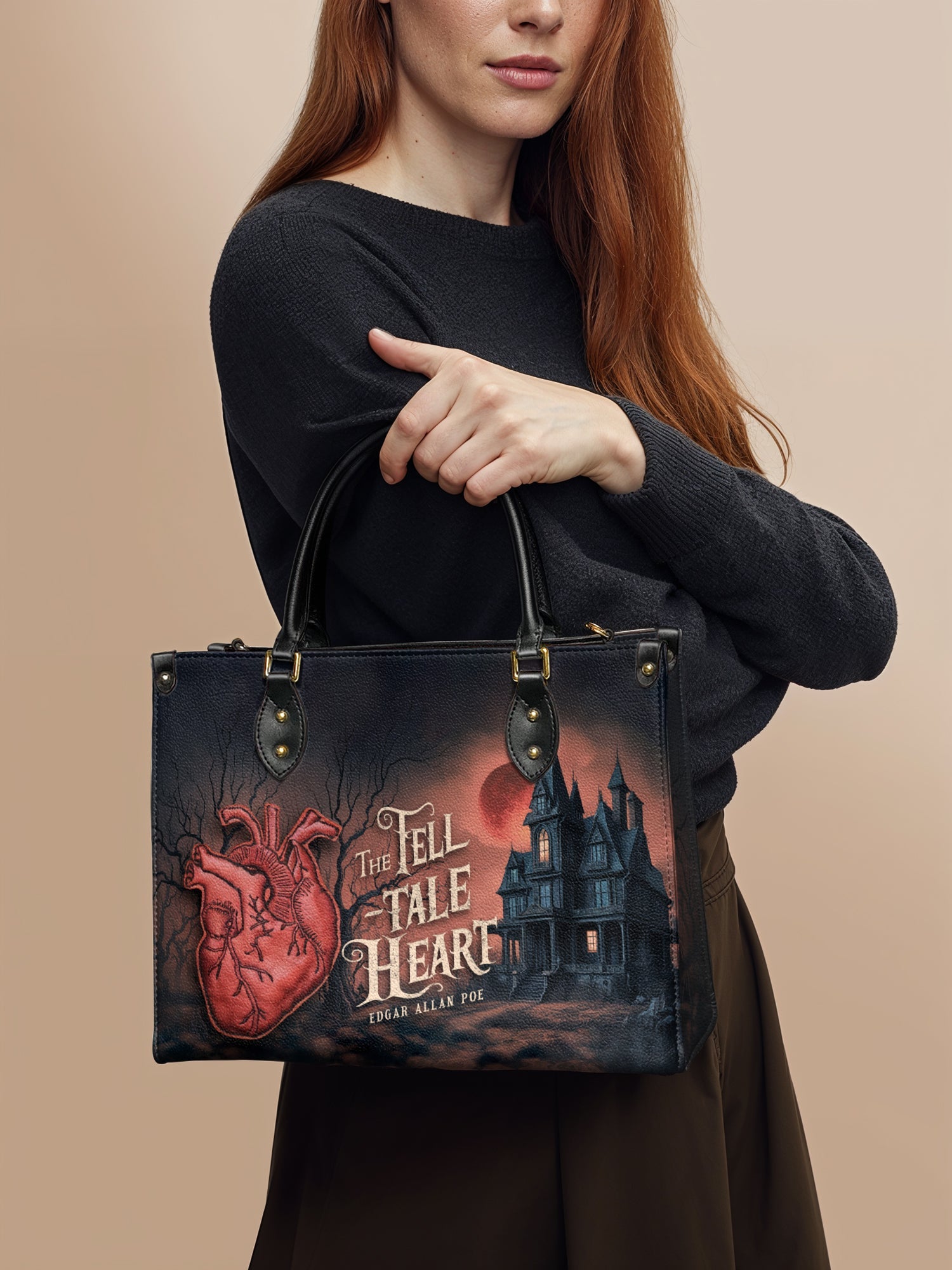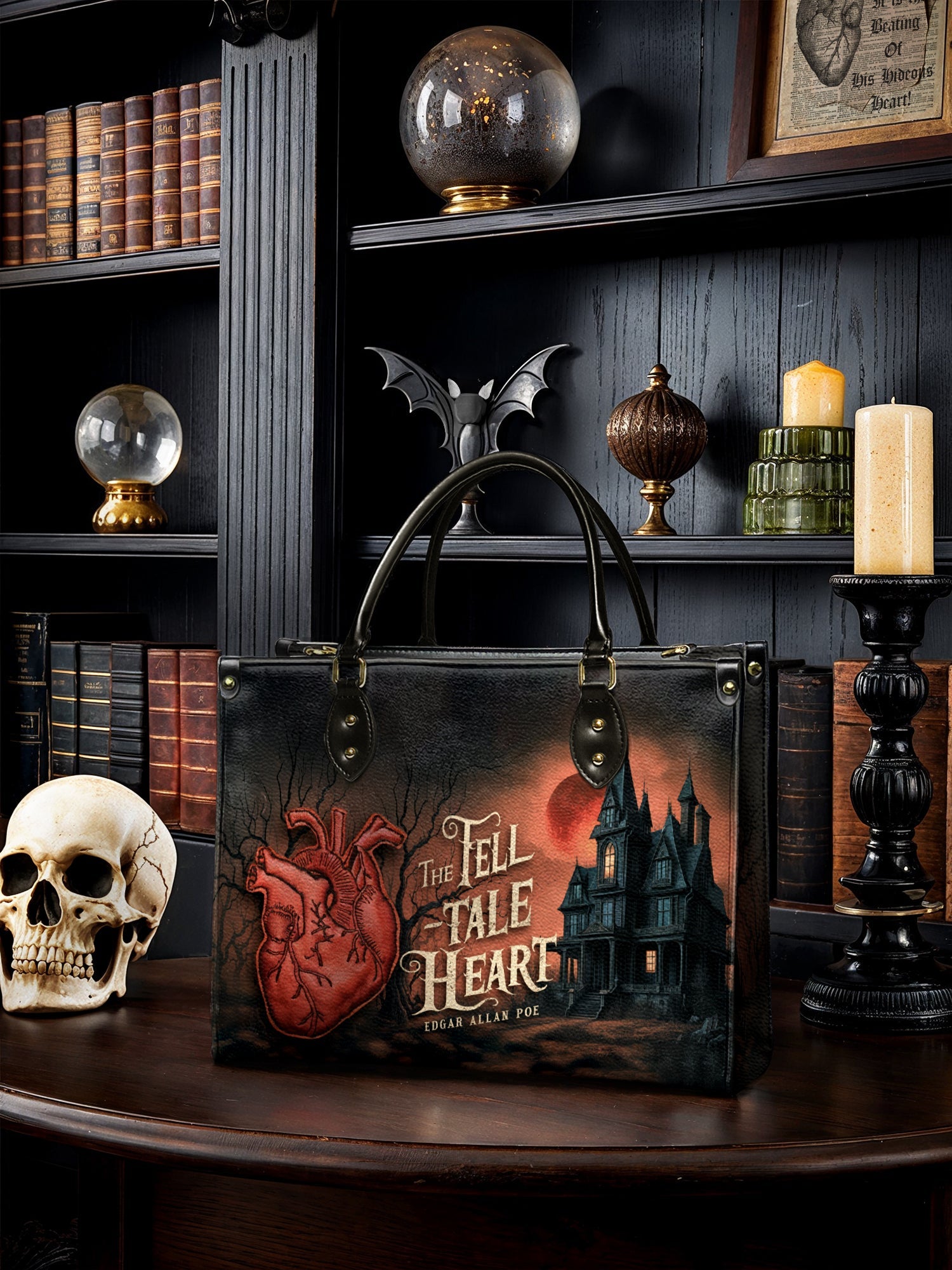 This The Tell-Tale Heart Leather Handbag is dark, eerie, and impossible to ignore. The chilling design features a beating heart, a haunted house, and a blood-red moon—straight from Poe’s twisted tale. It’s haunting, dramatic, and full of gothic mystery. Made from high-quality leather with black handles and gold accents, this bag is perfect for book lovers, horror fans, and anyone drawn to the macabre. Can you hear it? The heart still beats…