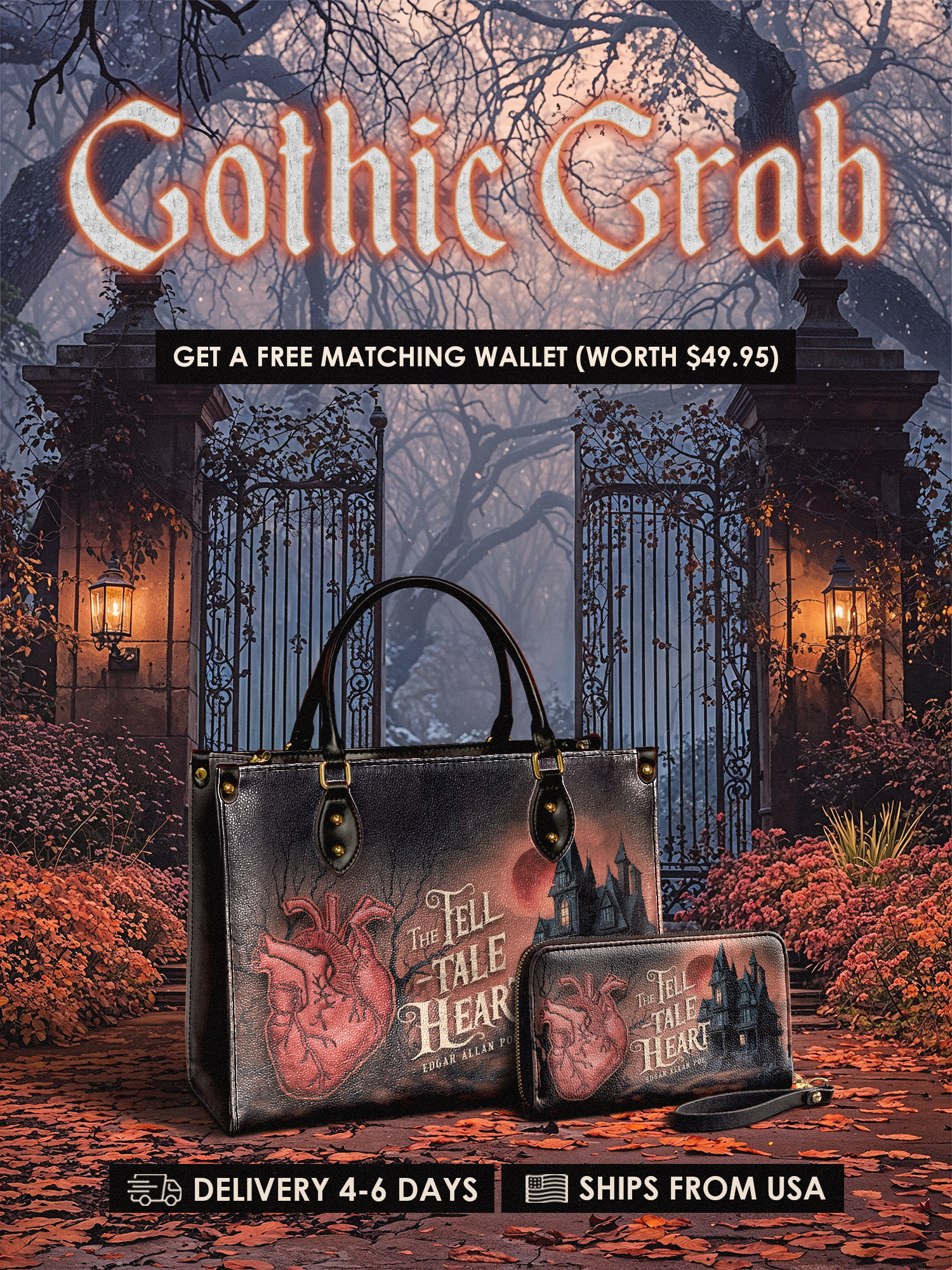 This The Tell-Tale Heart Leather Handbag is dark, eerie, and impossible to ignore. The chilling design features a beating heart, a haunted house, and a blood-red moon—straight from Poe’s twisted tale. It’s haunting, dramatic, and full of gothic mystery. Made from high-quality leather with black handles and gold accents, this bag is perfect for book lovers, horror fans, and anyone drawn to the macabre. Can you hear it? The heart still beats…