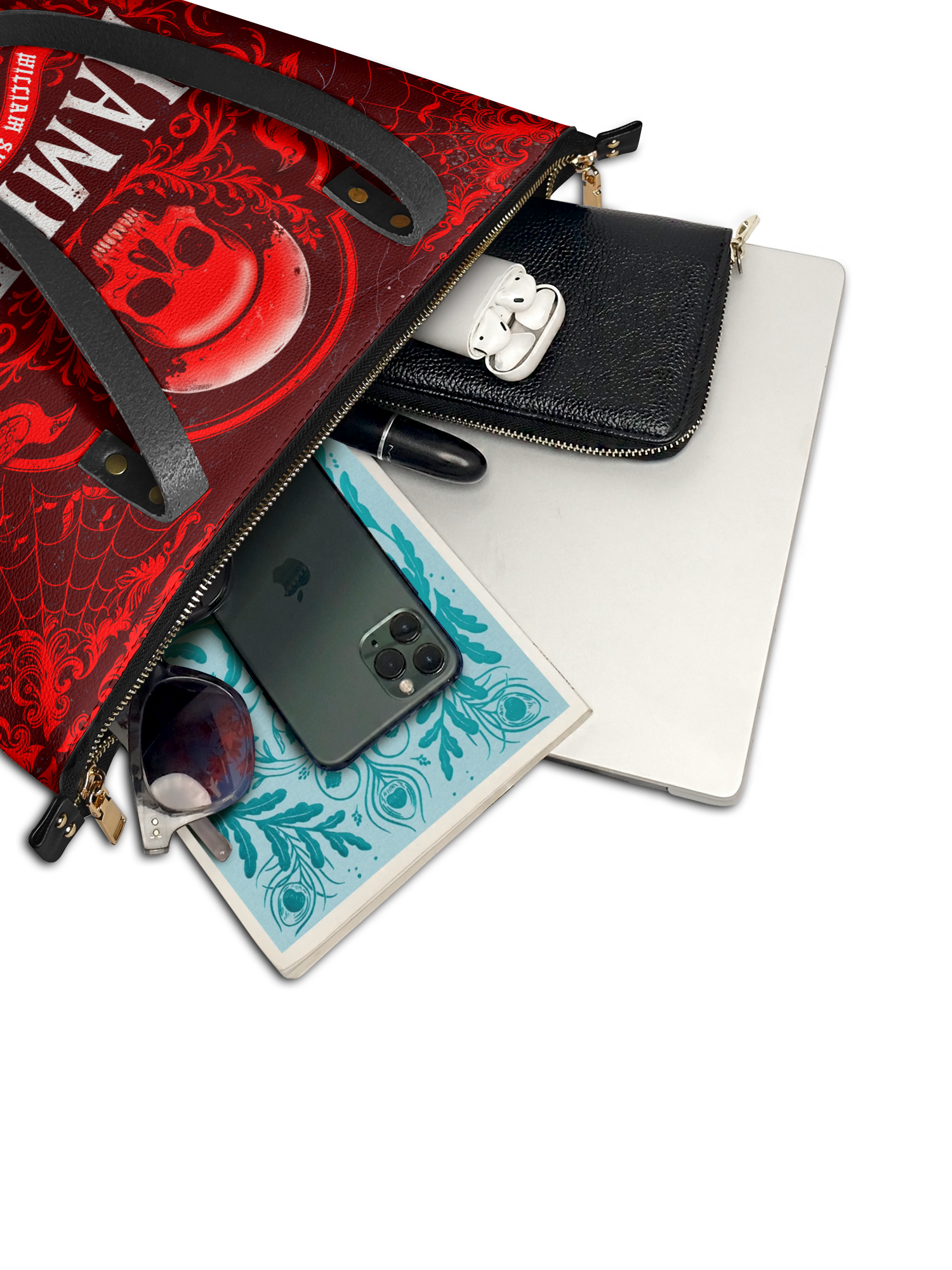 Handcrafted in the United States, this Premium Vegan Leather tote transforms mundane errands into a procession through the House of Usher.