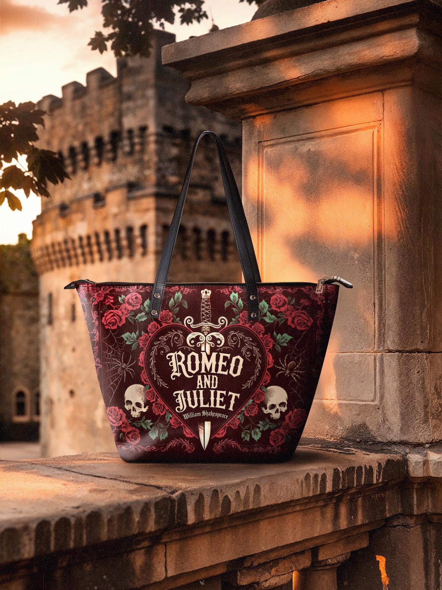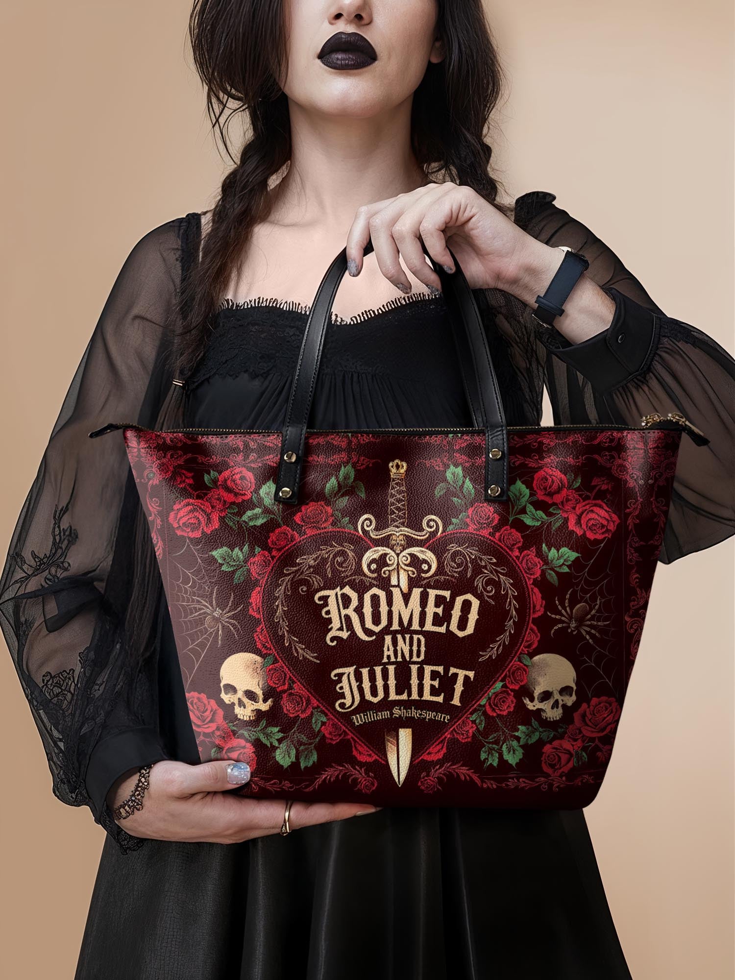 This tote is the chameleon of the crypt: sling it over a wool cape for windswept walks reciting Annabel Lee, or pair it with tailored blacks for a midnight masquerade.