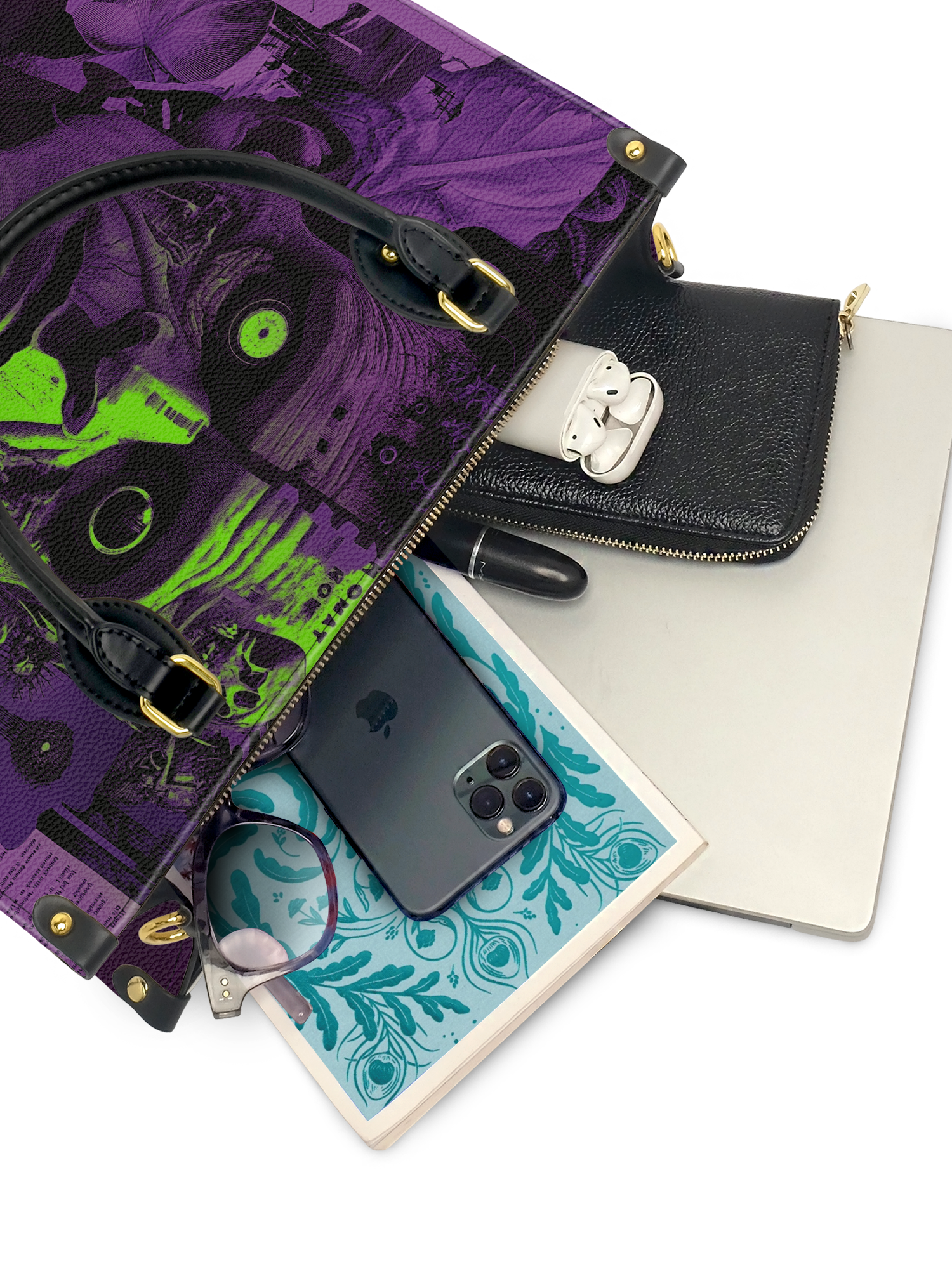 The Purple Frankenstein handbag is pure gothic drama—loud, electric, and unforgettable. With its bold violet tones and eerie green glow, it reimagines the classic monster in full punk-horror flair. Not for the faint of heart—this one’s made for those who live on the edge of fiction and rebellion.