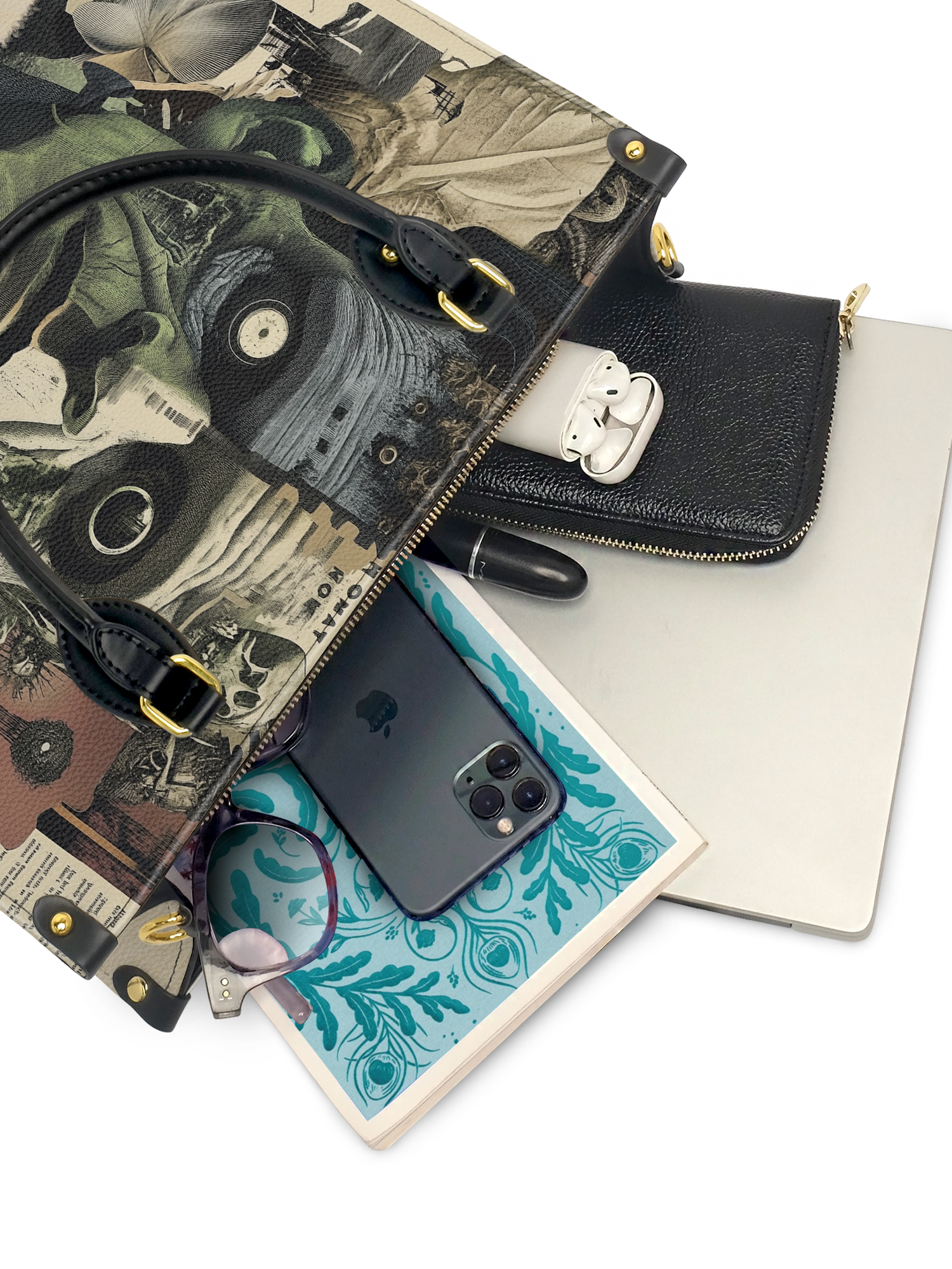 This Frankenstein Leather Handbag is bold, eerie, and full of classic horror vibes. The striking design features a stitched-together collage of the monster’s haunting face, layered with gothic imagery and vintage textures. It’s dark, dramatic, and impossible to ignore. Made from high-quality leather with sturdy black handles and gold details, this bag is perfect for book lovers, horror fans, and anyone who sees the beauty in the misunderstood. A little madness, a little genius—carry the legend with you.