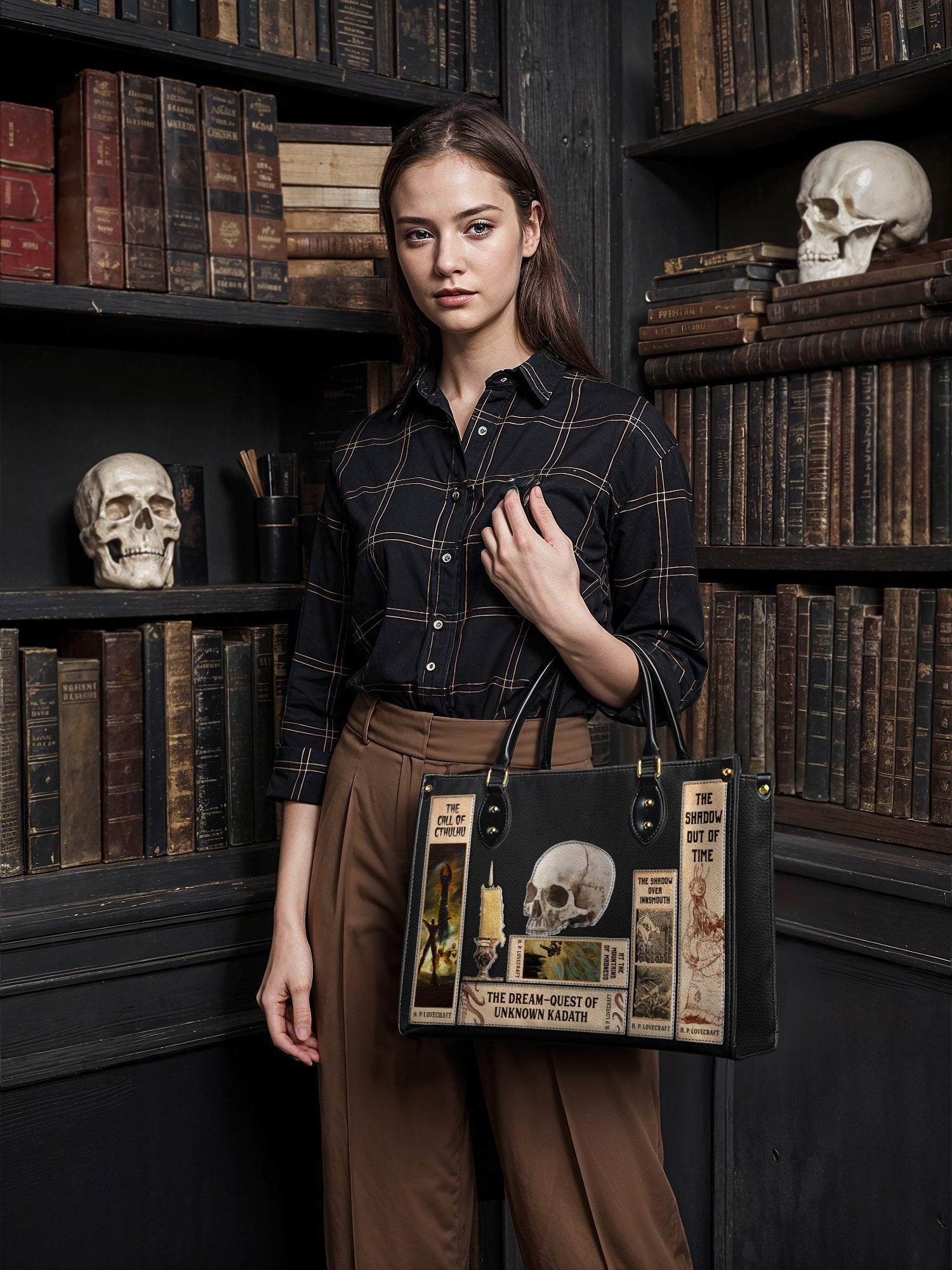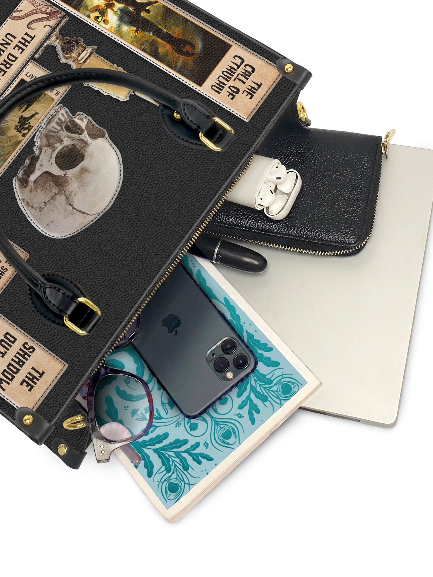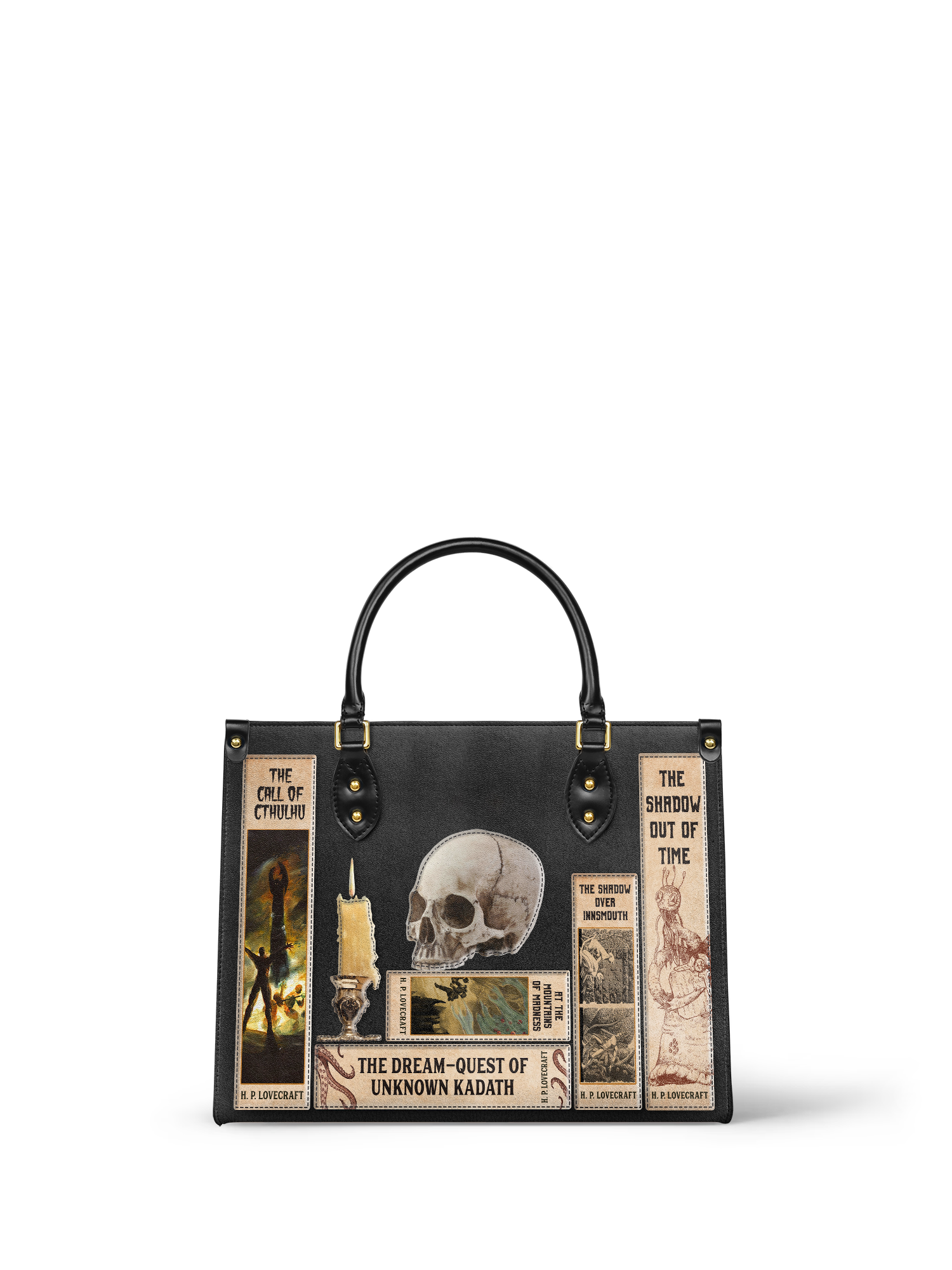 Step into the eerie worlds of H.P. Lovecraft with this Lovecraftian Black Leather Handbag. Featuring The Call of Cthulhu, The Shadow Over Innsmouth, The Dream-Quest of Unknown Kadath, and more, this design is a chilling tribute to his cosmic horror masterpieces. A skull, candle, and vintage book covers set the mood for those who love the strange, the eerie, and the unknown. Carry your love for the mythos wherever you go.