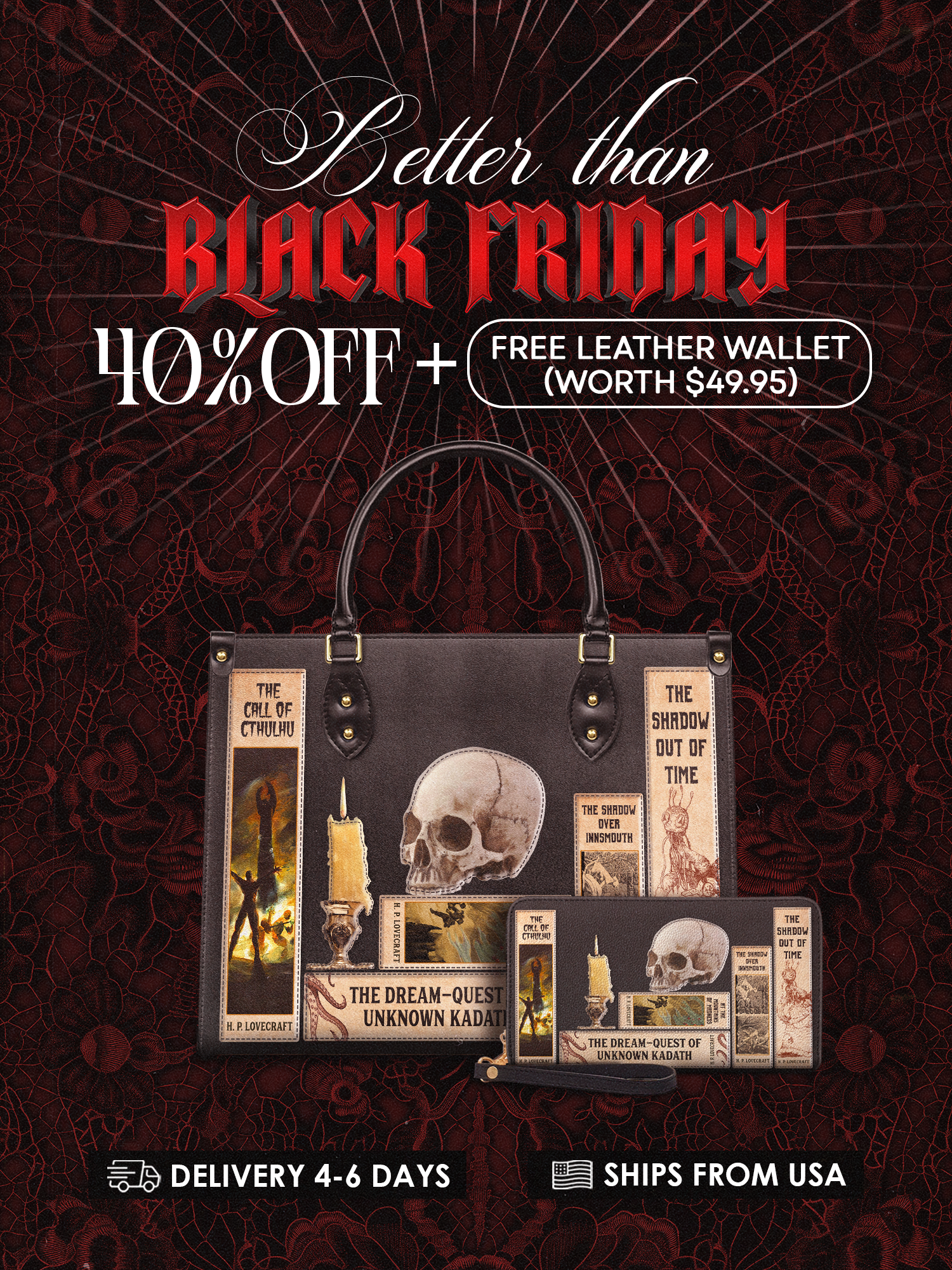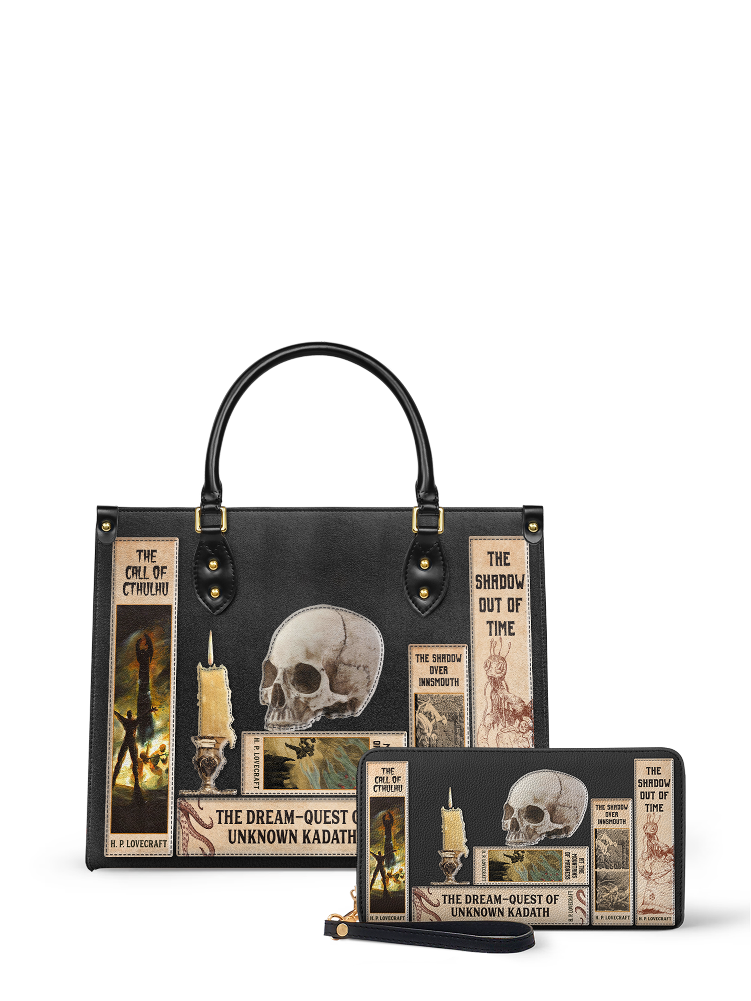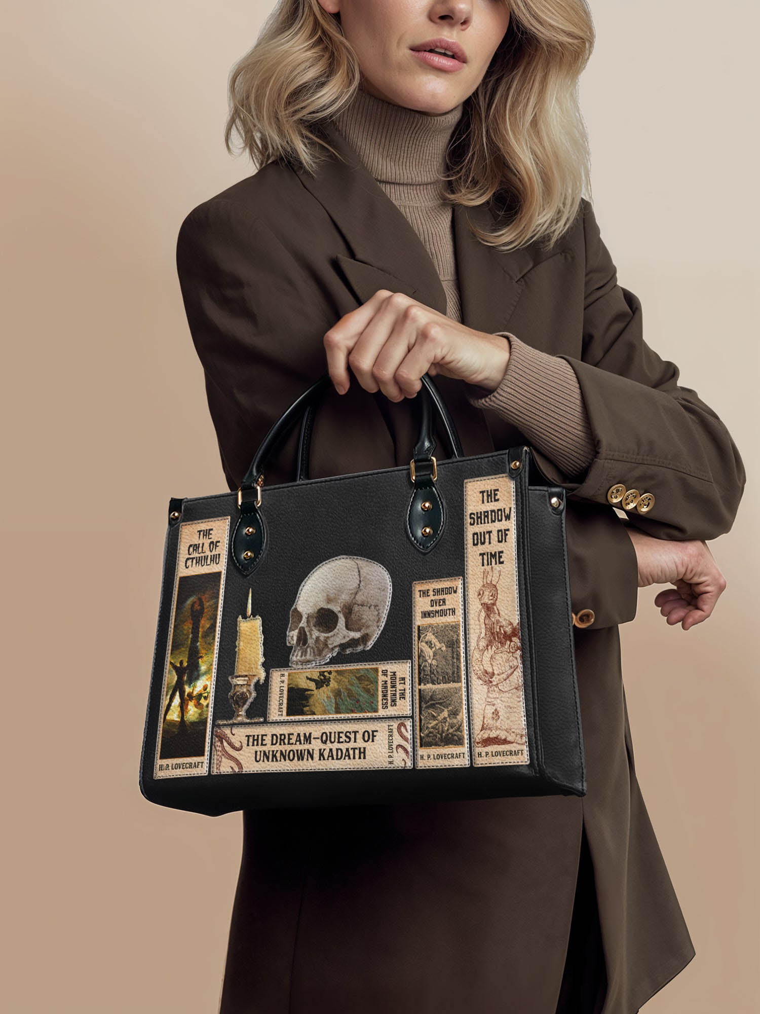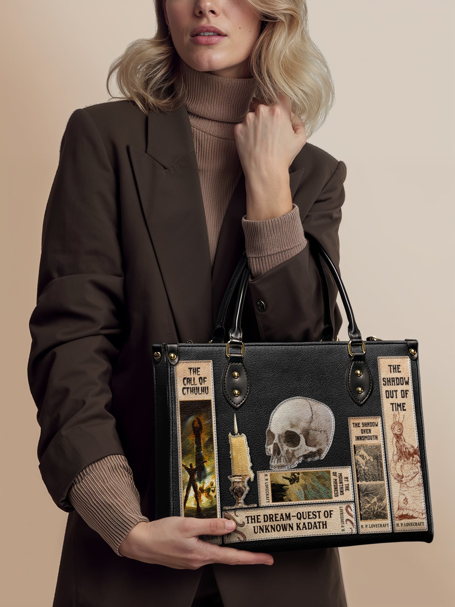 Step into the eerie worlds of H.P. Lovecraft with this Lovecraftian Black Leather Handbag. Featuring The Call of Cthulhu, The Shadow Over Innsmouth, The Dream-Quest of Unknown Kadath, and more, this design is a chilling tribute to his cosmic horror masterpieces. A skull, candle, and vintage book covers set the mood for those who love the strange, the eerie, and the unknown. Carry your love for the mythos wherever you go.