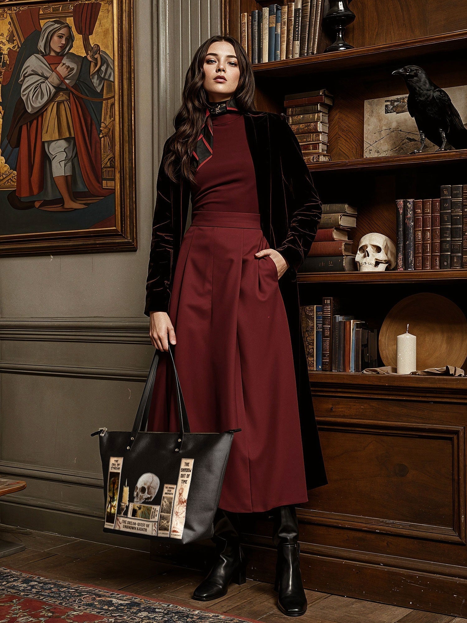 This tote is the chameleon of the crypt: sling it over a wool cape for windswept walks reciting Annabel Lee, or pair it with tailored blacks for a midnight masquerade.