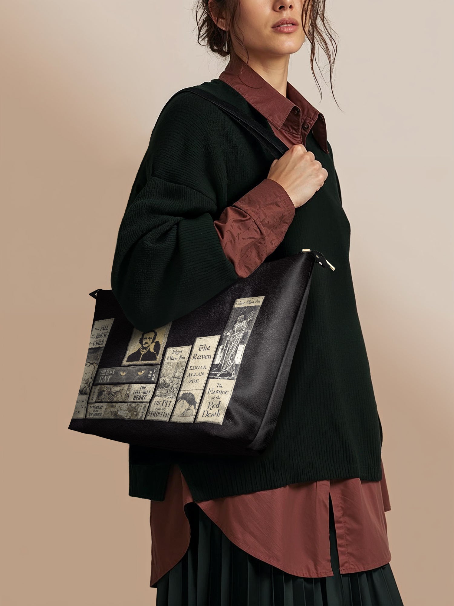 This Poe’s Library Black Leather Tote Bag is a must-have for lovers of mystery, macabre, and classic literature. Featuring vintage-style book covers and eerie illustrations from Edgar Allan Poe’s most chilling tales, it’s the perfect mix of dark and sophisticated. Whether you’re a fan of The Raven, The Black Cat, or The Tell-Tale Heart, this tote lets you carry your favorite gothic stories in style. Soft, durable, and delightfully haunting—this is for the bookworms who love a little darkness in their day.